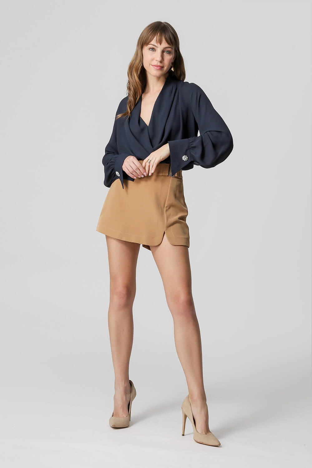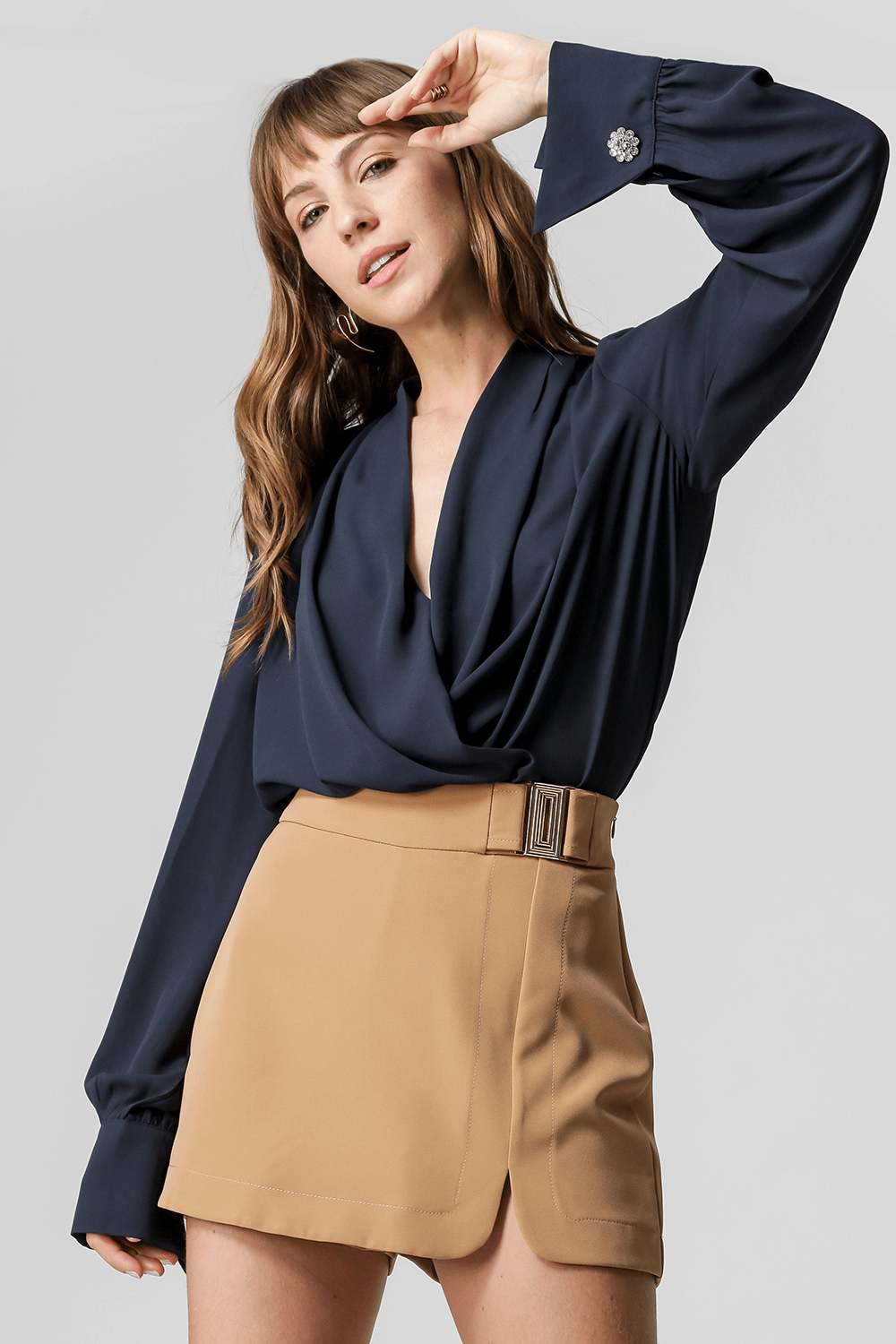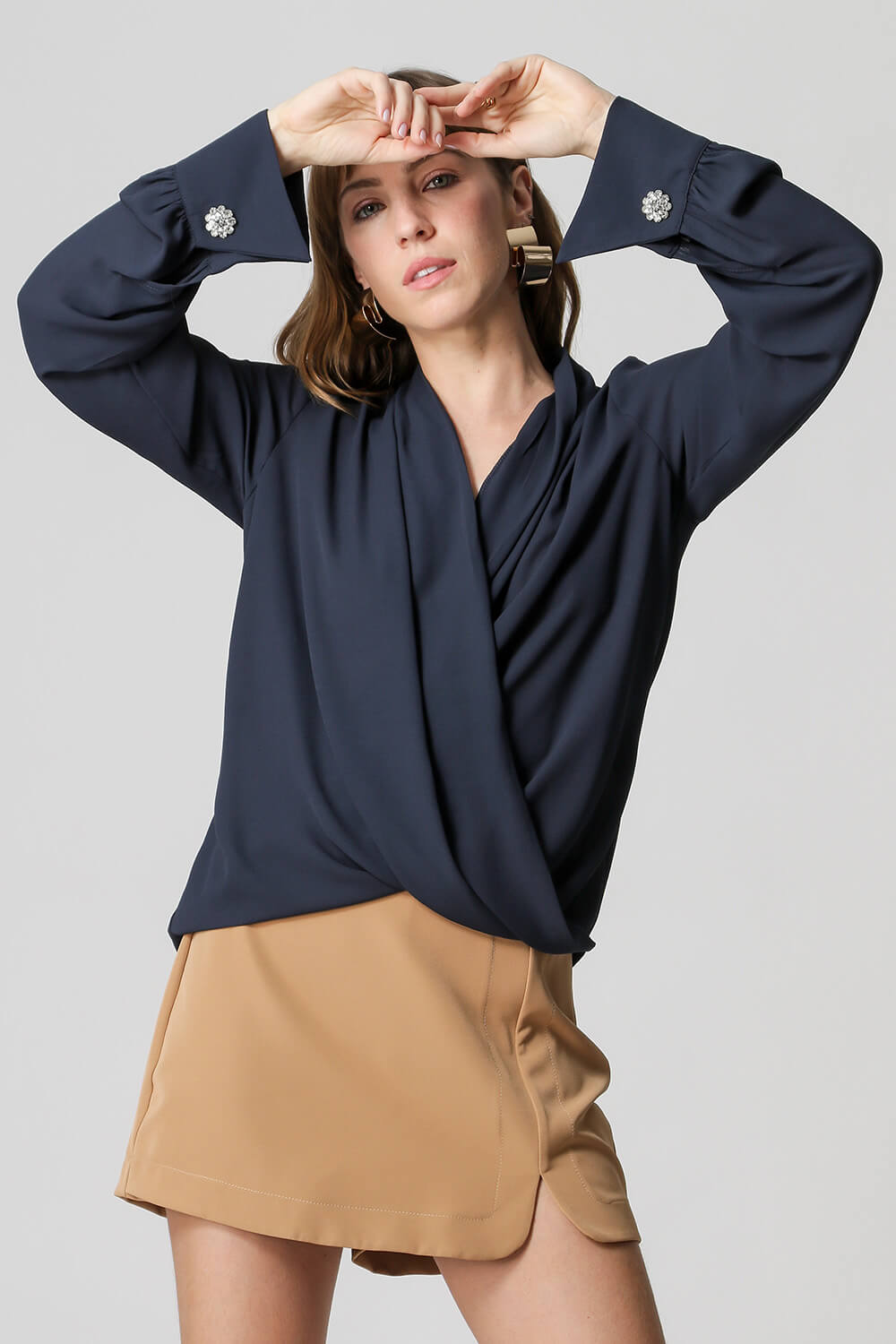 Blusa de manga larga con distintivo botón de pedrería, diseño estilo bufanda confeccionada en crepe fluido. Una pieza clásica y atemporal para un look elegante.