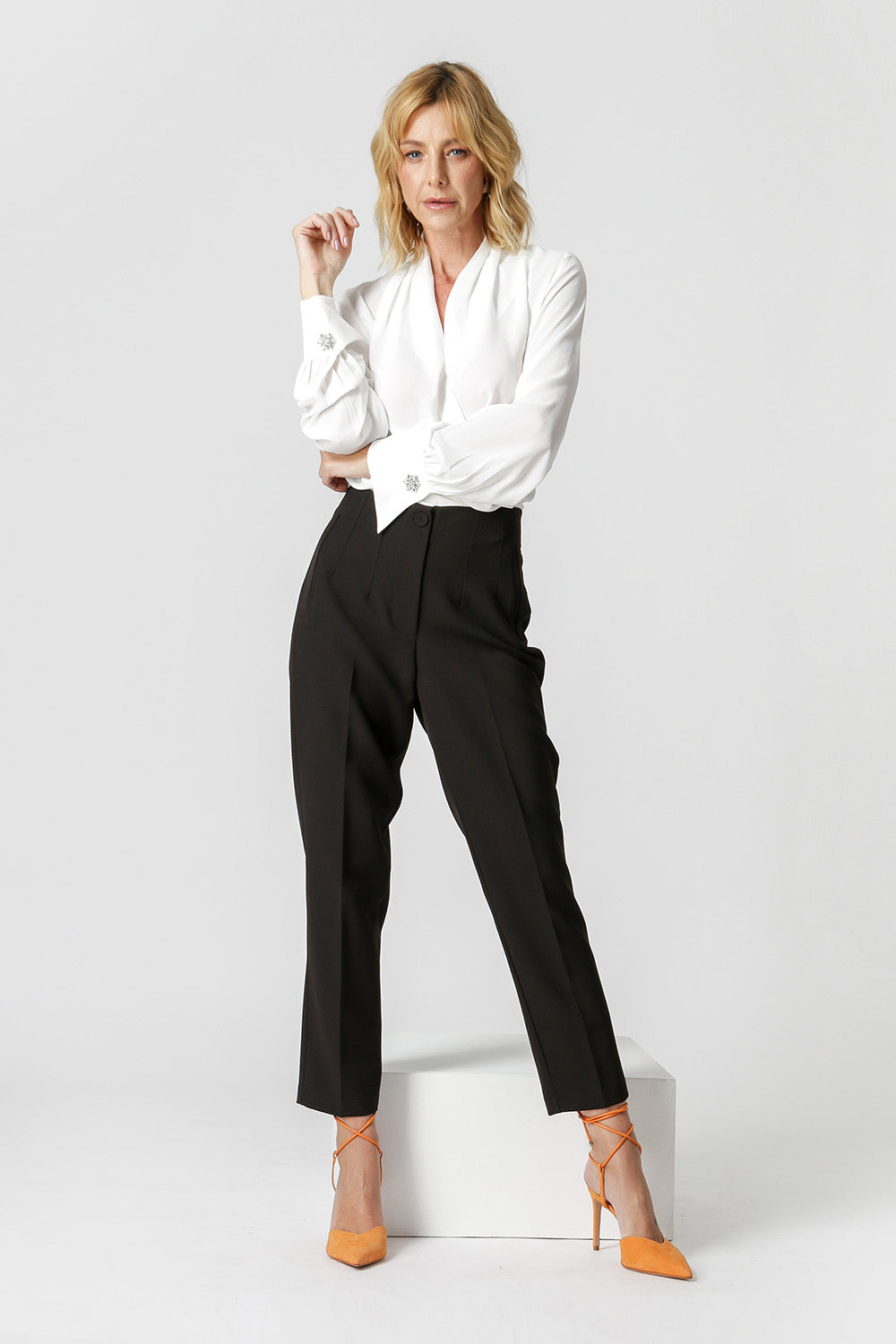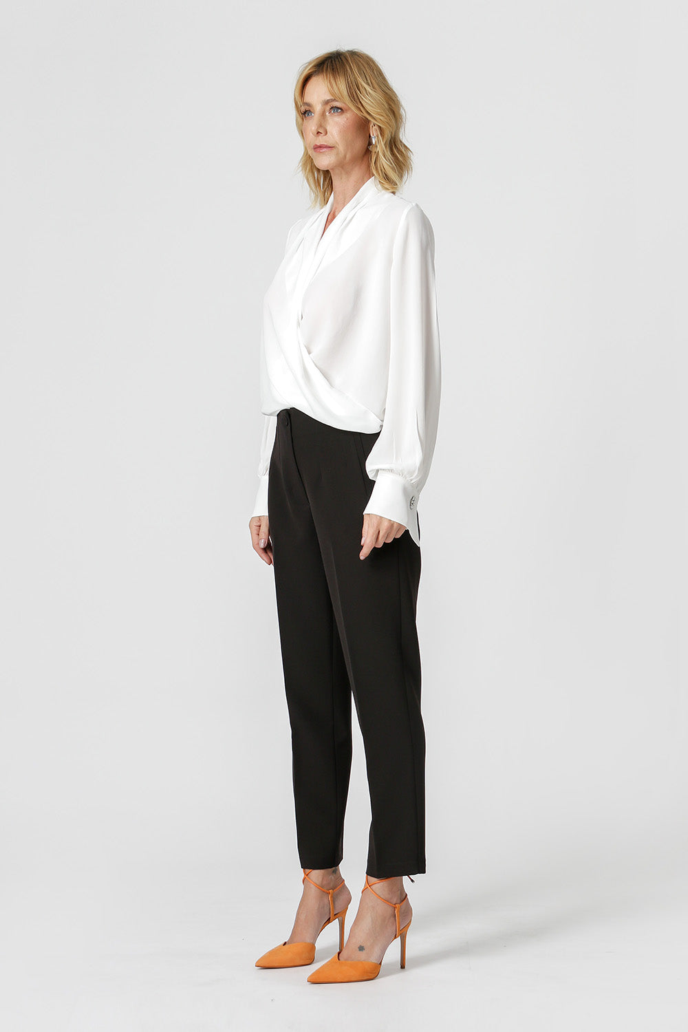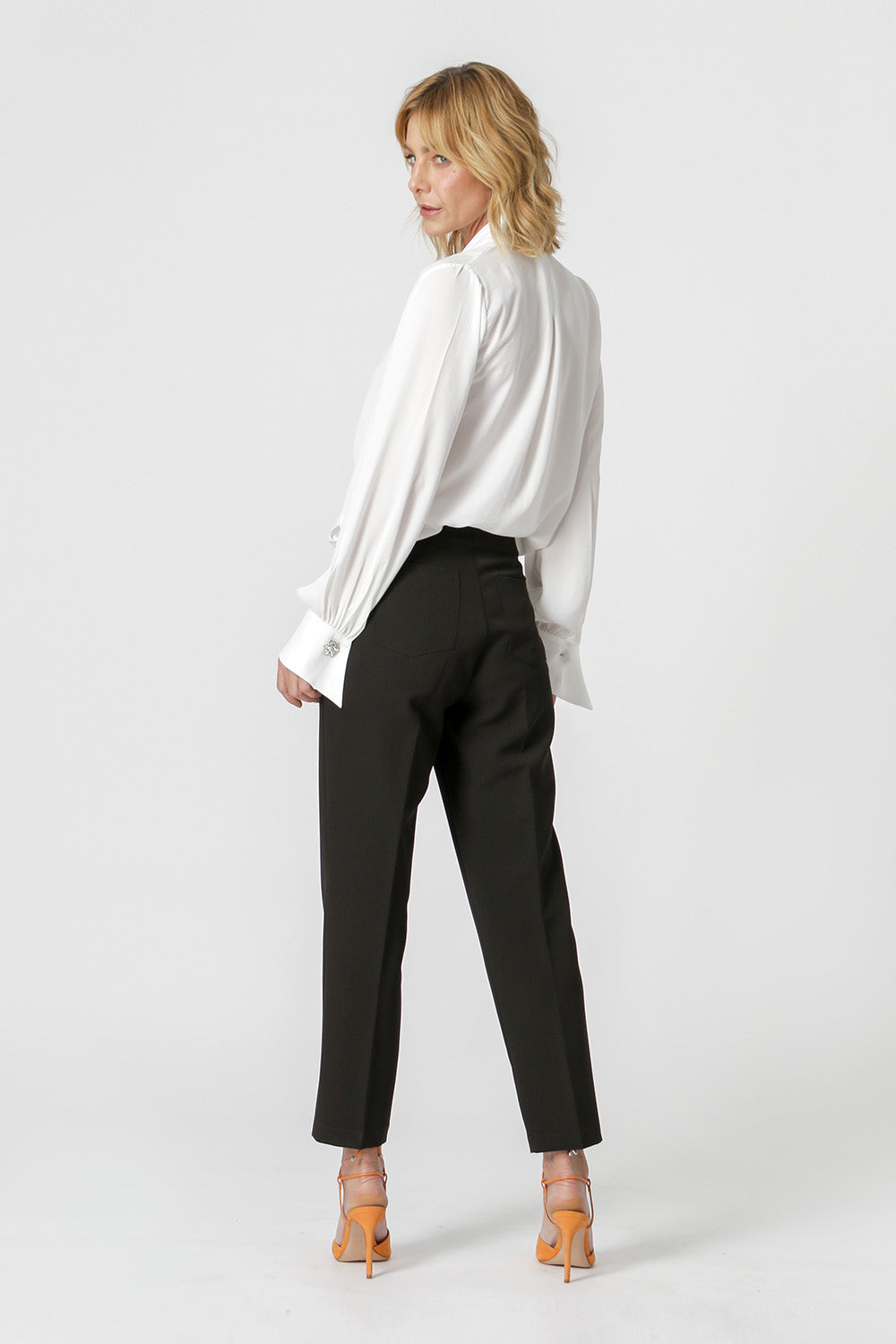 Blusa de manga larga con distintivo botón de pedrería, diseño estilo bufanda confeccionada en crepe fluido. Una pieza clásica y atemporal para un look elegante.