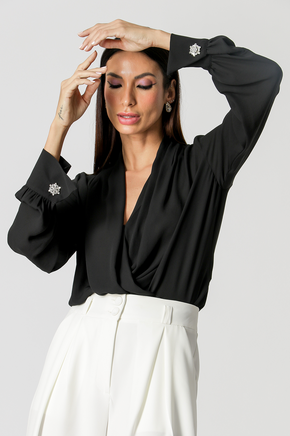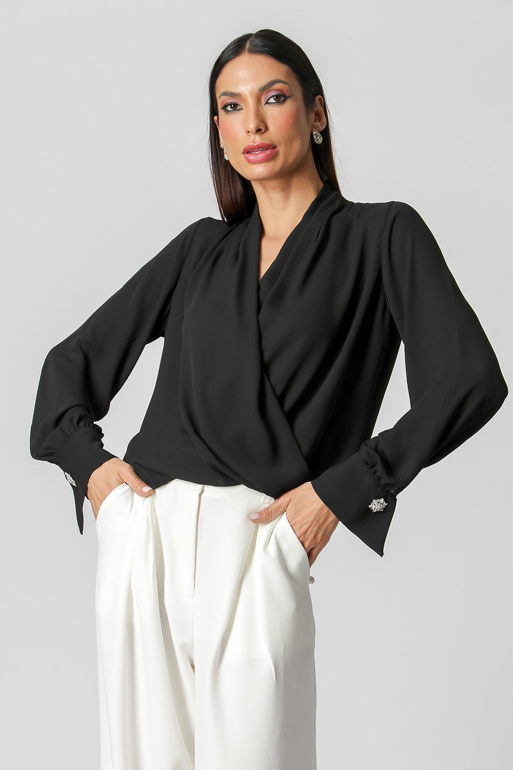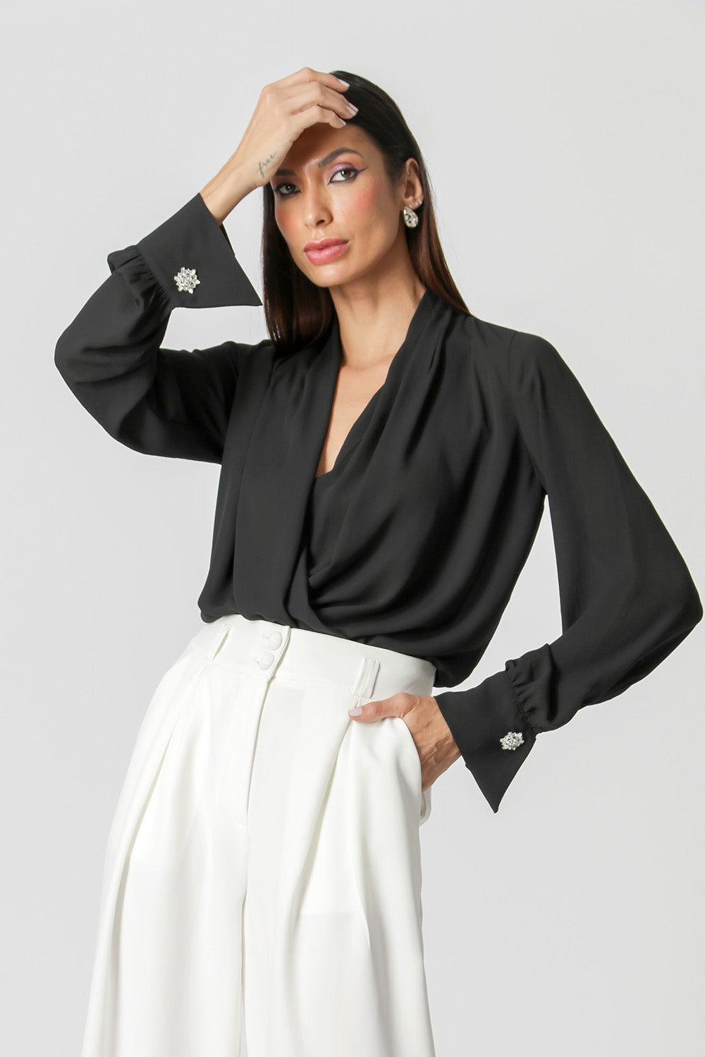 Blusa de manga larga con distintivo botón de pedrería, diseño estilo bufanda confeccionada en crepe fluido. Una pieza clásica y atemporal para un look elegante.