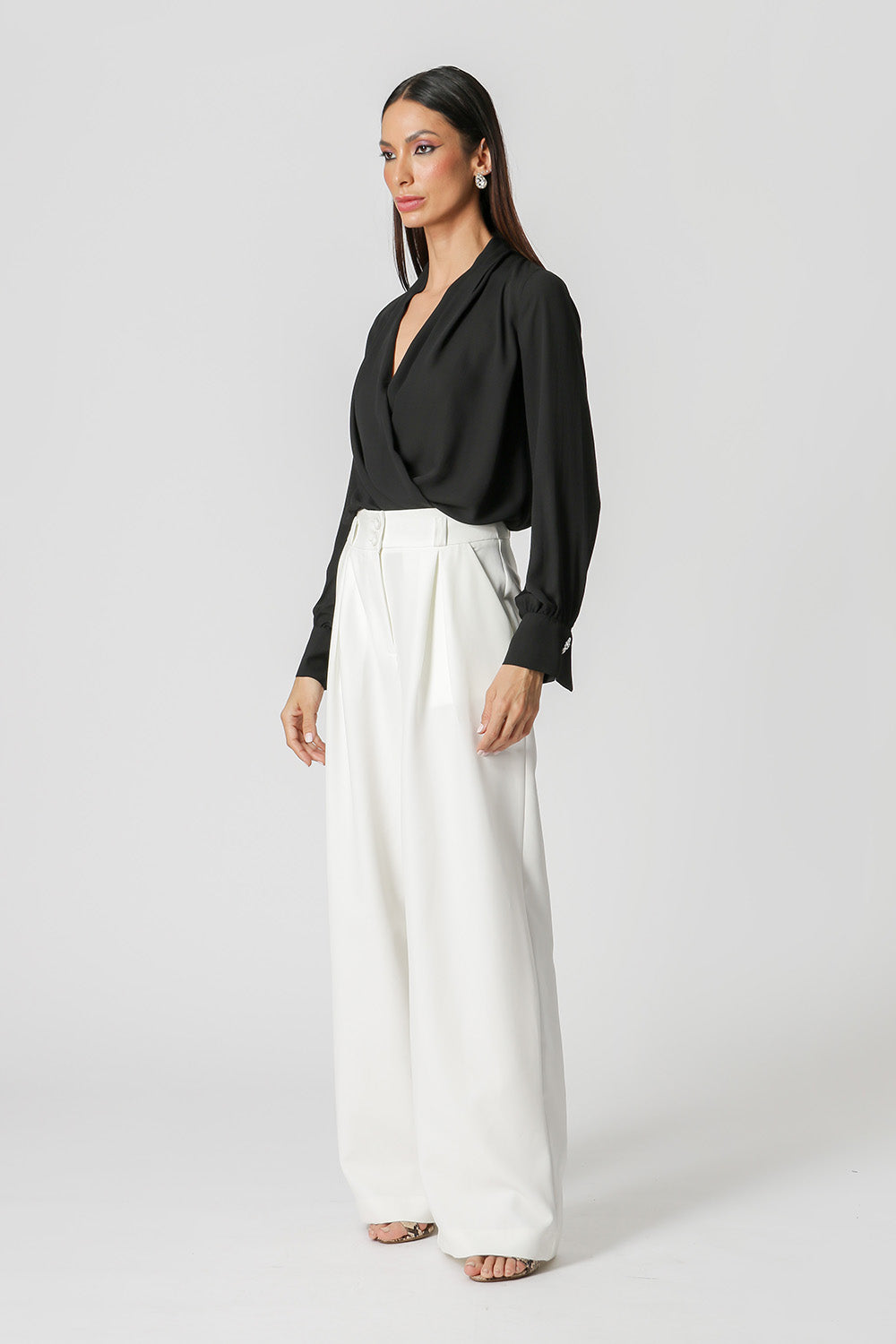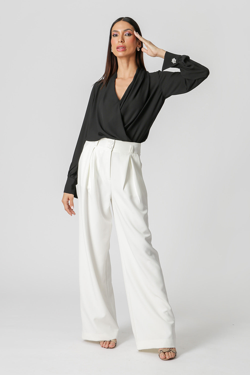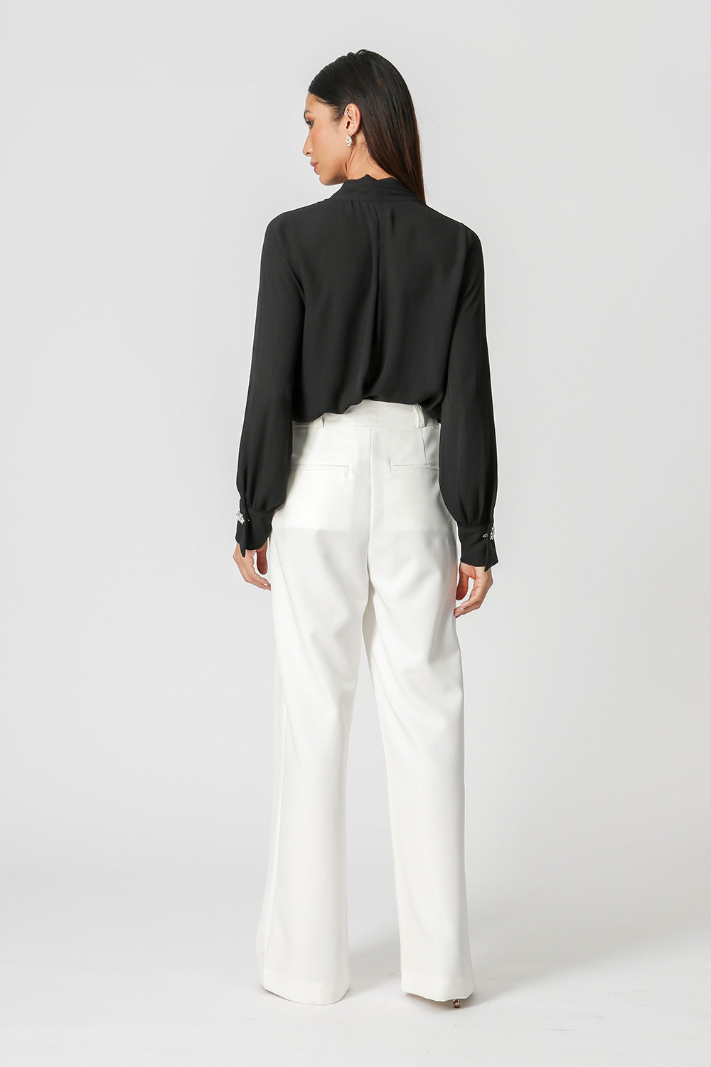 Blusa de manga larga con distintivo botón de pedrería, diseño estilo bufanda confeccionada en crepe fluido. Una pieza clásica y atemporal para un look elegante.