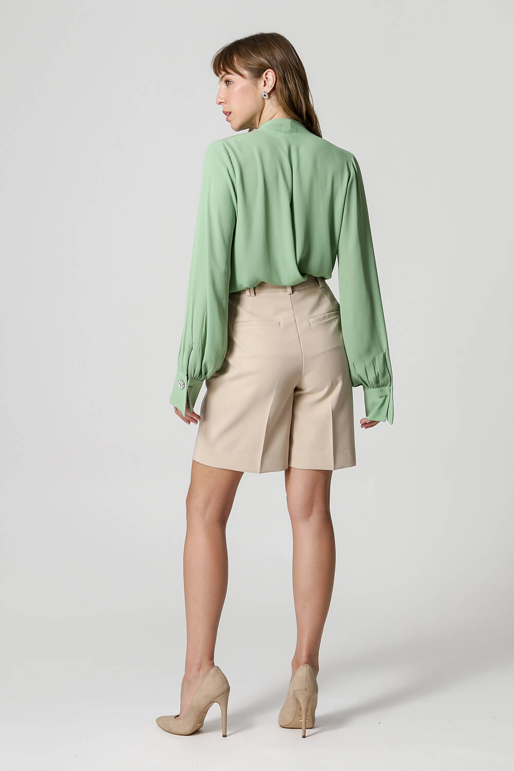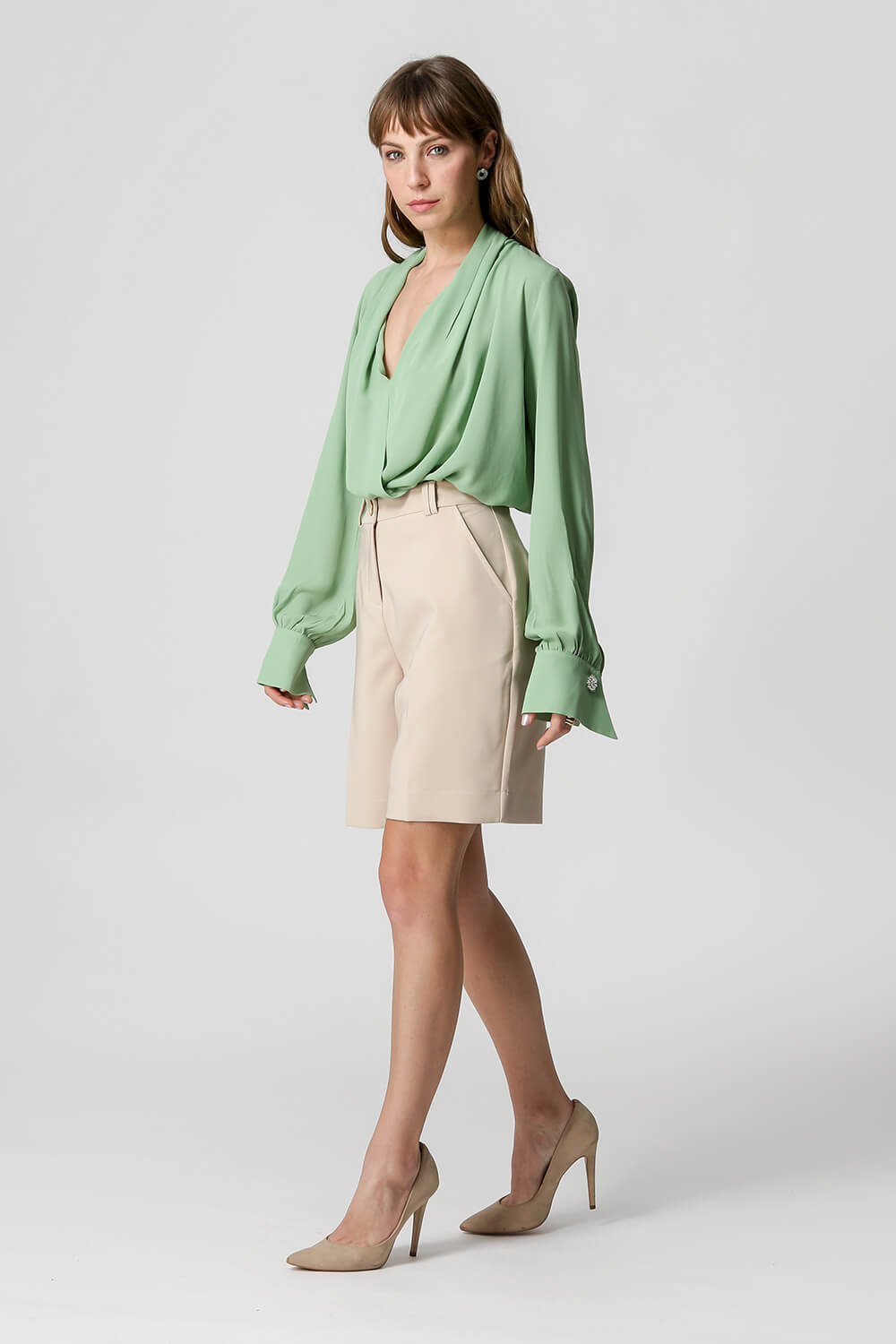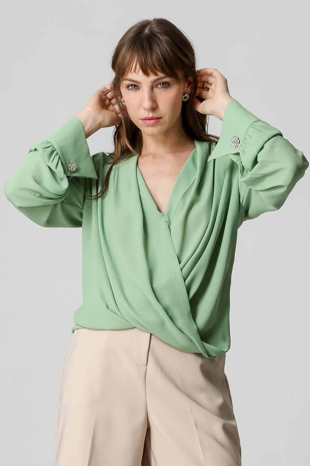 Blusa de manga larga con distintivo botón de pedrería, diseño estilo bufanda confeccionada en crepe fluido. Una pieza clásica y atemporal para un look elegante.