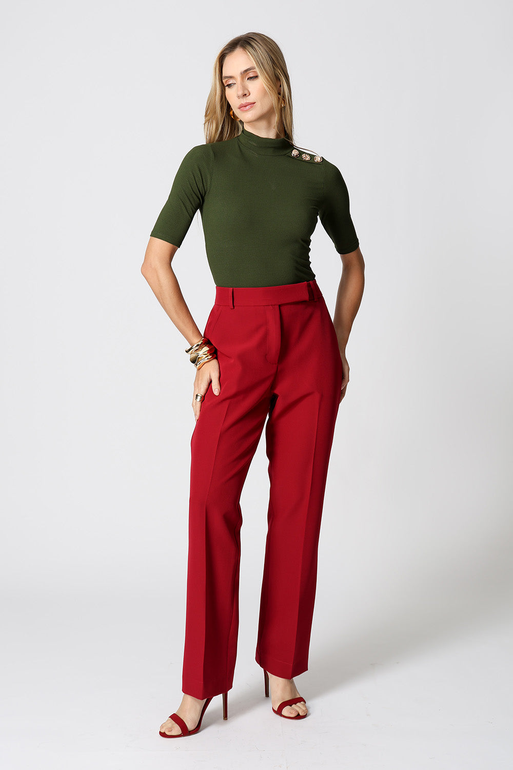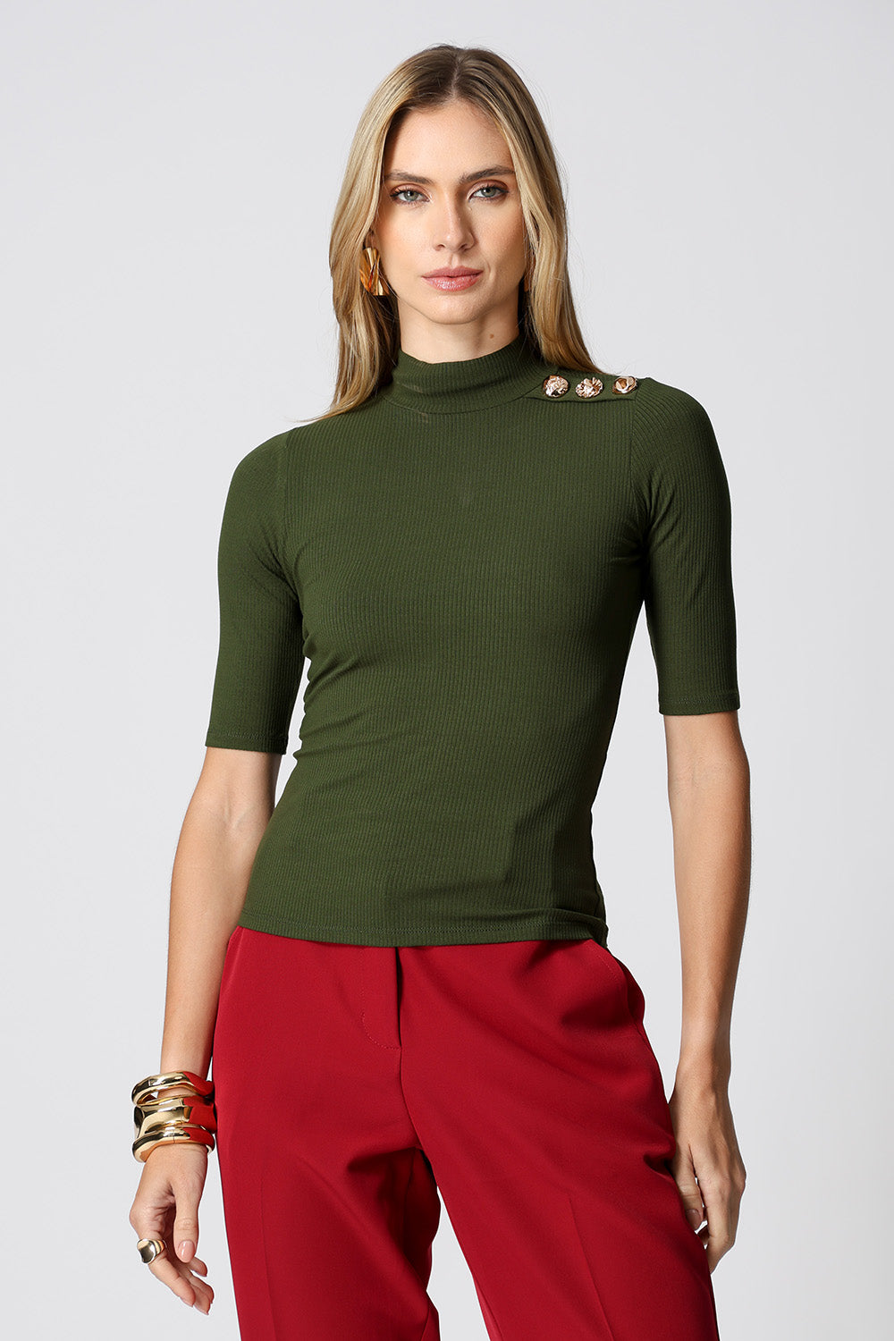 Blusa de manga midi con un toque de sofisticación, confeccionada en tejido de canalé fino. La elección perfecta para quienes buscan comodidad y estilo en una sola pieza.