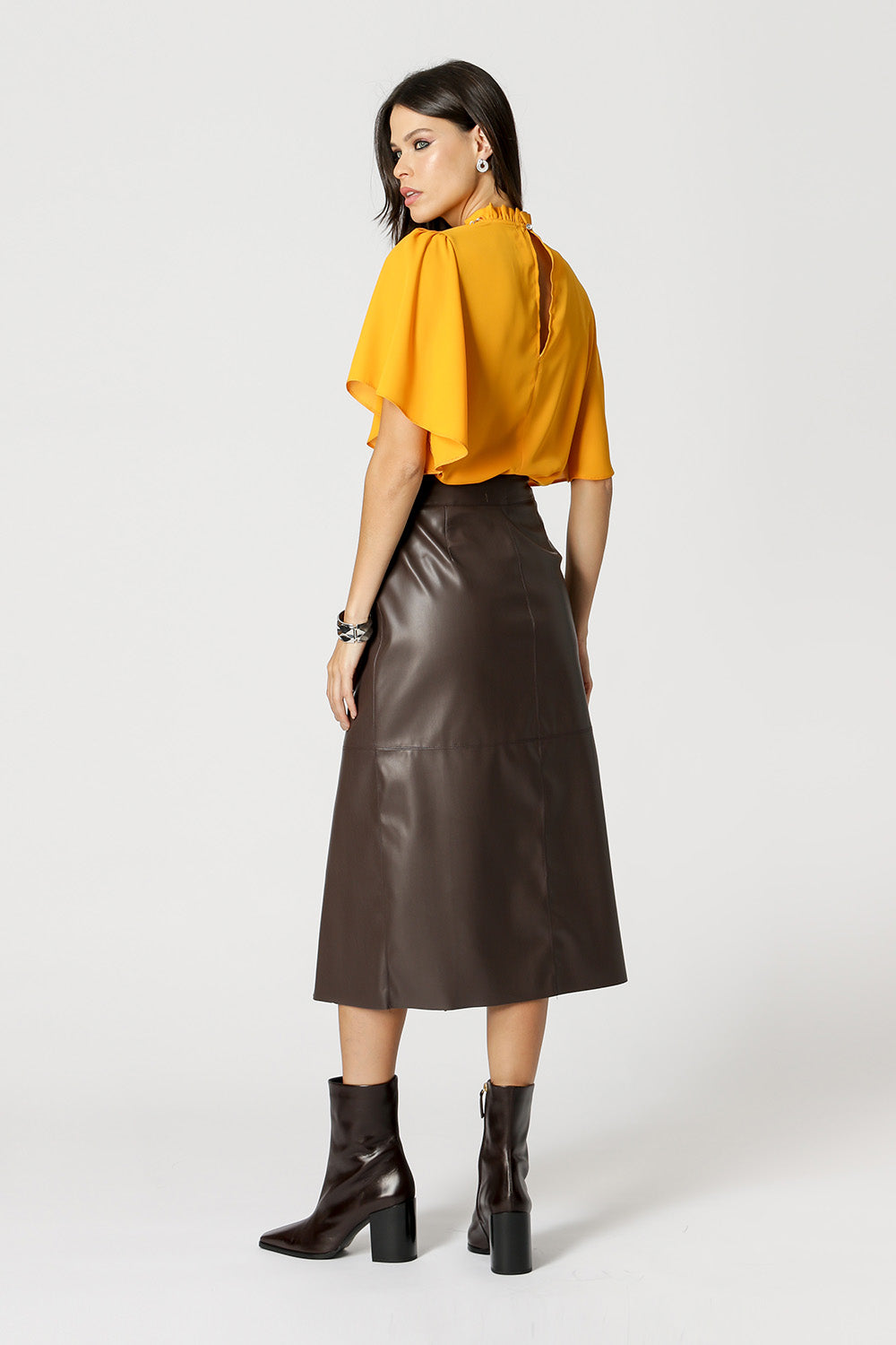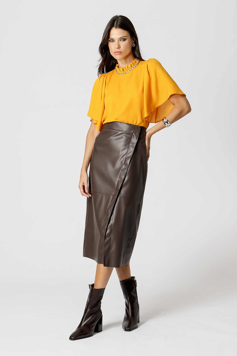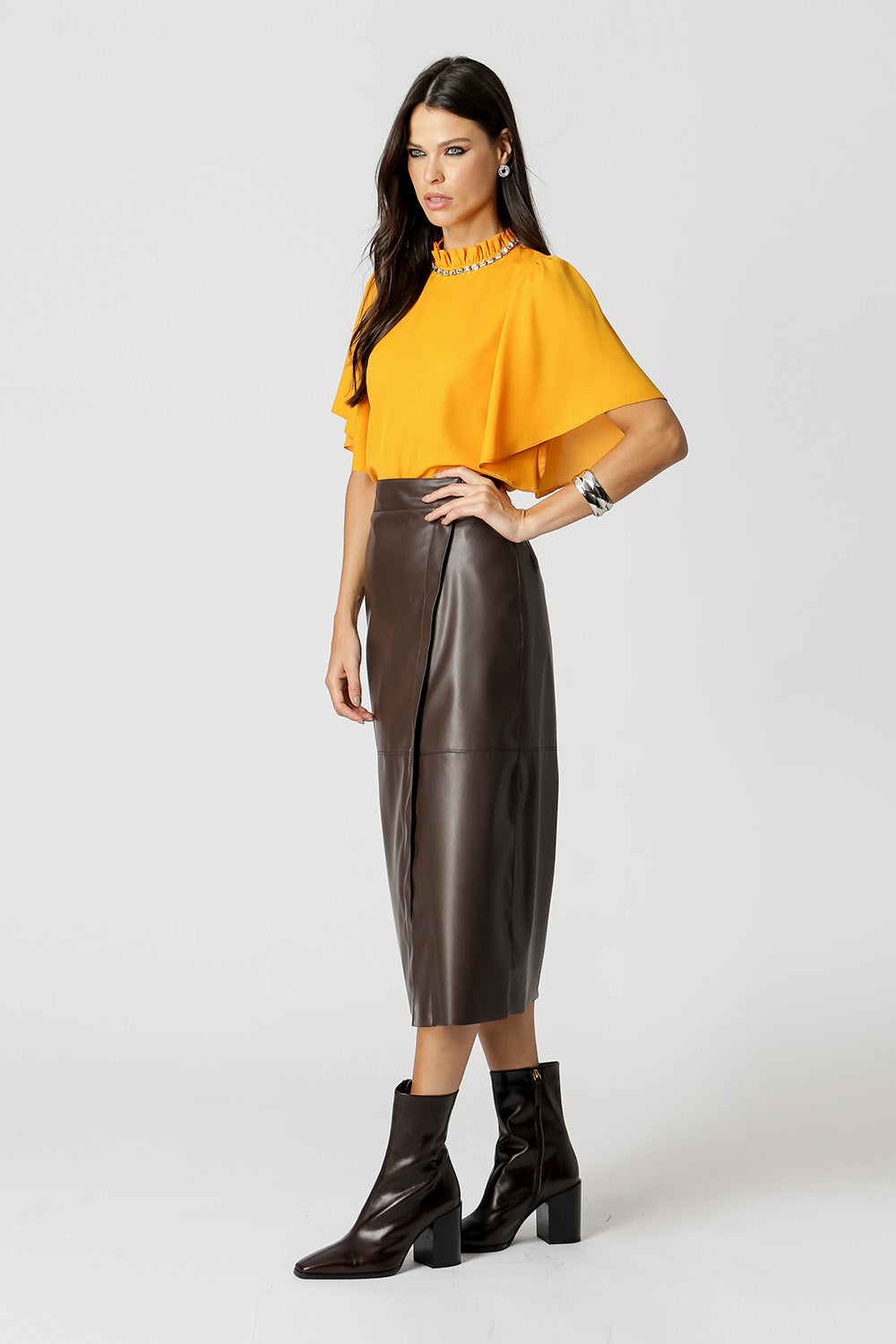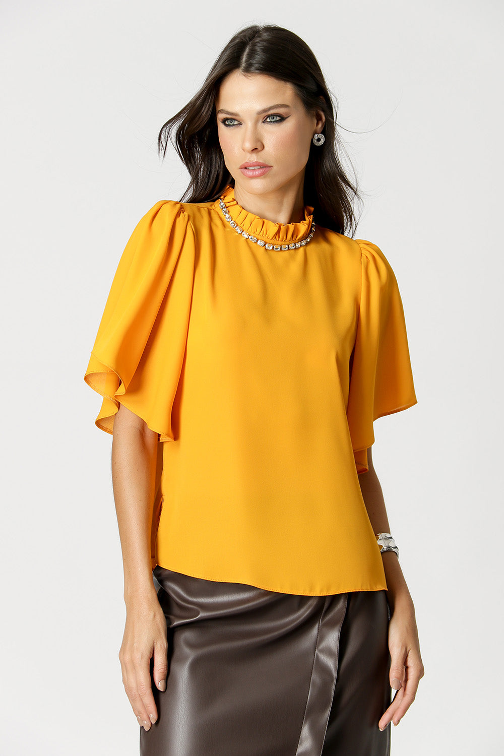 Blusa con pliegues en el cuello y collar de pedrería extraíble. Fabricado en tejido crepé fluido. Un modelo de corte ligero e ideal para un ambiente de trabajo.