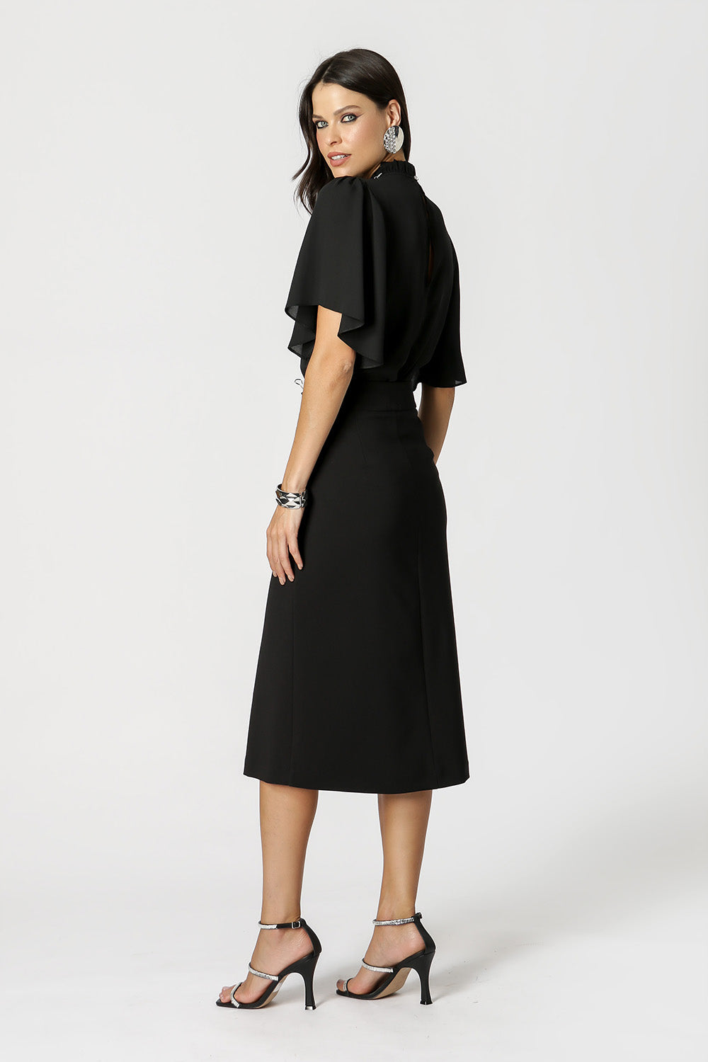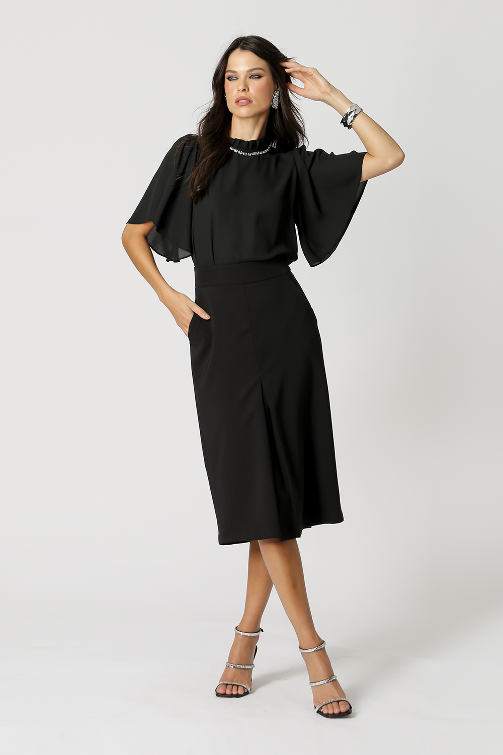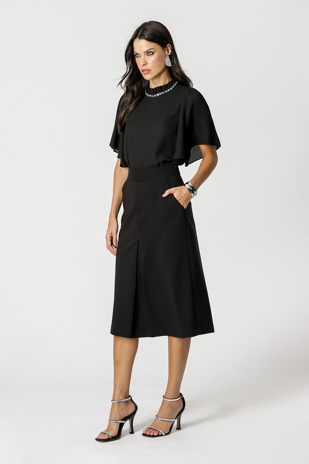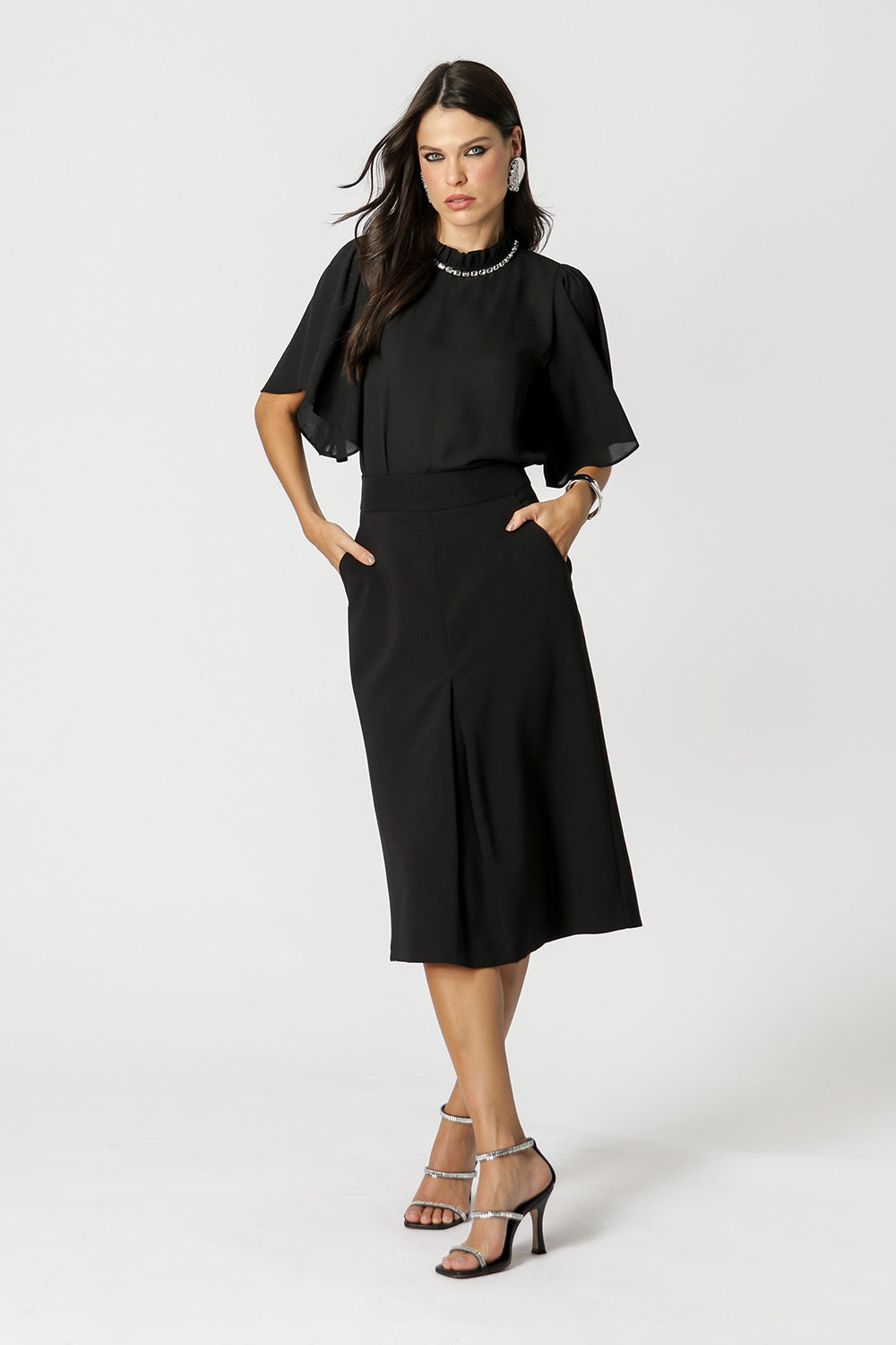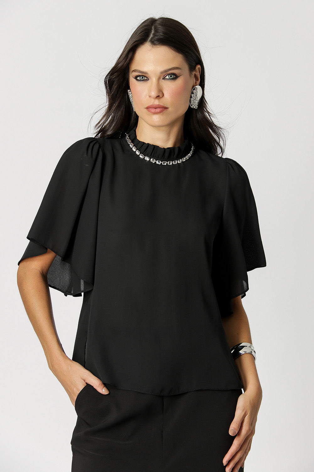Blusa con pliegues en el cuello y collar de pedrería extraíble. Fabricado en tejido crepé fluido. Un modelo de corte ligero e ideal para un ambiente de trabajo.