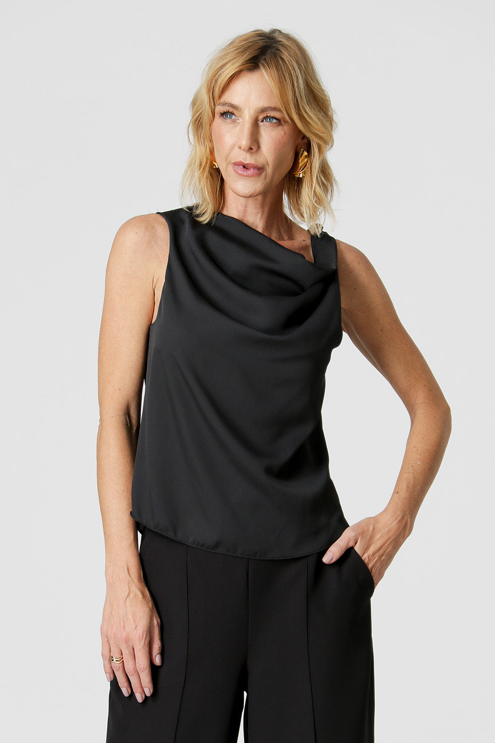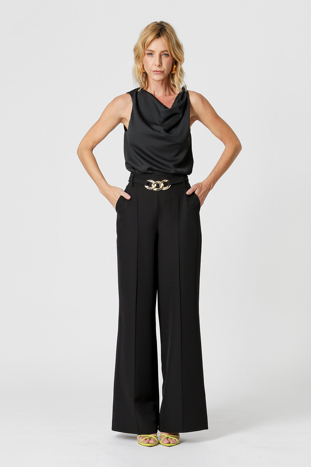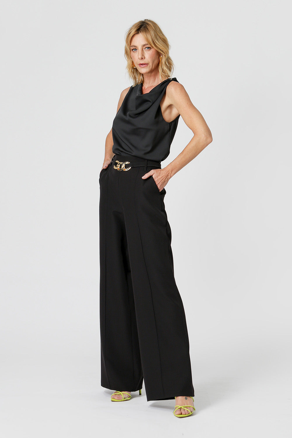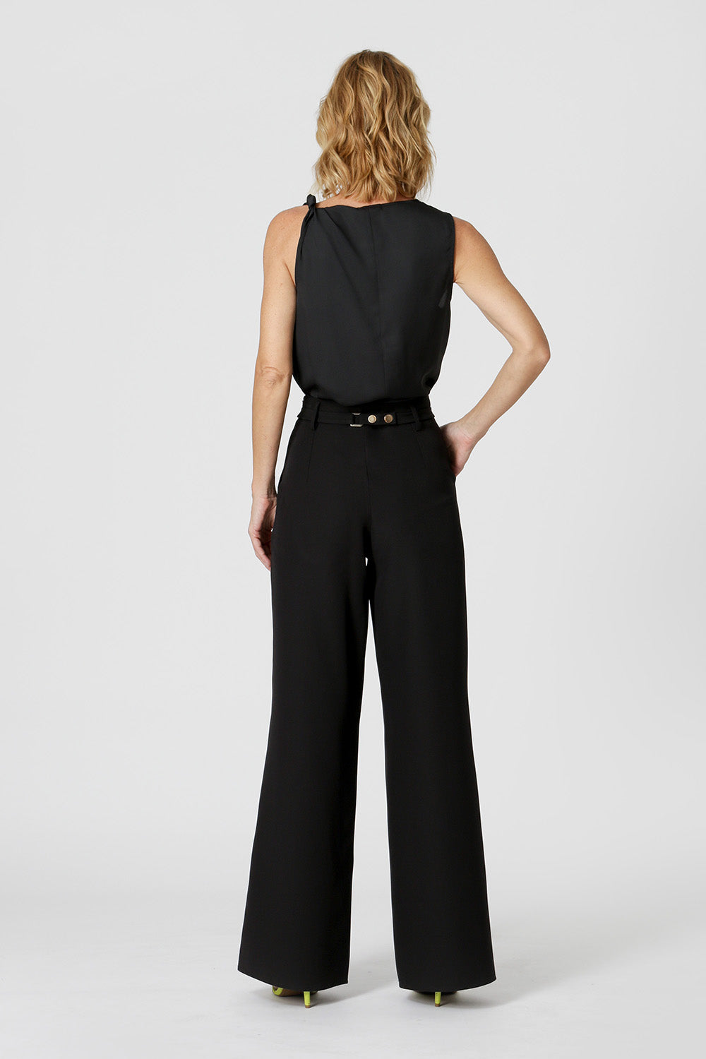Blusa con escote asimétrico y tirantes retorcidos. Fabricado en tejido crepé fluido. Una pieza de forma suelta e ideal para crear looks de trabajo.