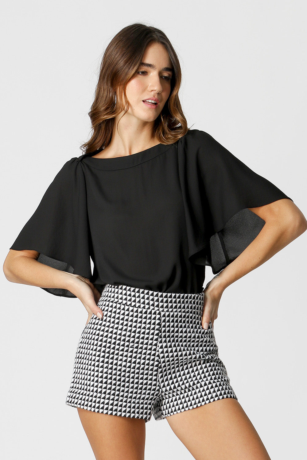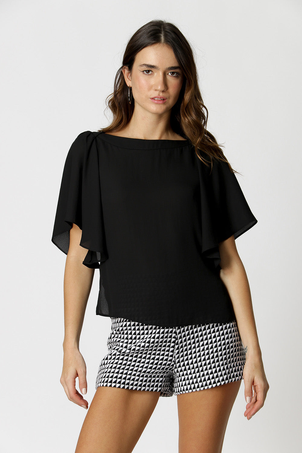 Blusa con escote barco y detalle superpuesto en el hombro. Pieza confeccionada en tejido crepé fluido. Pieza ideal para crear un ambiente de trabajo cómodo y chic.