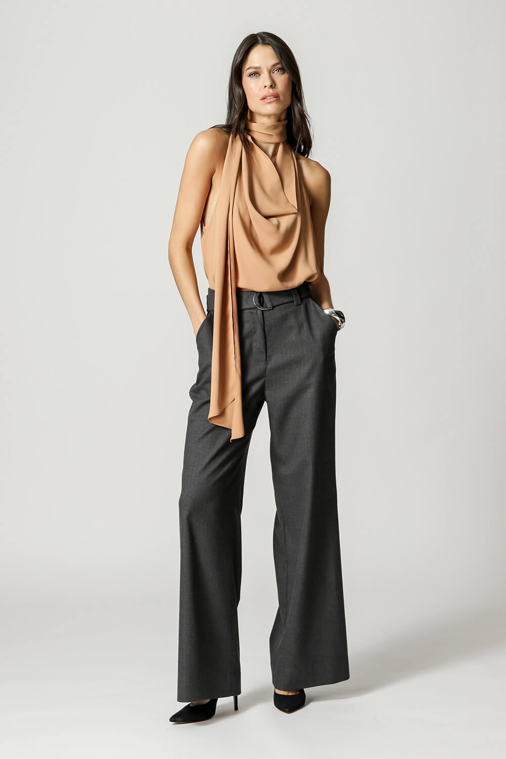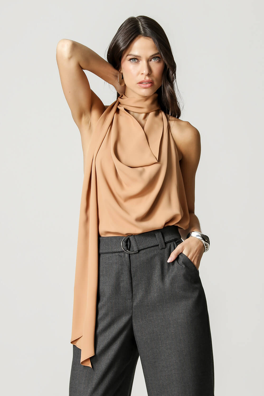 Blusa con escote dégagé y pañuelo. Fabricado en tejido crepe de textura ligera. Un modelo imprescindible que no puede faltar en tu armario y es perfecto para un look casual.