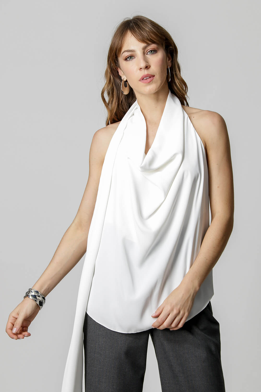 Blusa con escote dégagé y pañuelo. Fabricado en tejido crepe de textura ligera. Un modelo imprescindible que no puede faltar en tu armario y es perfecto para un look casual.