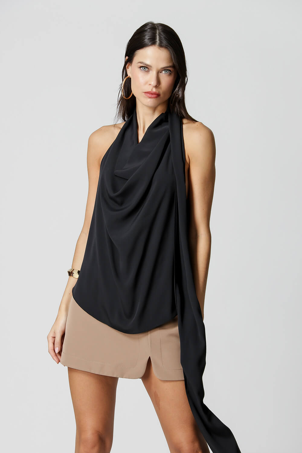 Blusa con escote dégagé y pañuelo. Fabricado en tejido crepe de textura ligera. Un modelo imprescindible que no puede faltar en tu armario y es perfecto para un look casual.