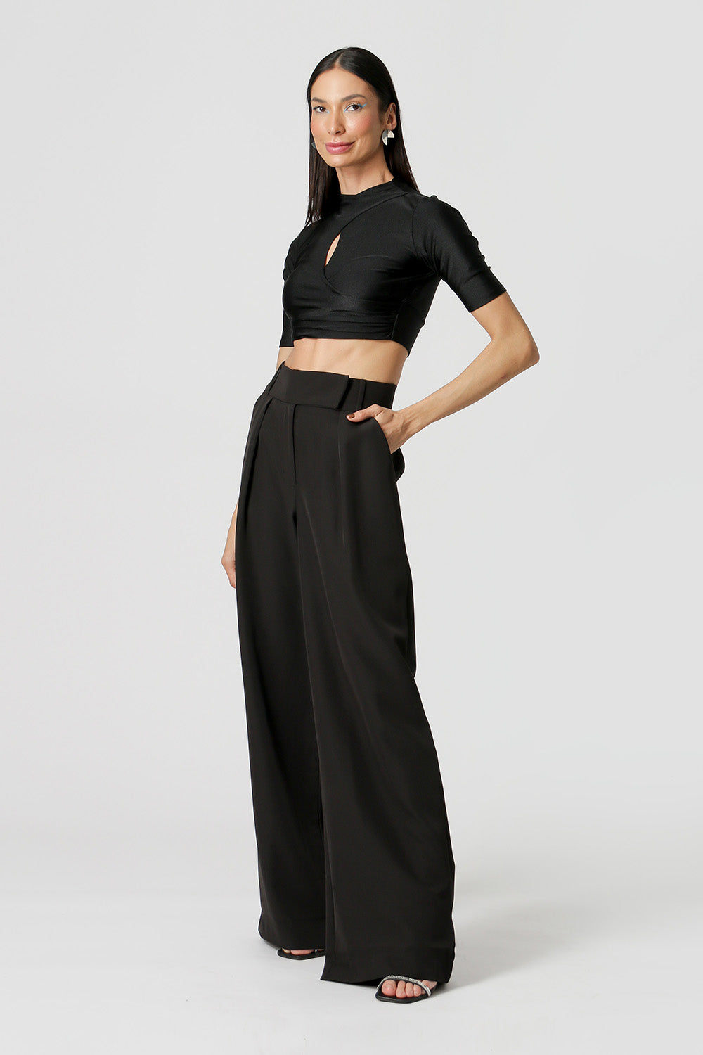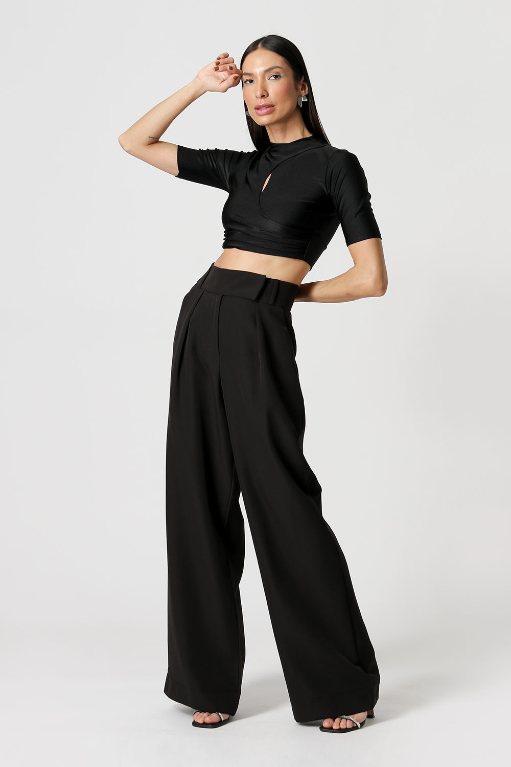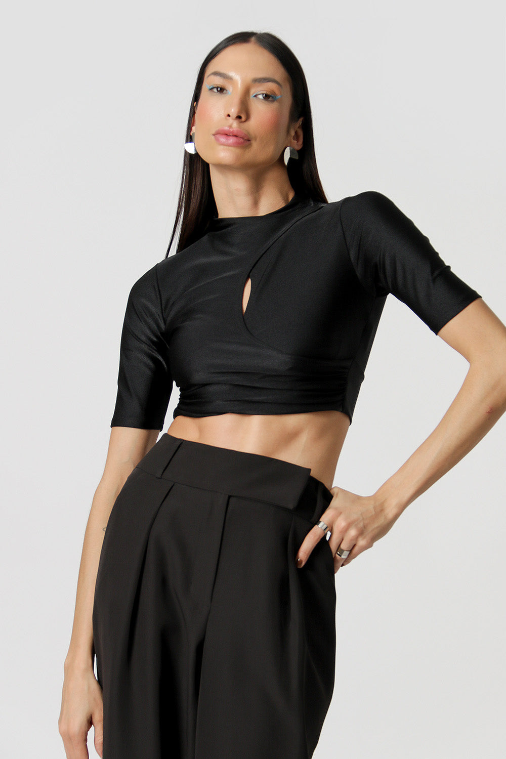 Blusa confeccionada en malla metalizada, con escote cruzado y ligeros volantes en el lateral y mangas midi, pieza de largo cropped para diversas ocasiones.