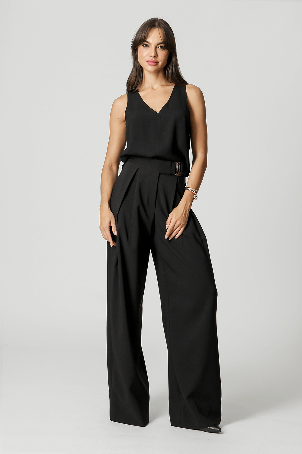 Blusa sin mangas con escote en pico y corte frontal con botón en la espalda. Un modelo realizado en tejido crepe fluido. Modelo cómodo y ligero para el ambiente laboral y un imprescindible en tu armario.