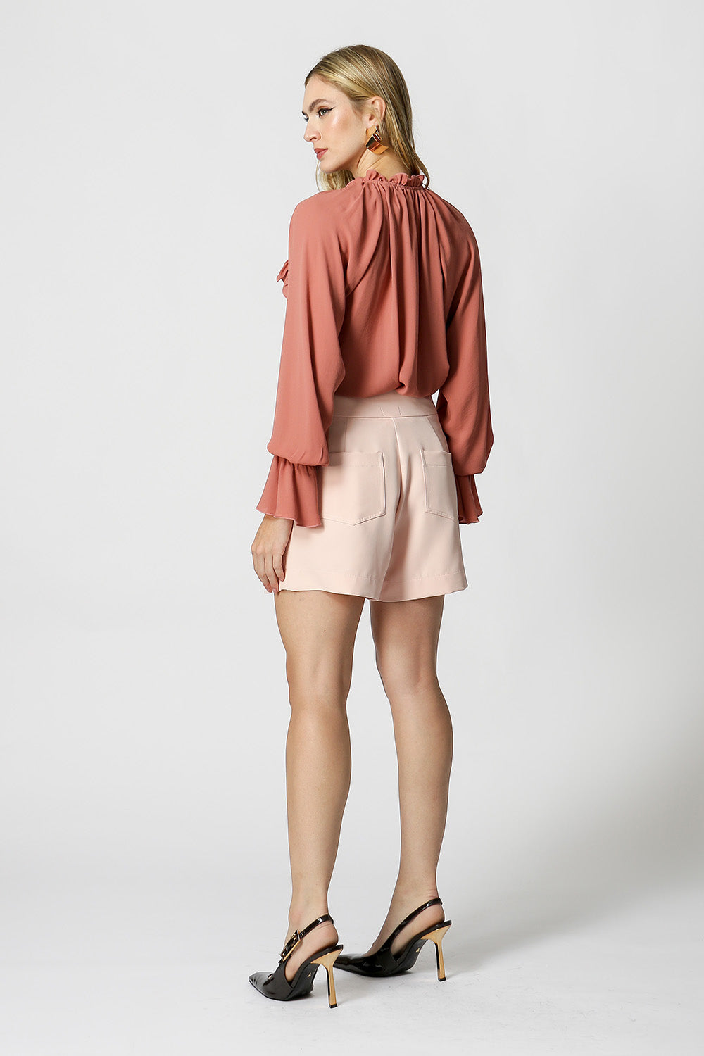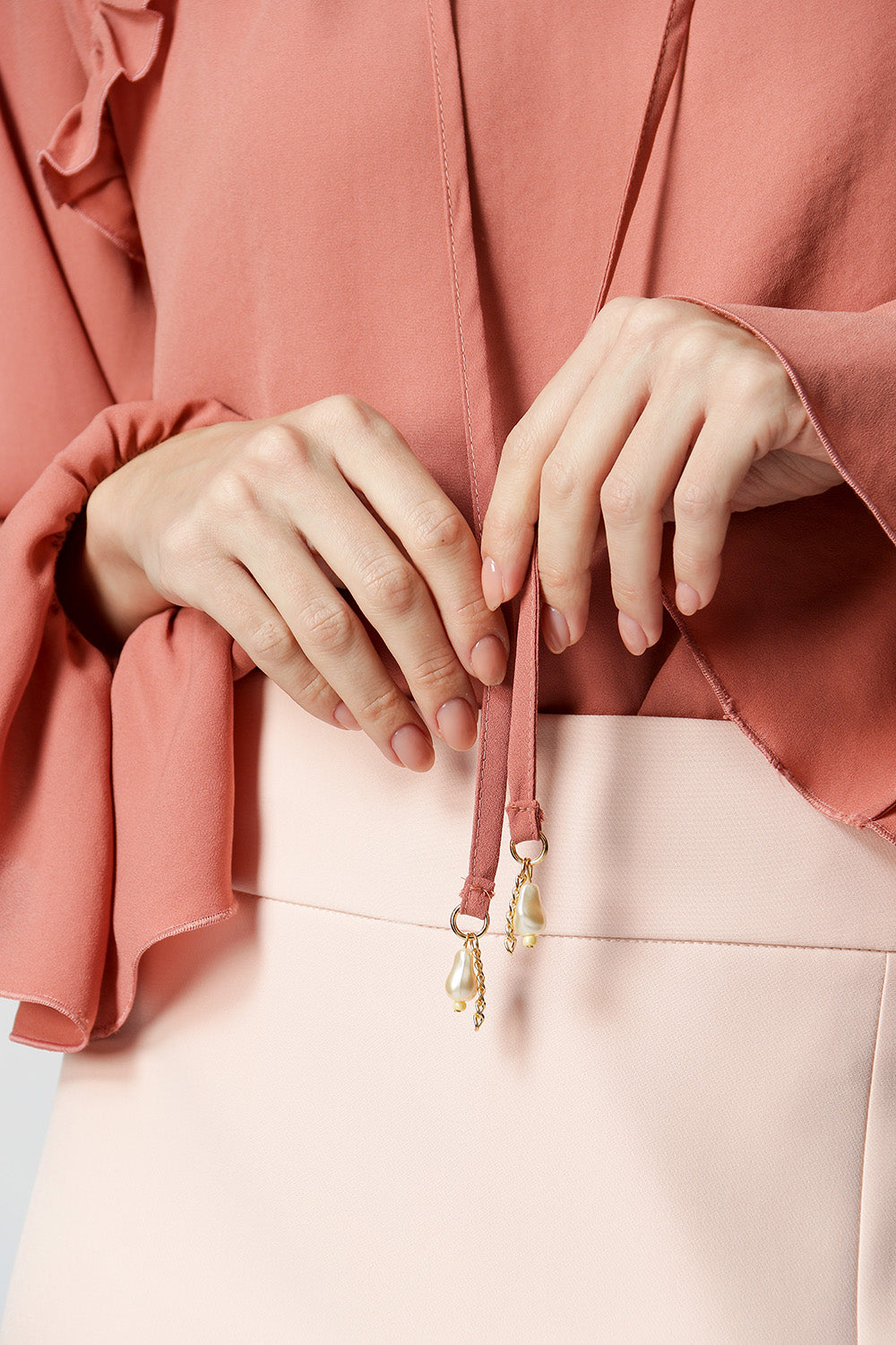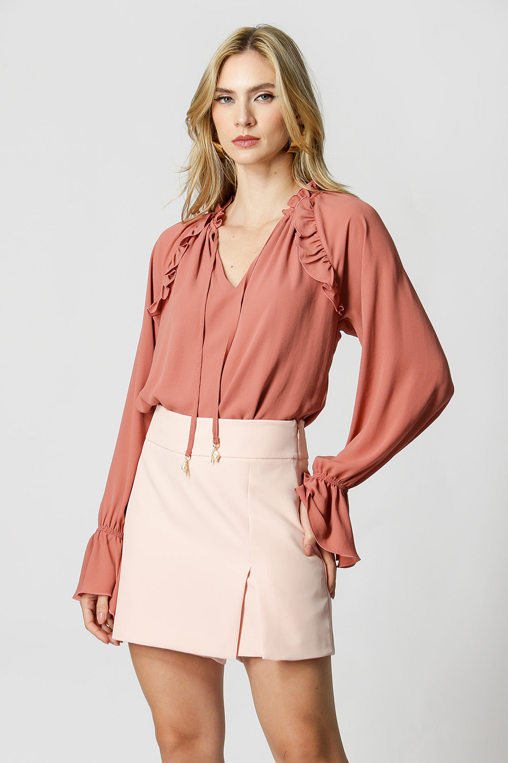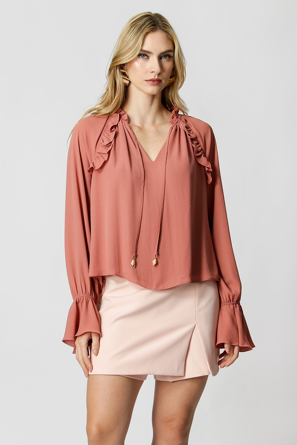Blusa fluida de crepe con delicado volante en sisa y cuello. Tiene detalles de perlas en las puntas. Una pieza romántica y elegante, ¡anímate a por ella!