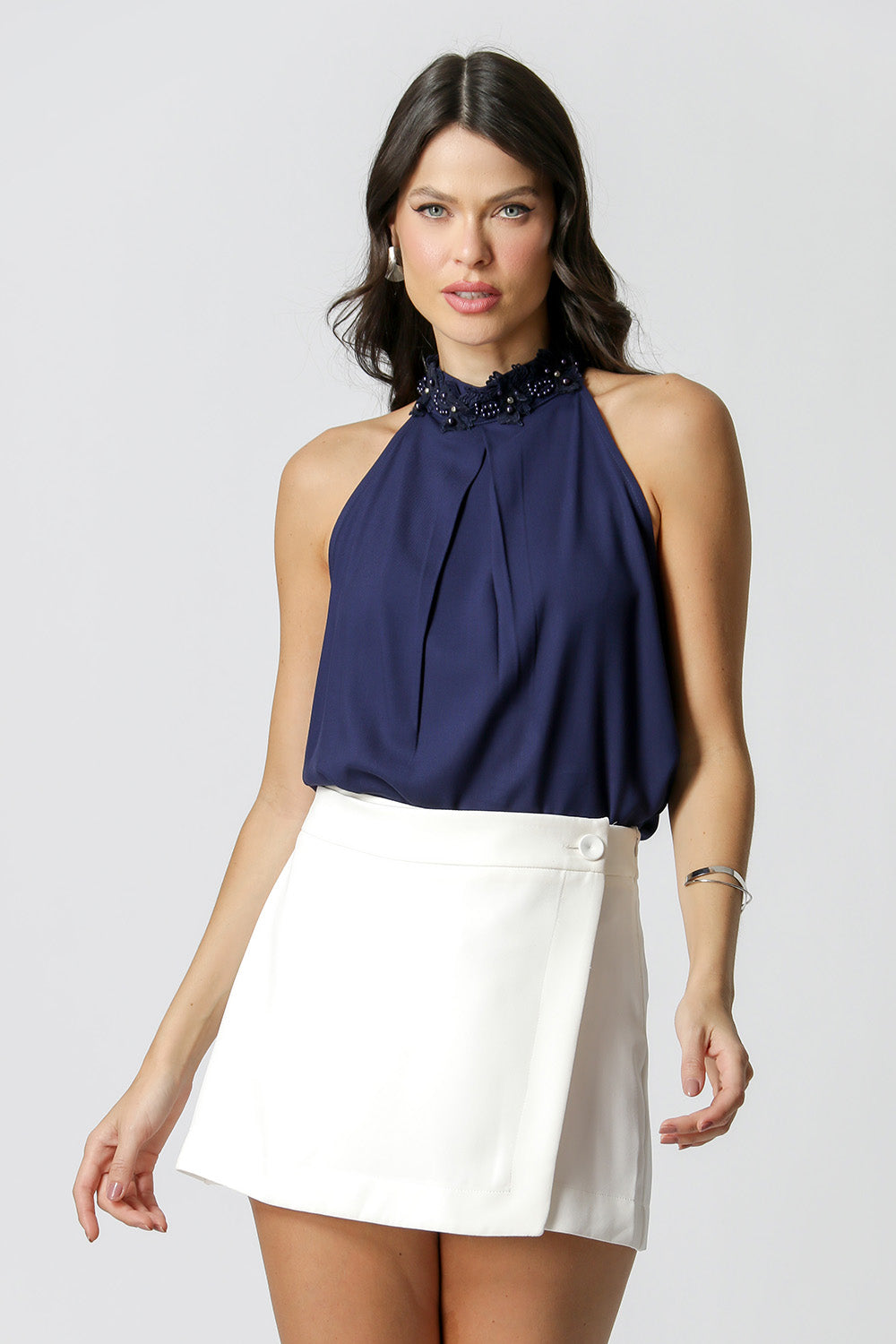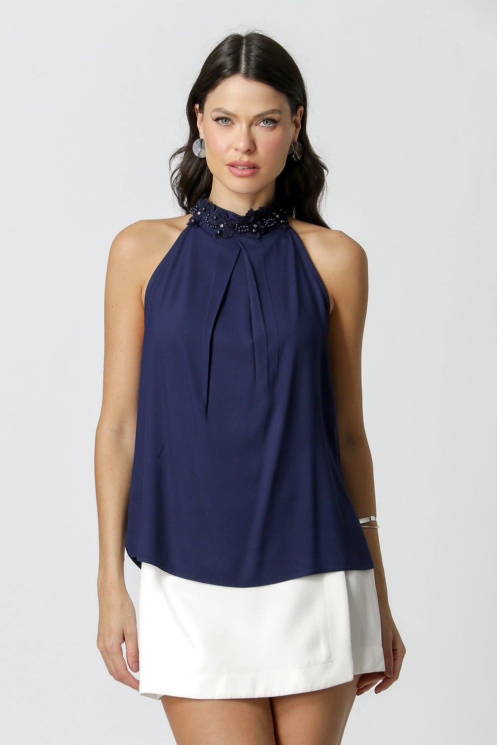 • Blusa con detalle de encaje en el cuello - AZUL MARINO