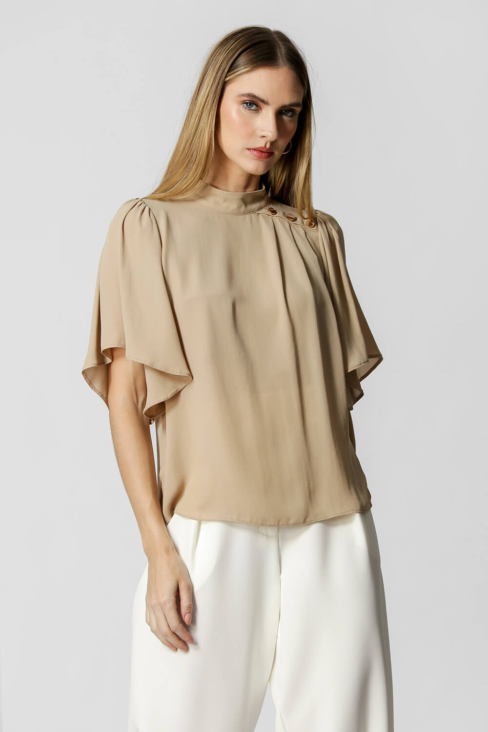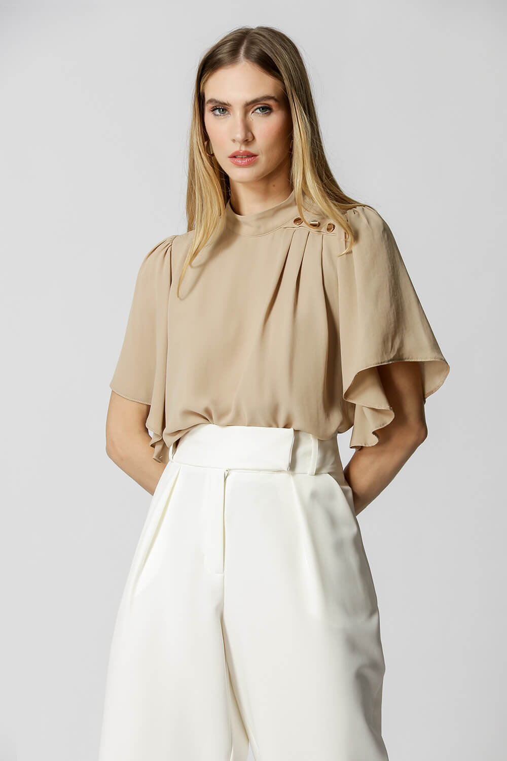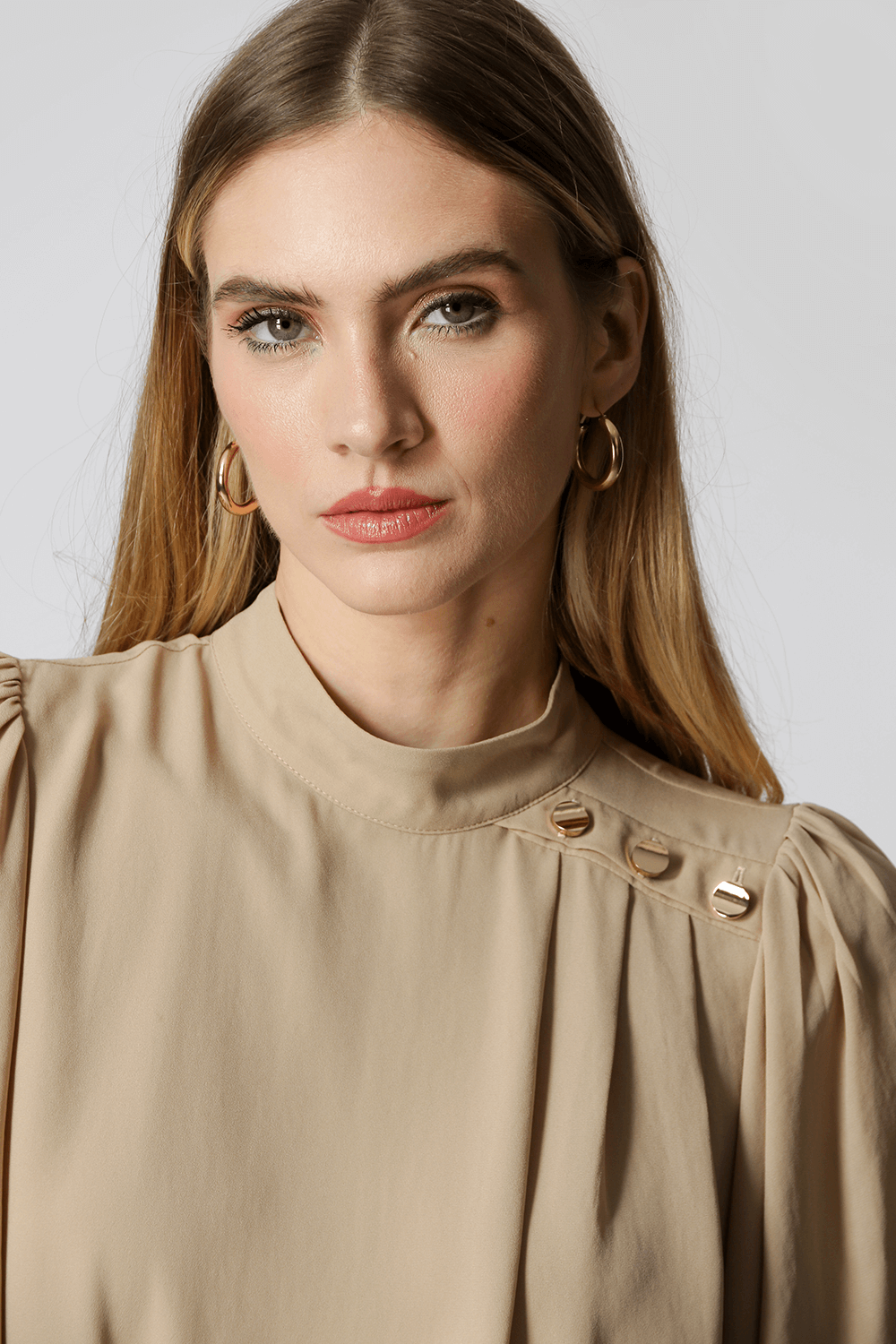 Blusa de manga corta y cuello alto, con detalle de botones metálicos. Pieza confeccionada en tejido crepé fluido. Un modelo perfecto para un ambiente de trabajo lleno de encanto.