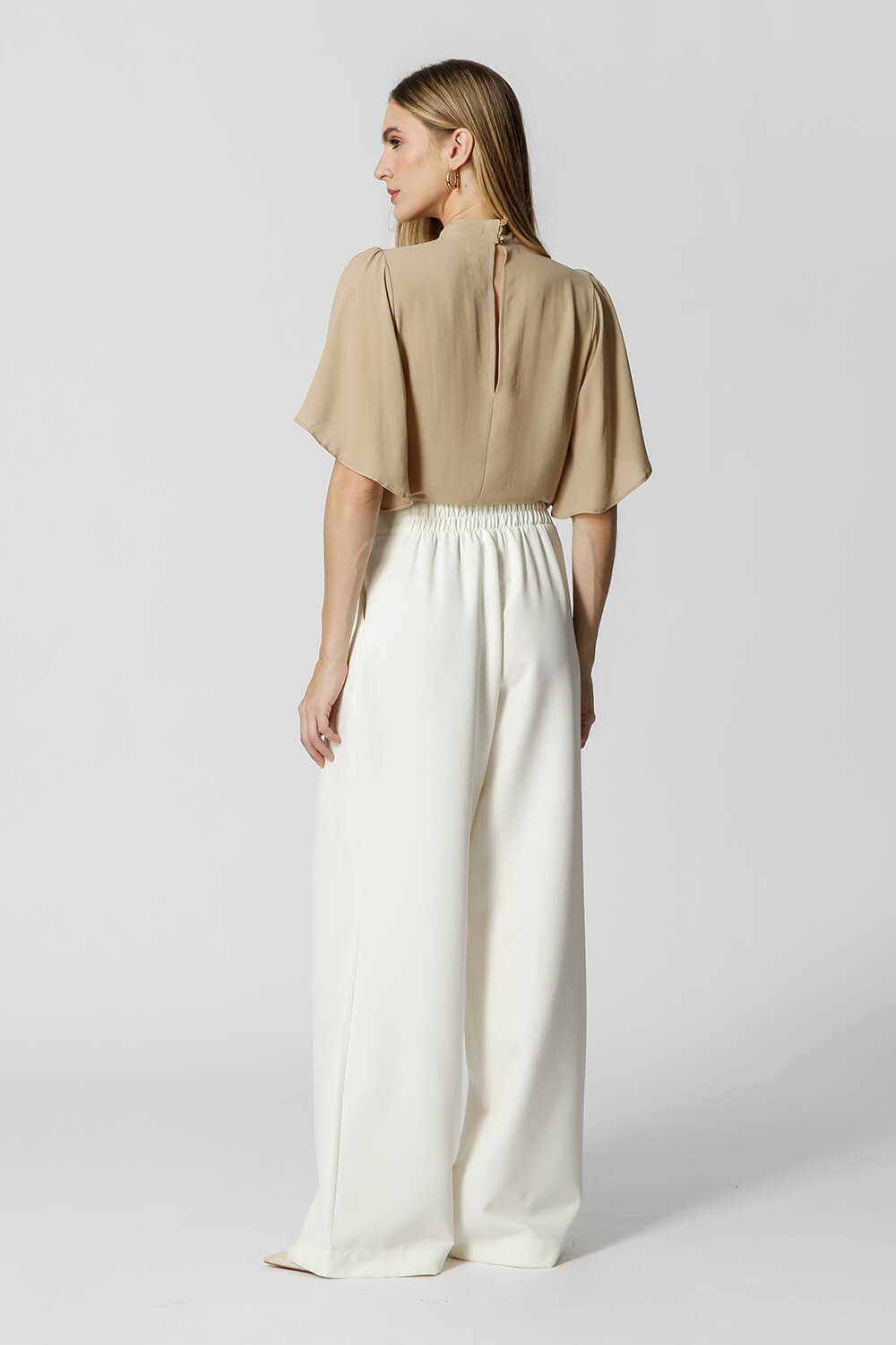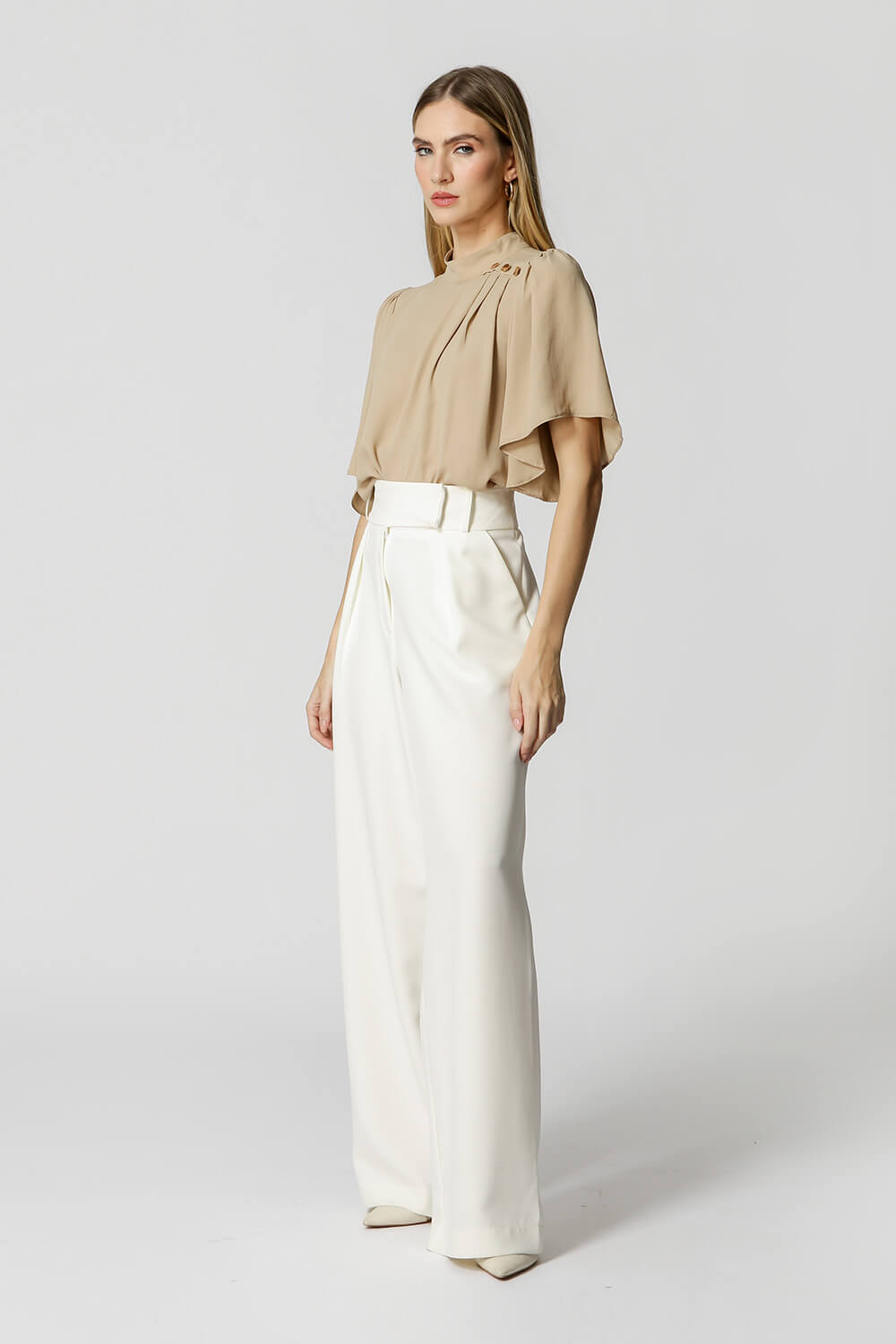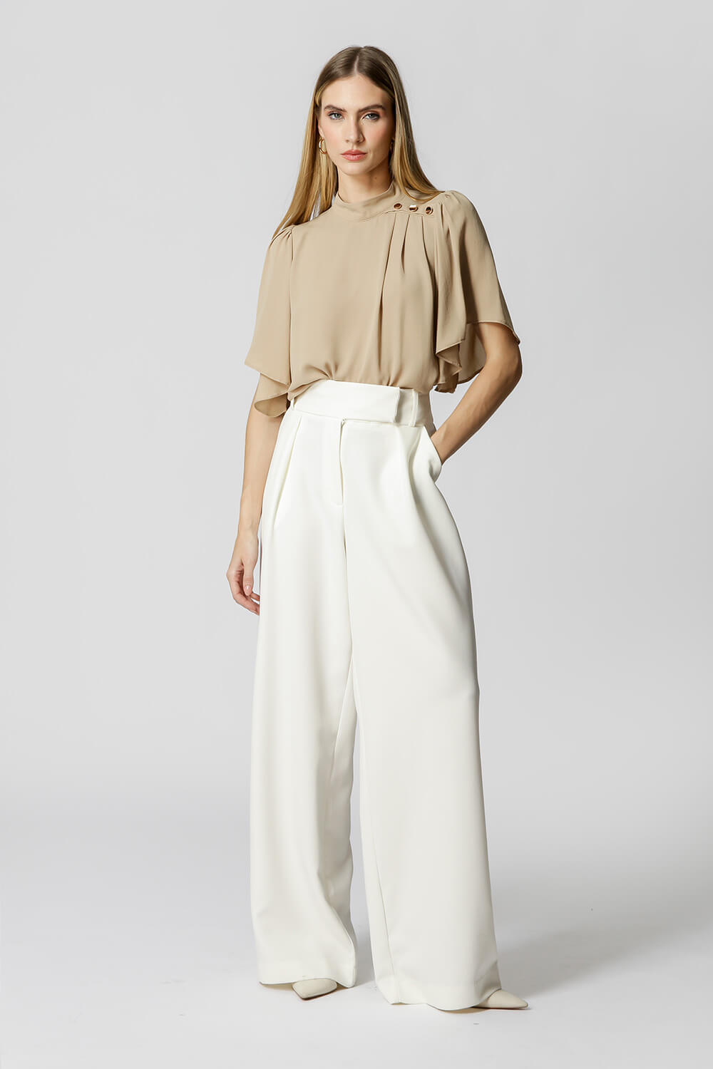 Blusa de manga corta y cuello alto, con detalle de botones metálicos. Pieza confeccionada en tejido crepé fluido. Un modelo perfecto para un ambiente de trabajo lleno de encanto.