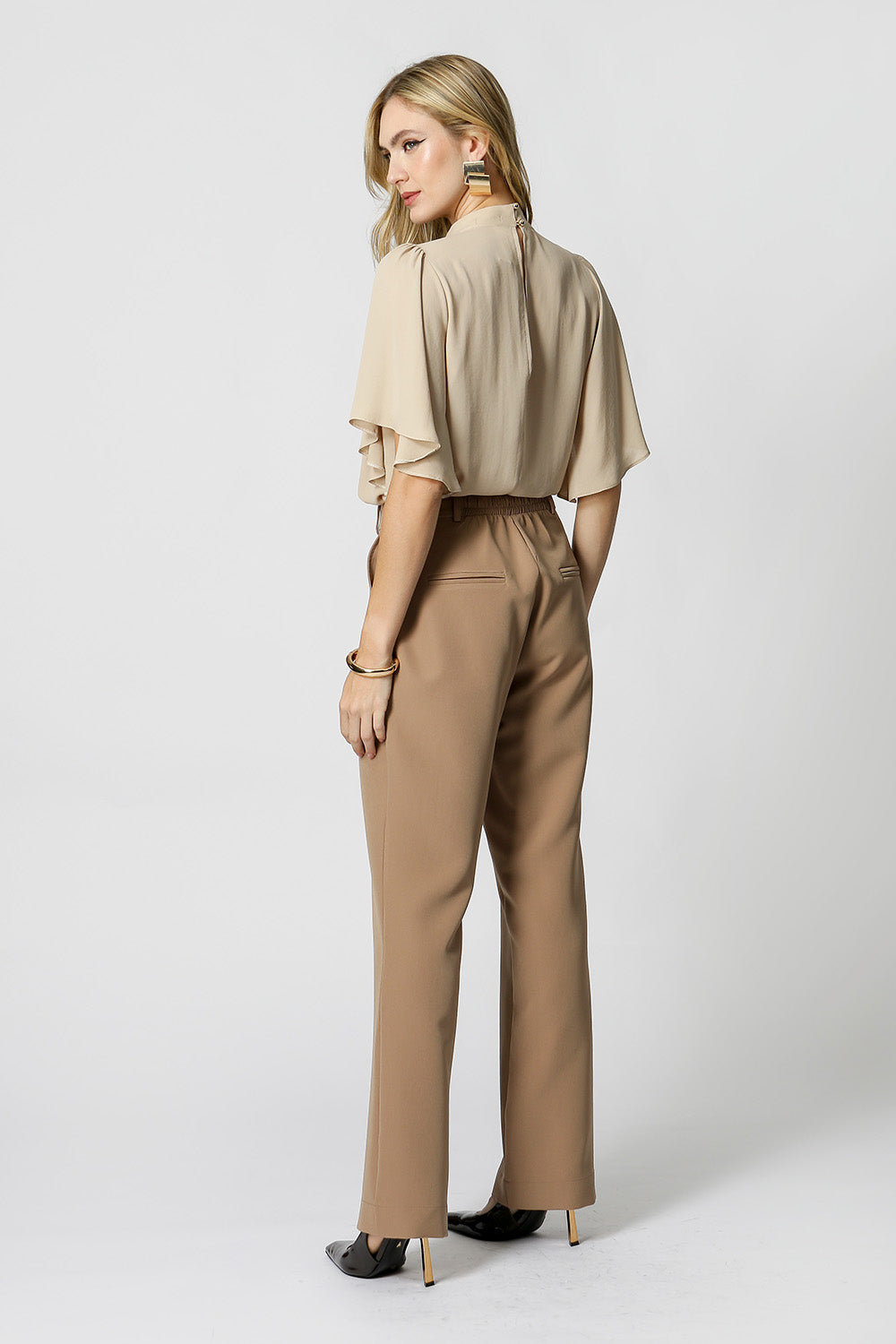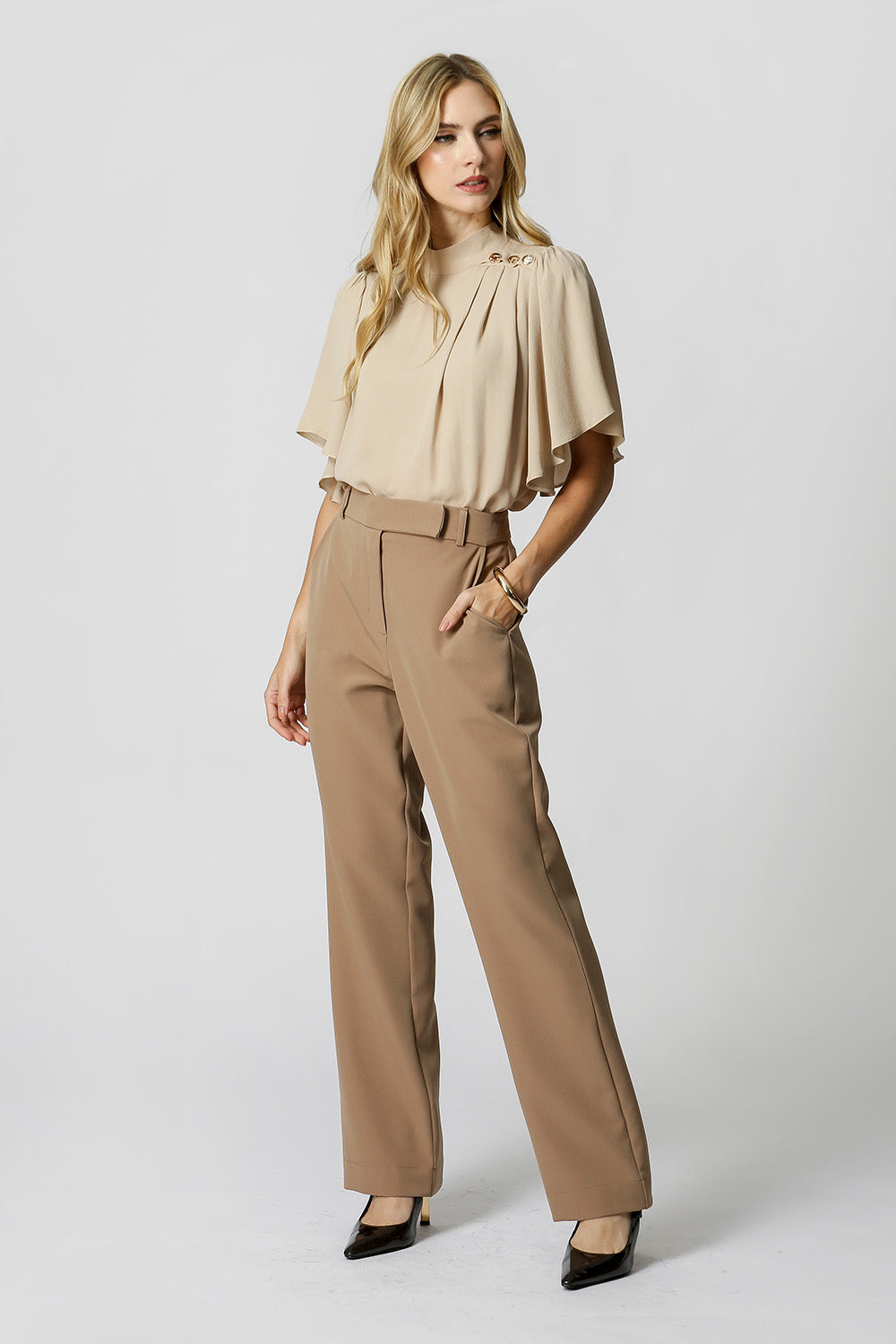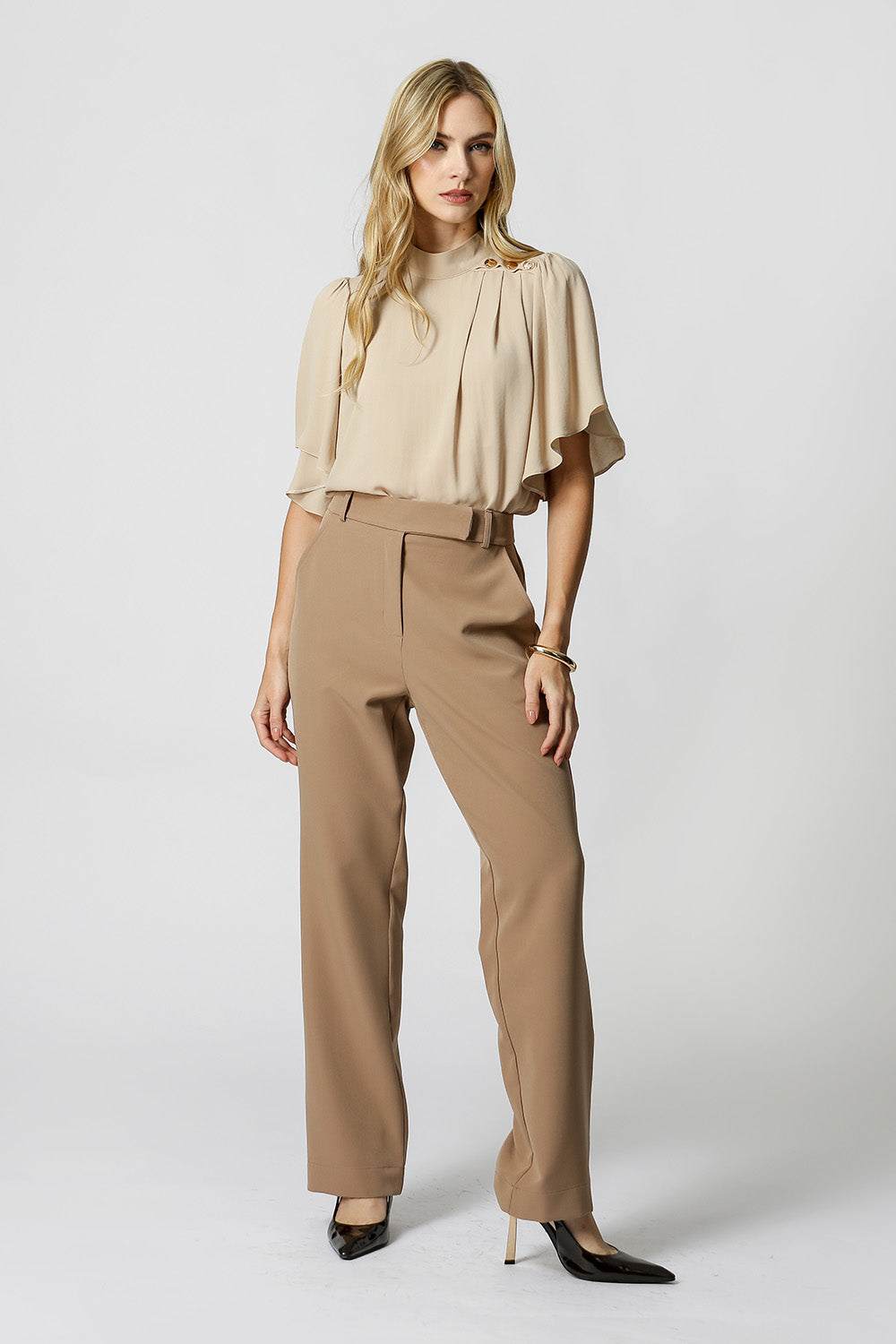 Blusa de manga corta y cuello alto, con detalle de botones metálicos. Pieza confeccionada en tejido crepé fluido. Un modelo perfecto para un ambiente de trabajo lleno de encanto.