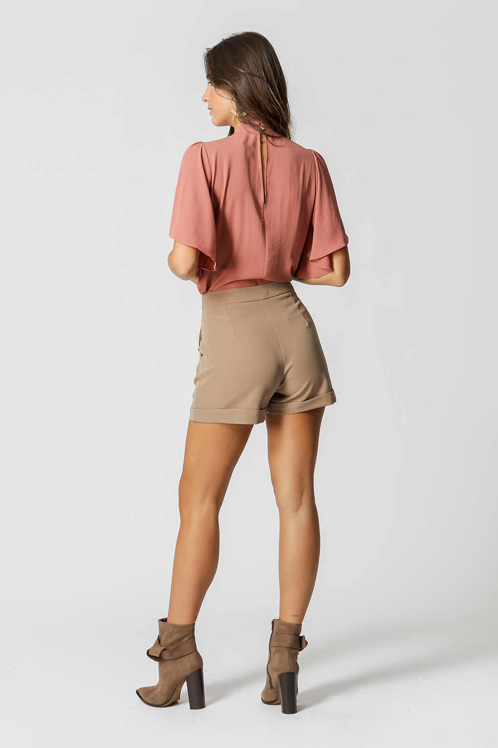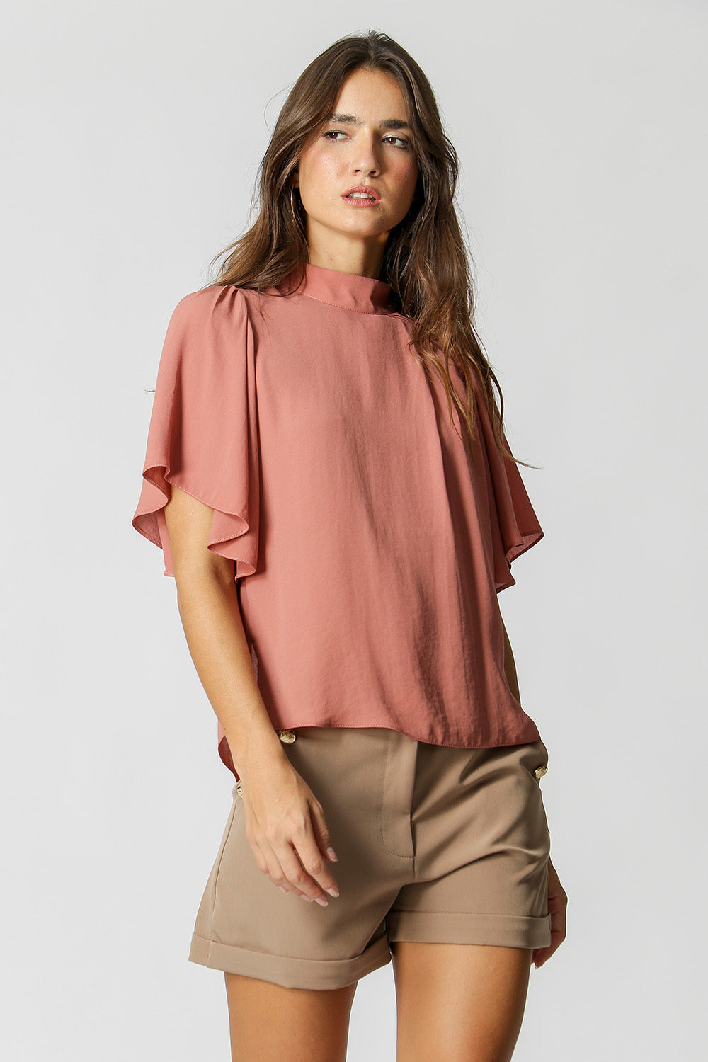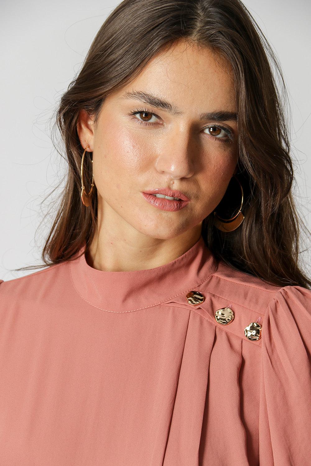 Blusa de manga corta y cuello alto, con detalle de botones metálicos. Pieza confeccionada en tejido crepé fluido. Un modelo perfecto para un ambiente de trabajo lleno de encanto.