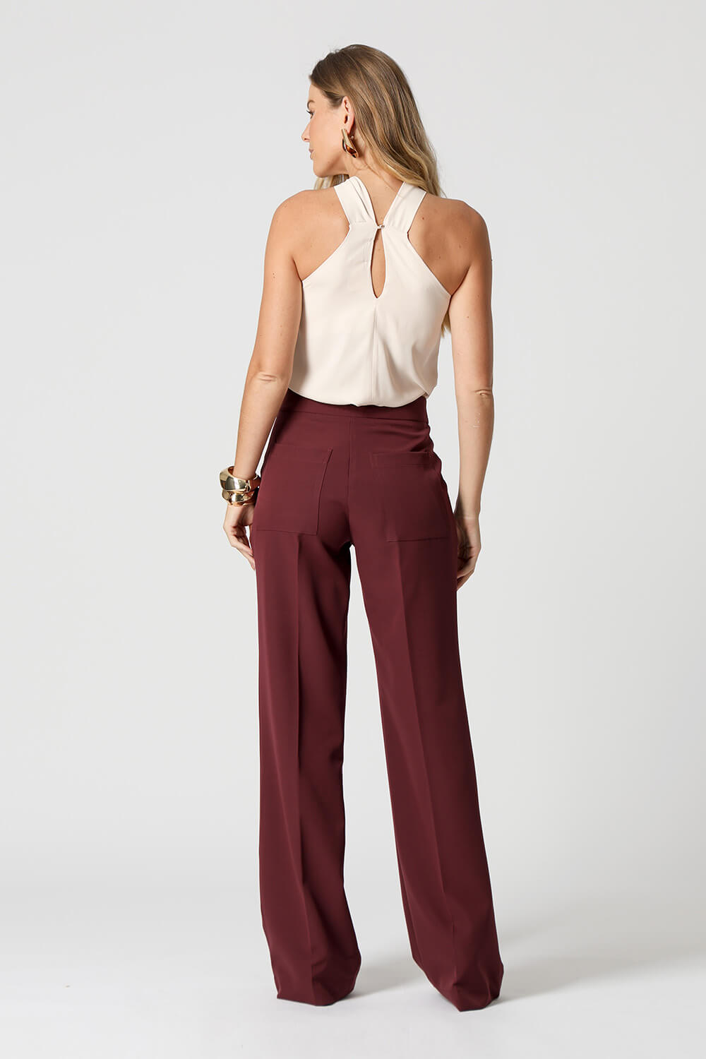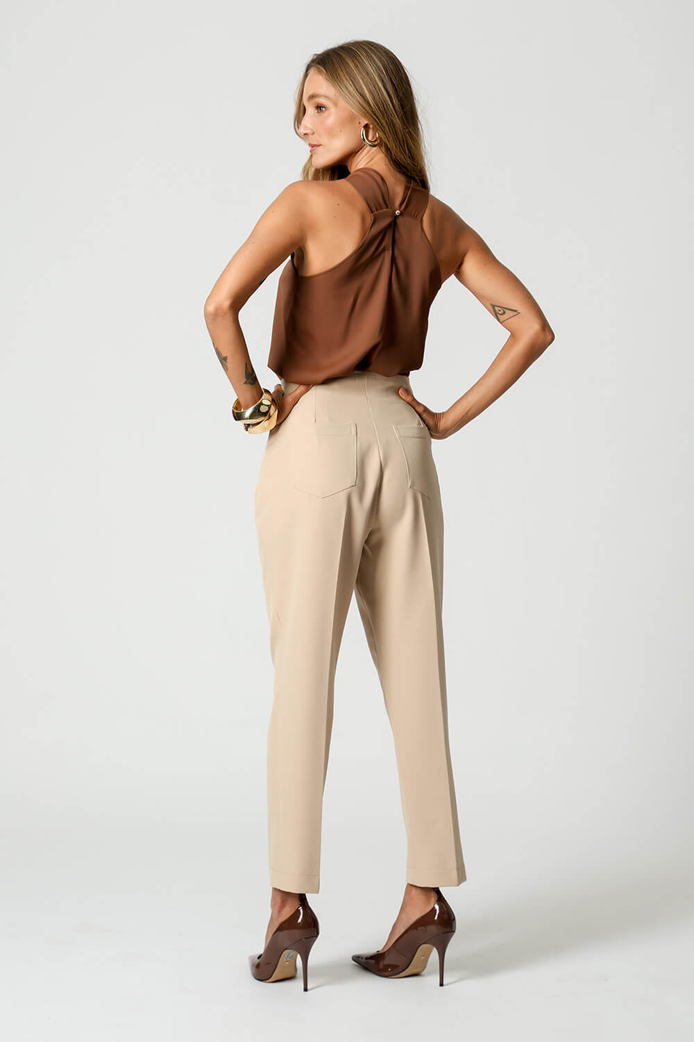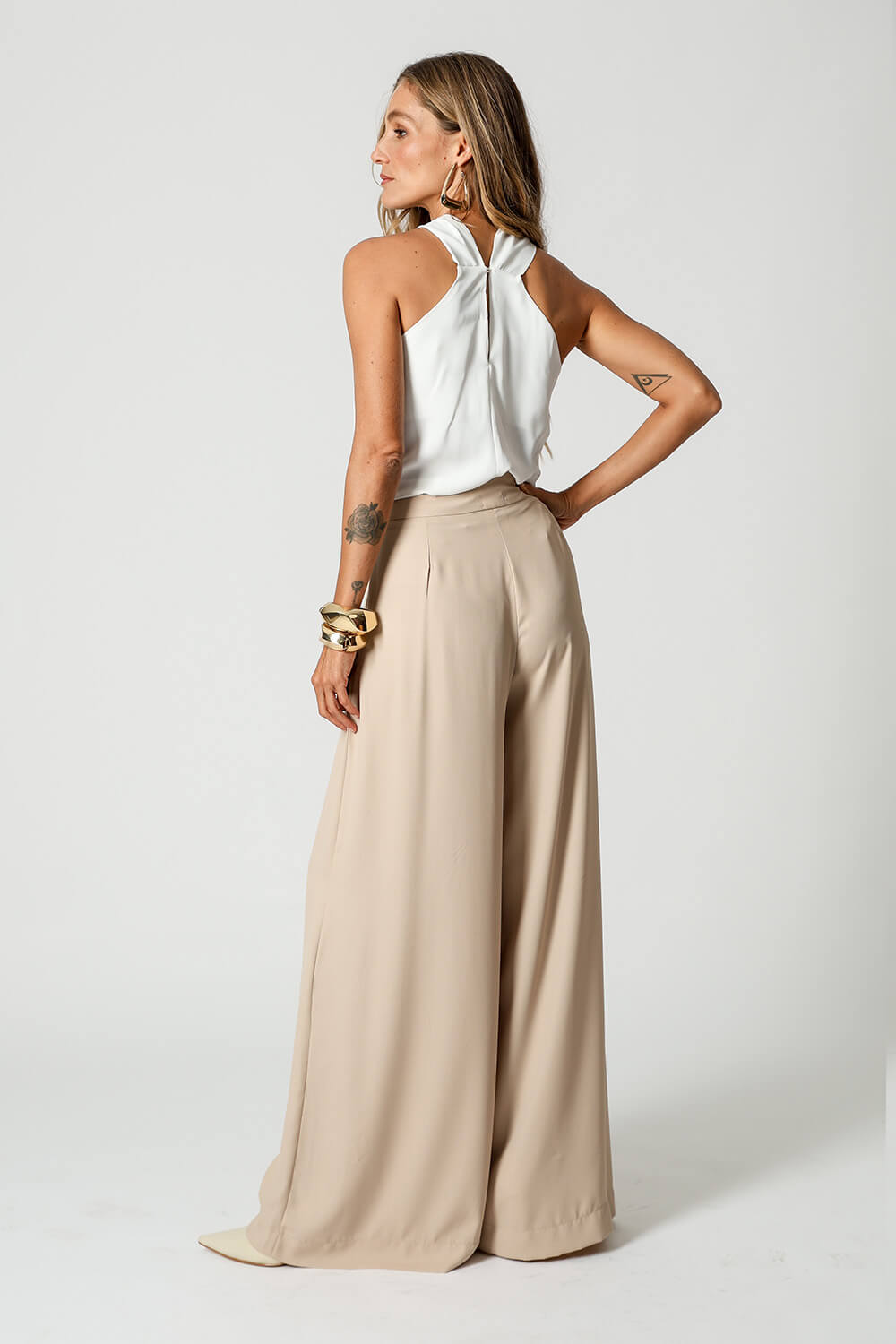 Fechamento com um botão dourado nas costas