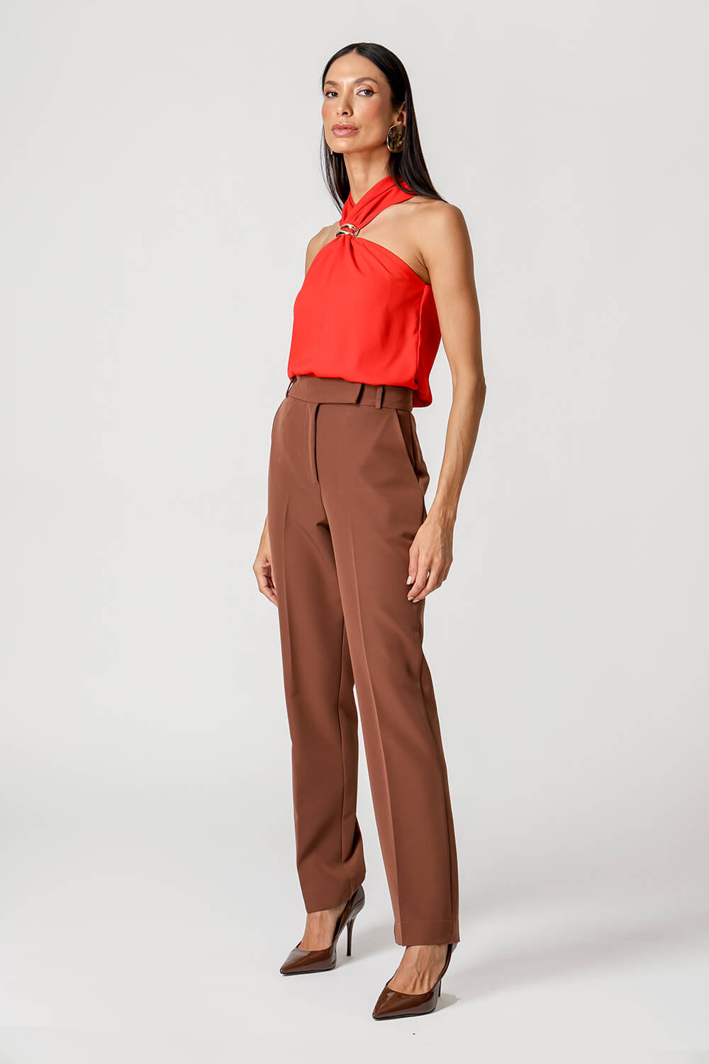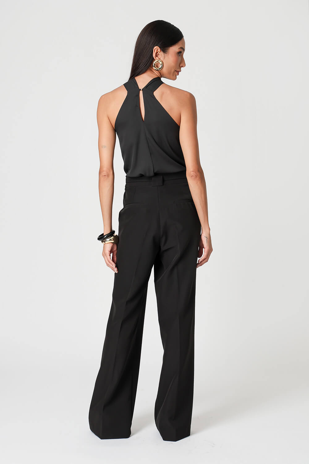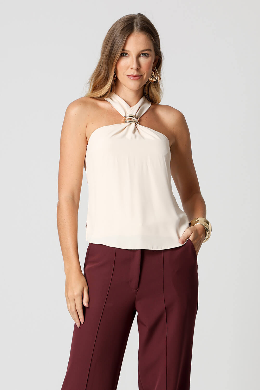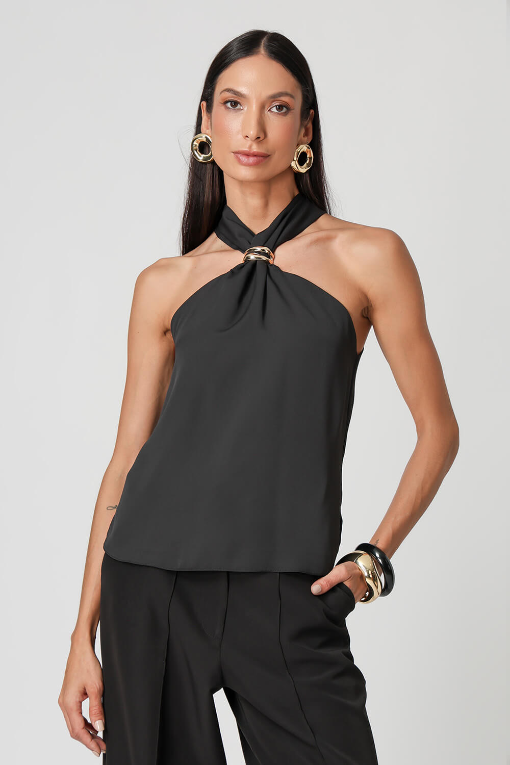 Blusa em crepe Segall com alças largas e detalhe de fivela no decote. Moderna e elegante, é perfeita para compor looks versáteis e sofisticados.