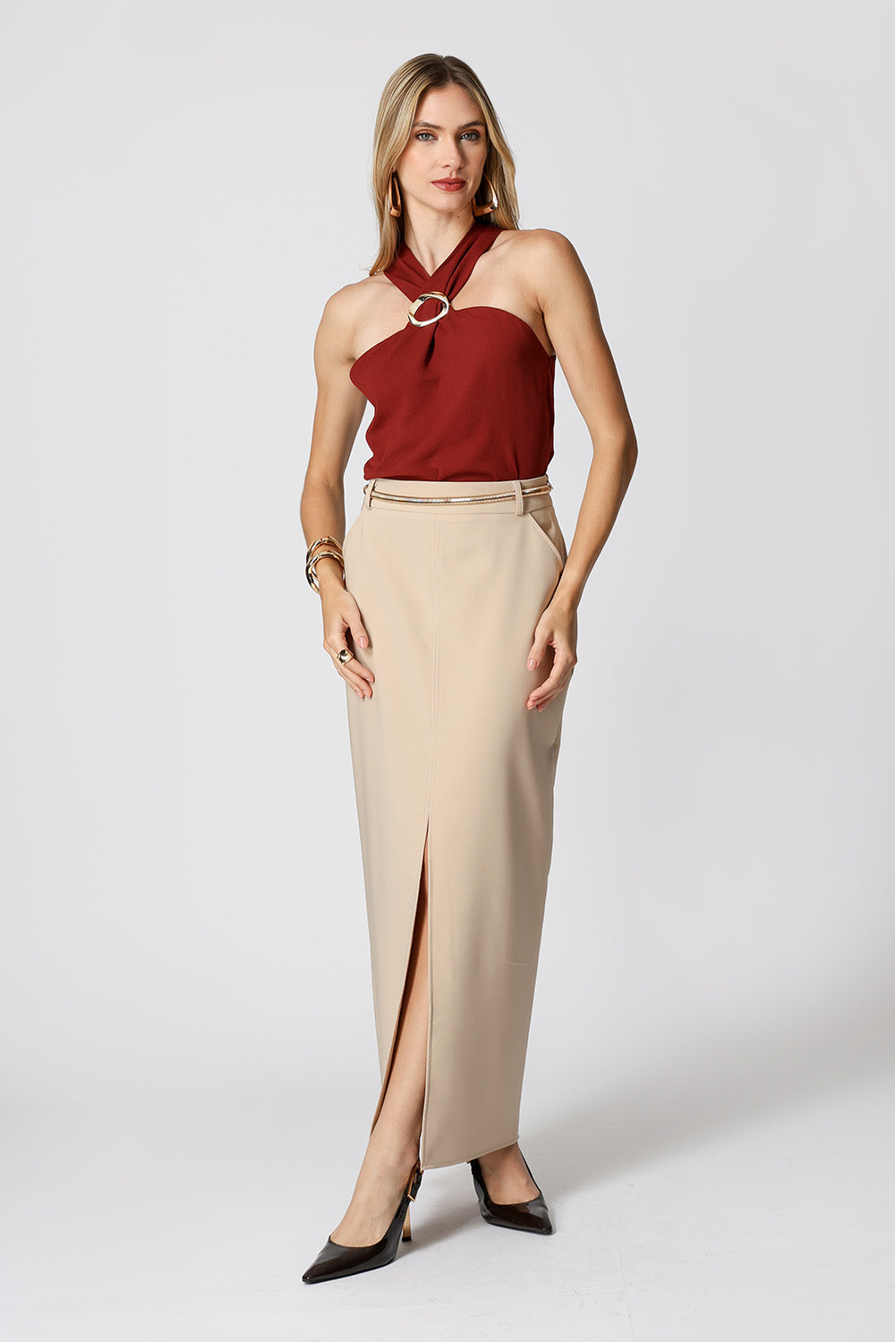 Blusa con hebilla metálica en el escote. Elegante pieza ideal para combinar looks de trabajo.