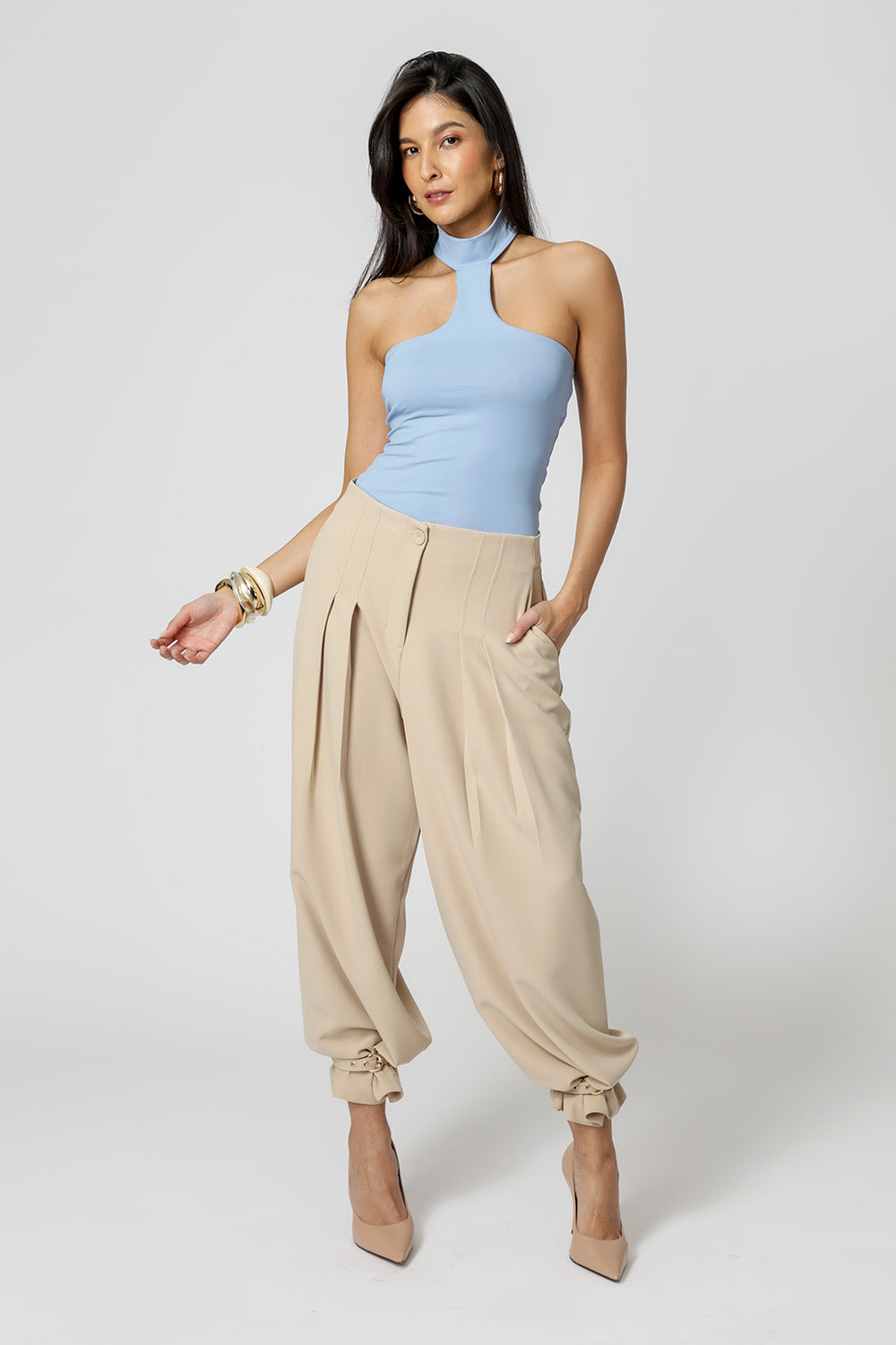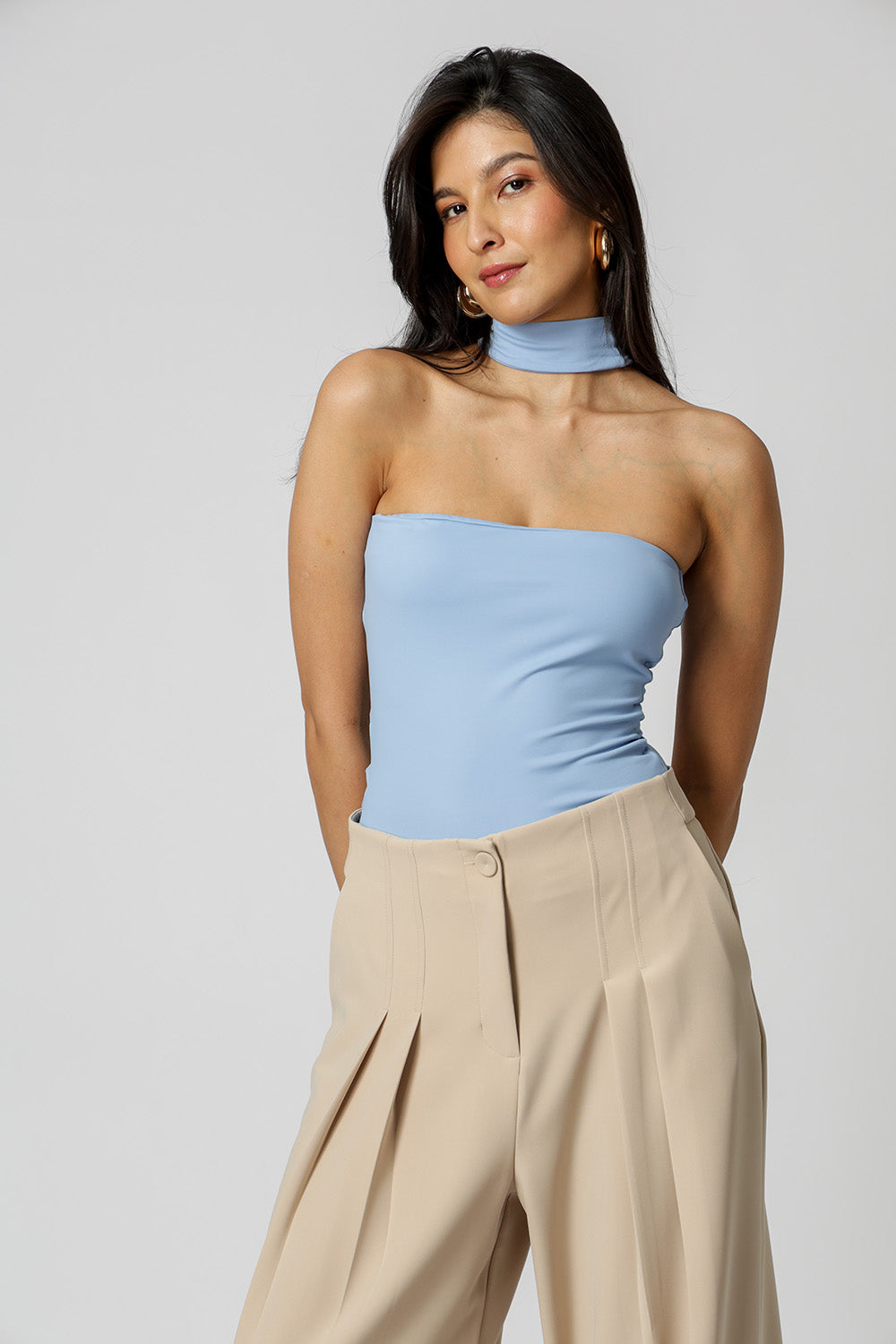 Moderna e versátil, a blusa sem alça com gola alta é confeccionada em malha Amni, oferecendo toque macio, excelente elasticidade e caimento perfeito. Ideal para composições elegantes e estilosas em qualquer estação.