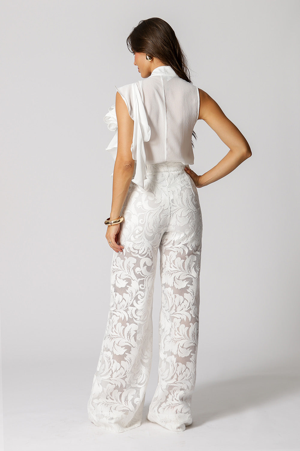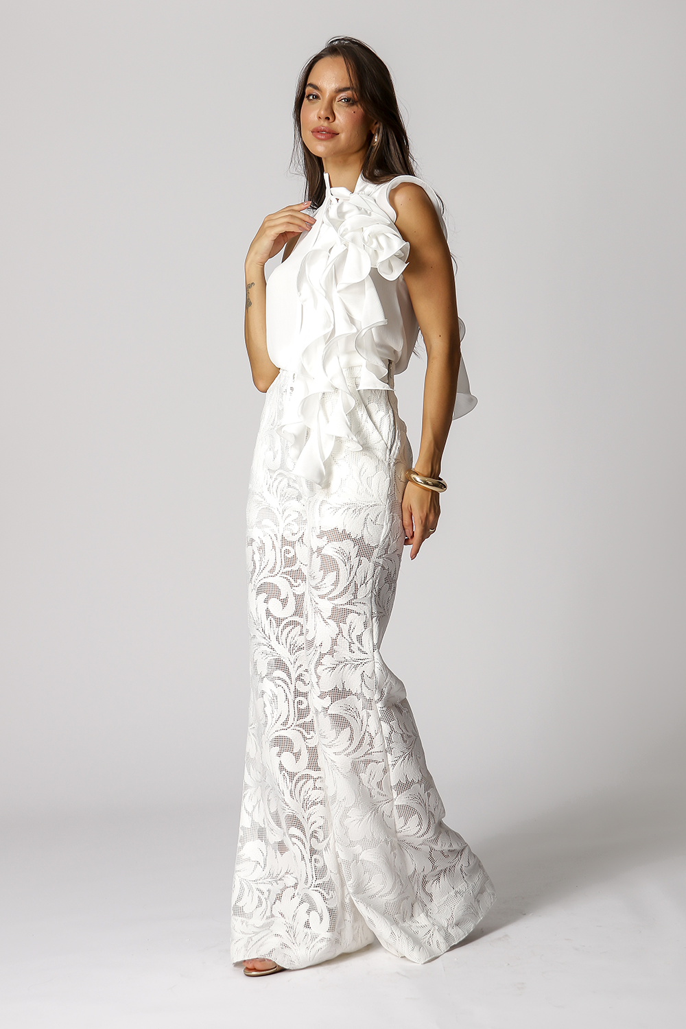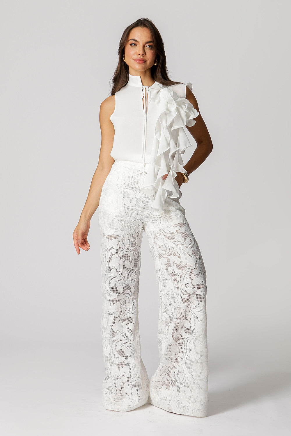 Blusa con cuello con volantes y flor. Fabricado en tejido crepé fluido. Una pieza de estilo delicado y perfecta para un ambiente casual.