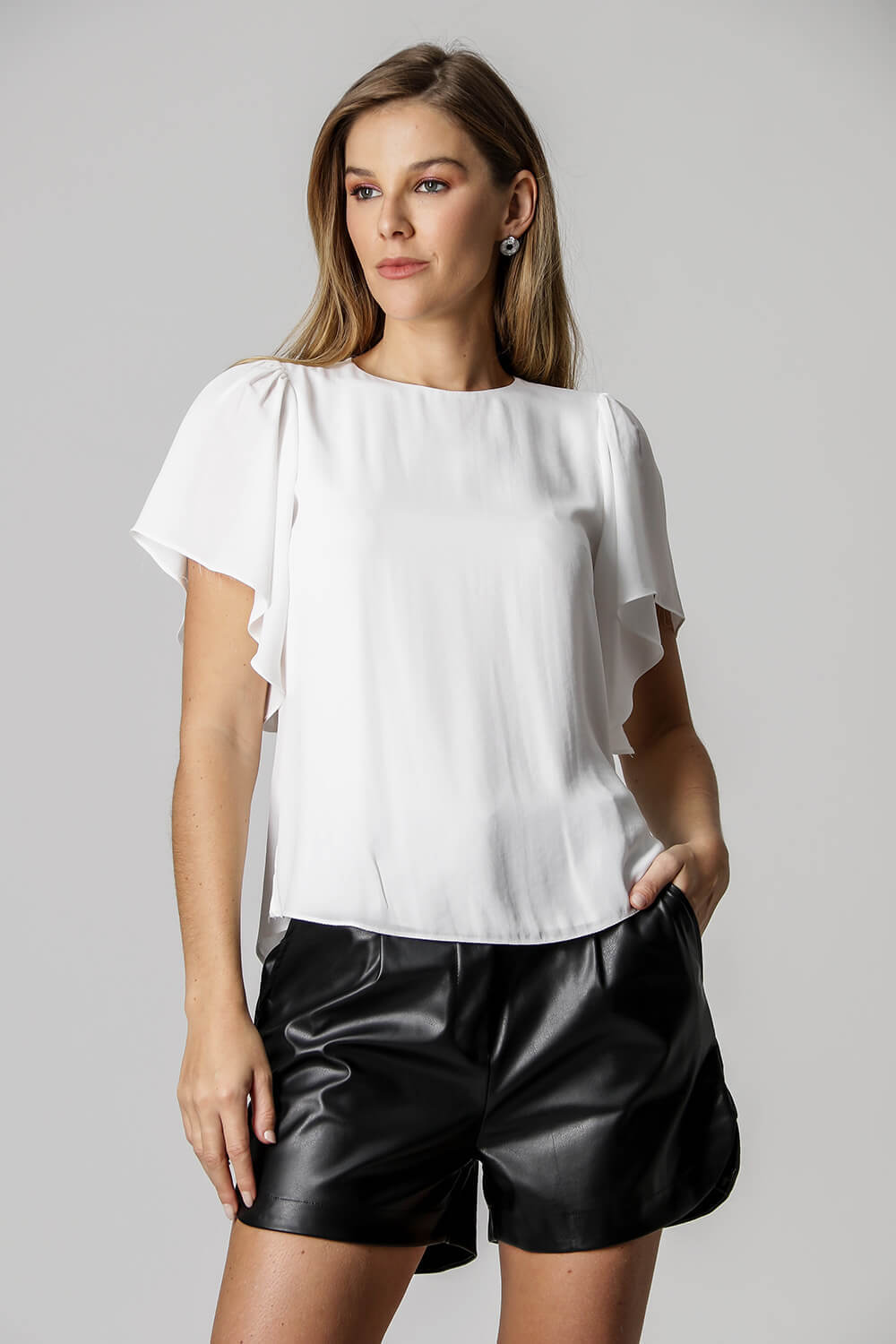 Blusa con cuello brillante y lazo desmontable, manga ángel con tira extra en contraste, pieza casual que permite diferentes formas de llevar.