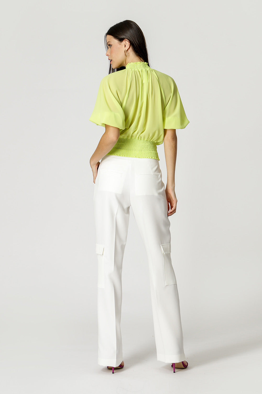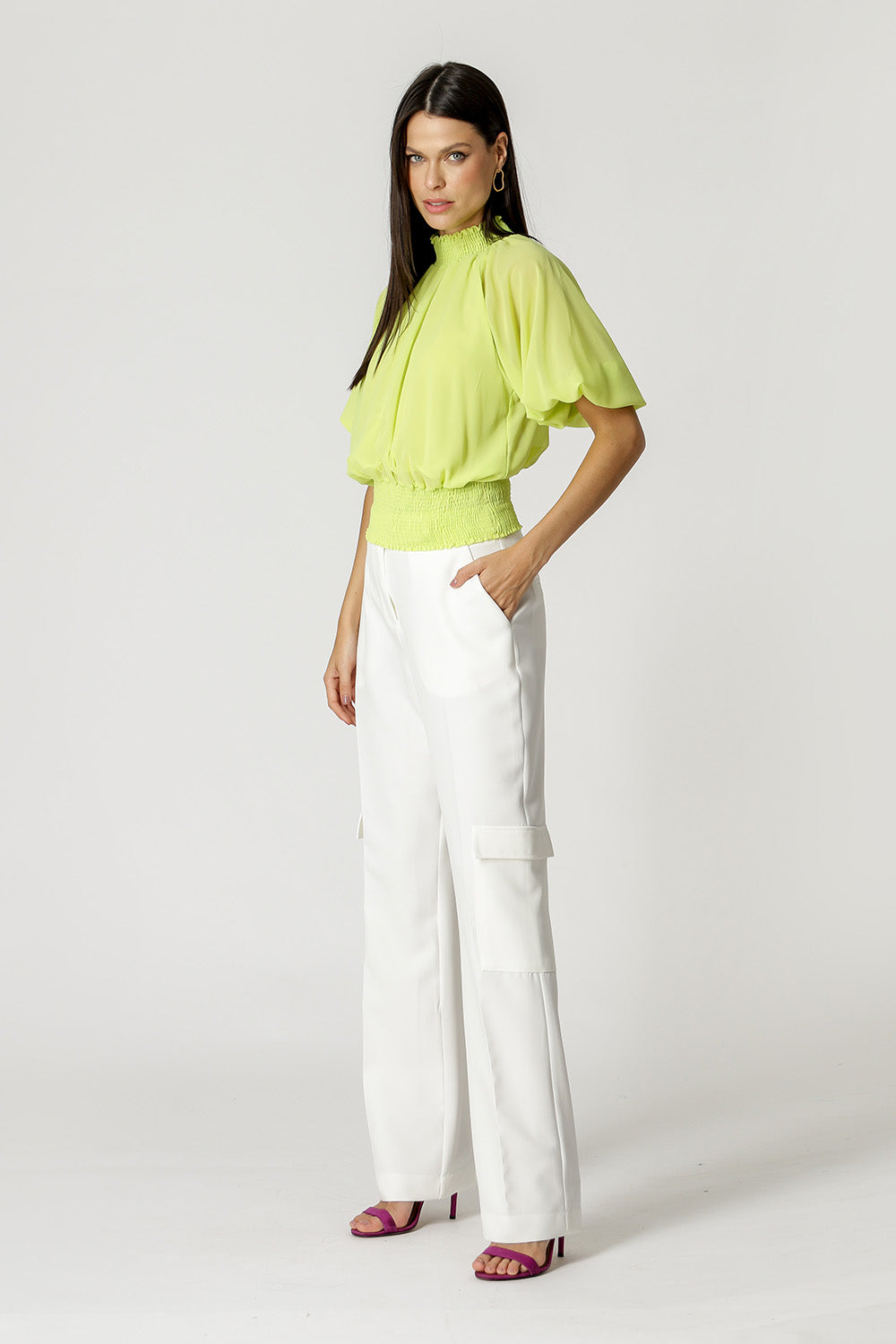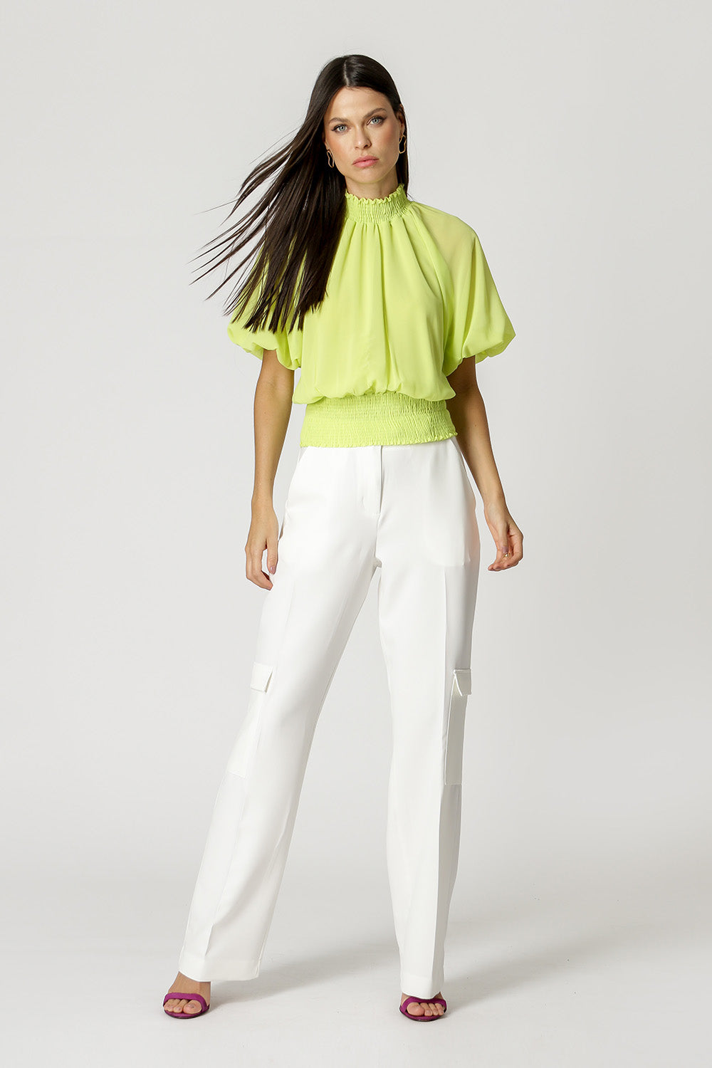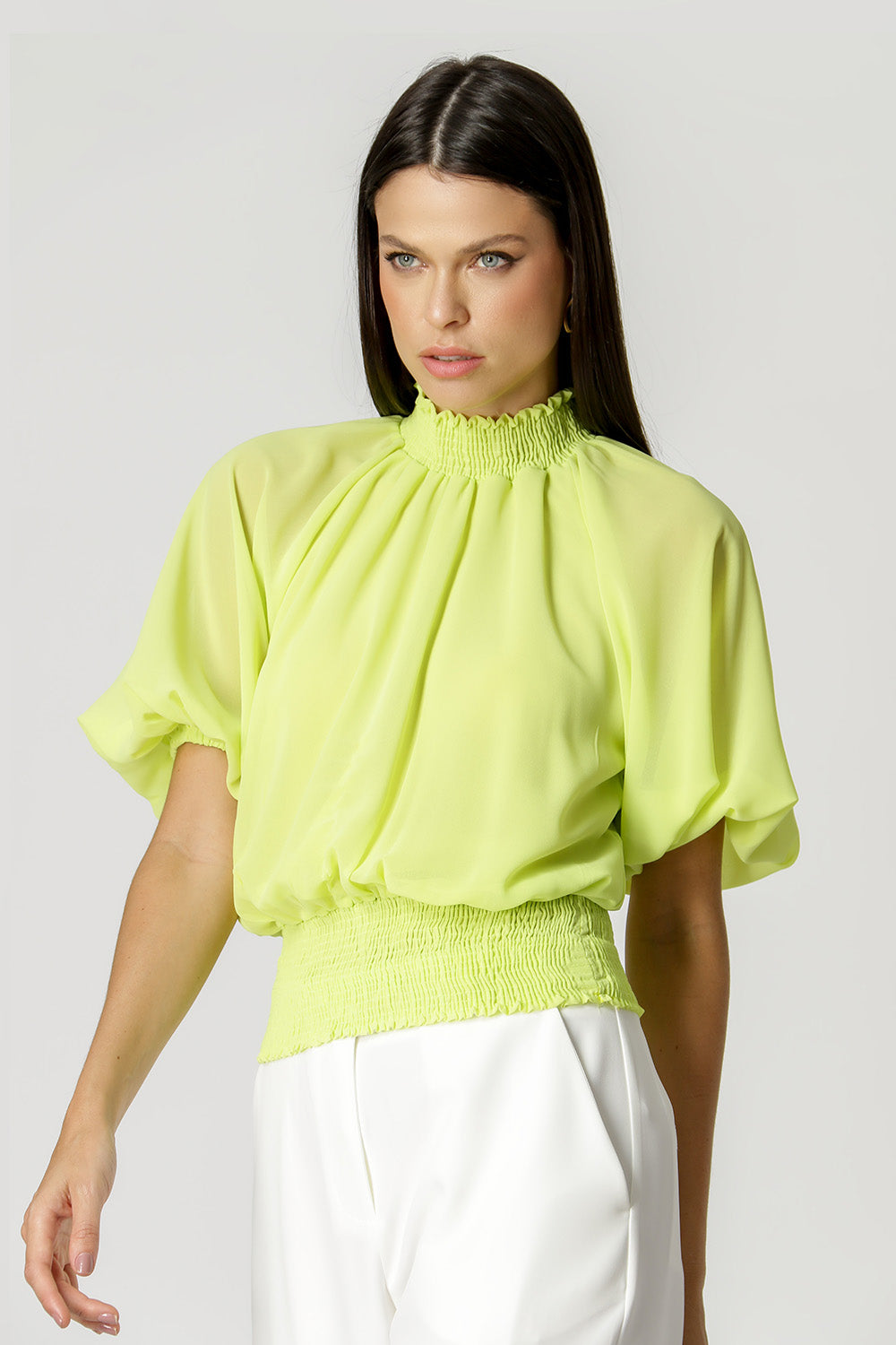 Blusa de cuello alto con bajo con detalles fruncidos con elástico. Pieza realizada en crepe ligero, pieza encantadora y ligera ideal para crear un look de trabajo.