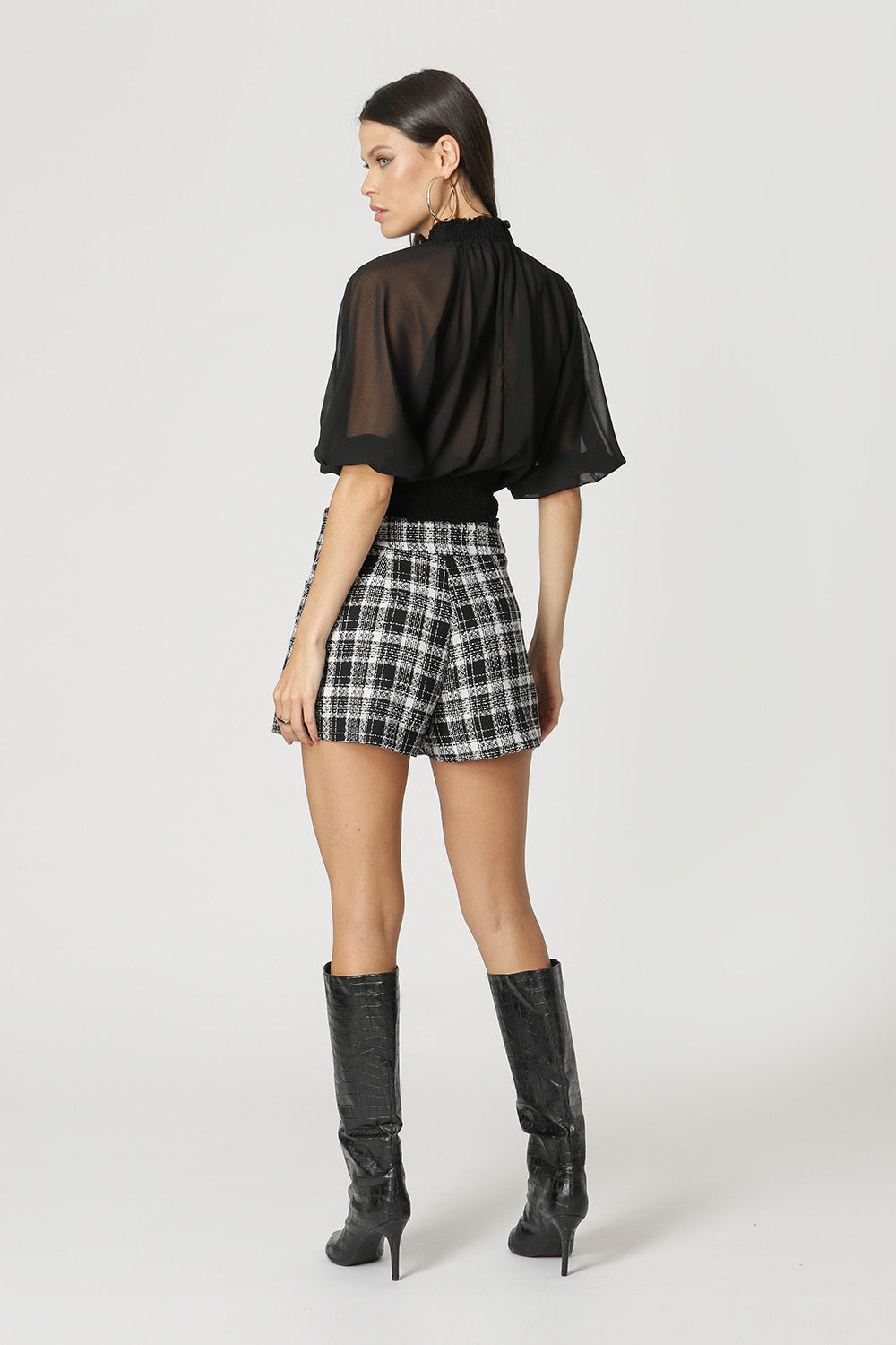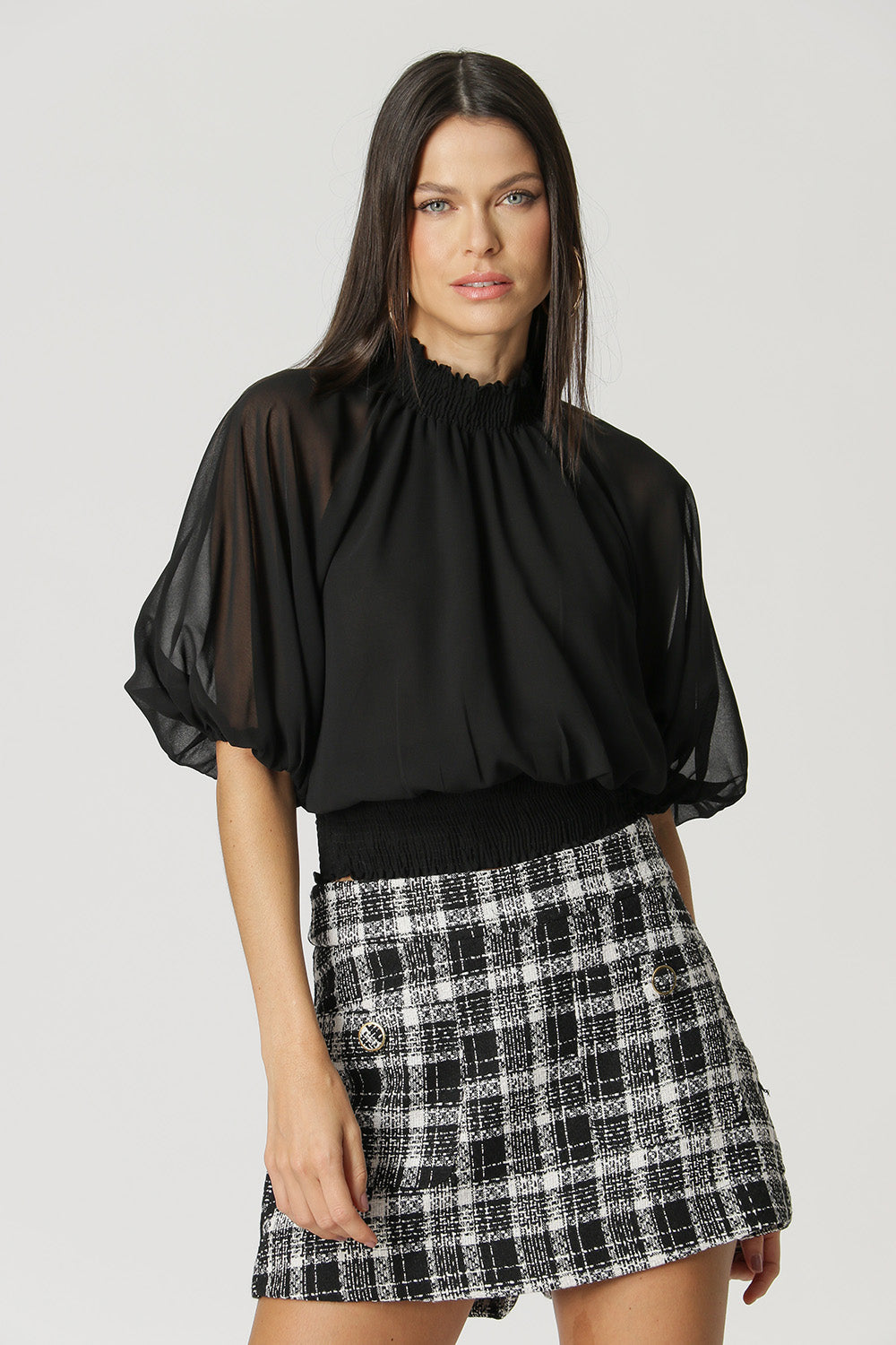 Blusa de cuello alto con bajo con detalles fruncidos con elástico. Pieza realizada en crepe ligero, pieza encantadora y ligera ideal para crear un look de trabajo.