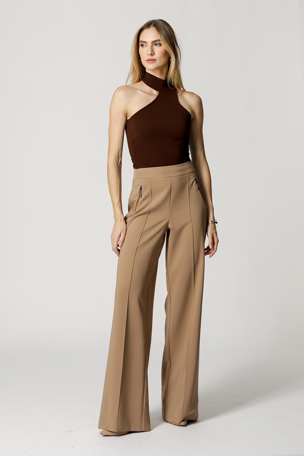 Blusa cropped de cuello medio y escote asimétrico, confeccionada en punto canalé fino, una pieza encantadora y práctica para una variedad de looks casuales.