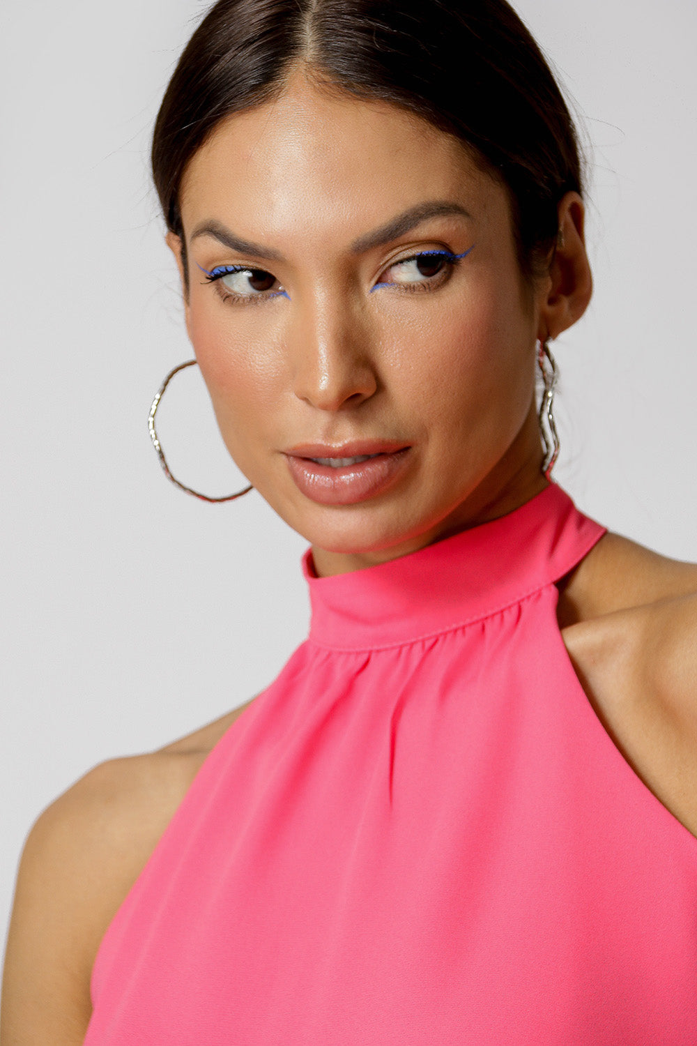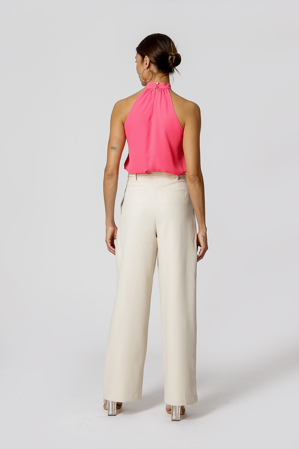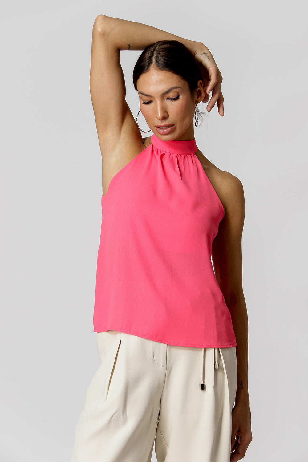 Blusa con escote y ligeros frunces en el cuello, cierre en la espalda con botones. Una pieza versátil y práctica para el trabajo diario que realza una variedad de looks.
