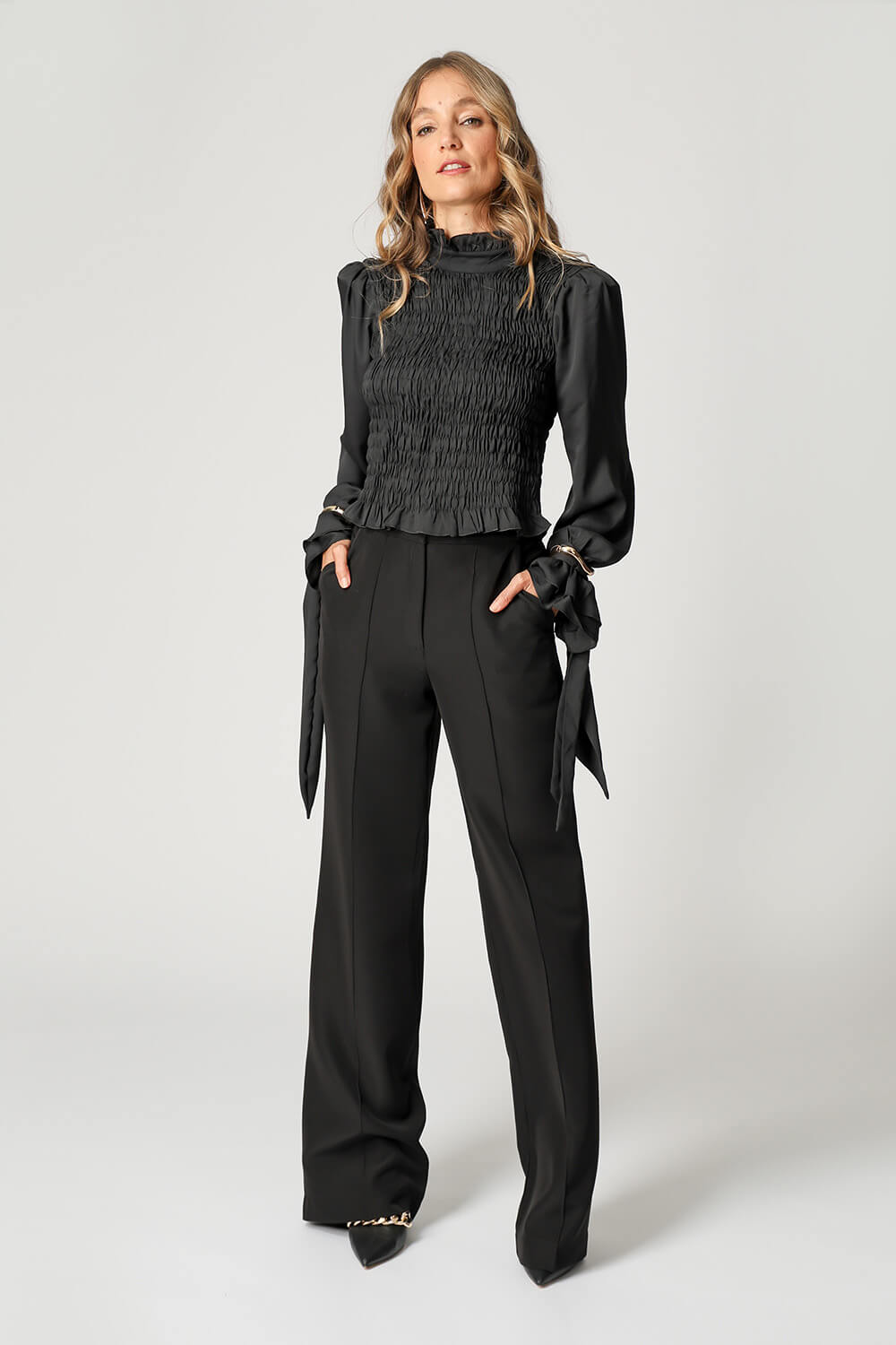 Delicada y llena de encanto, esta blusa fluida de crepé tiene elástico en todo el cuerpo, lo que garantiza un ajuste cómodo. Un toque delicado para looks elegantes y femeninos. Versátil, se puede utilizar en looks casuales o más sofisticados, dependiendo de la composición.