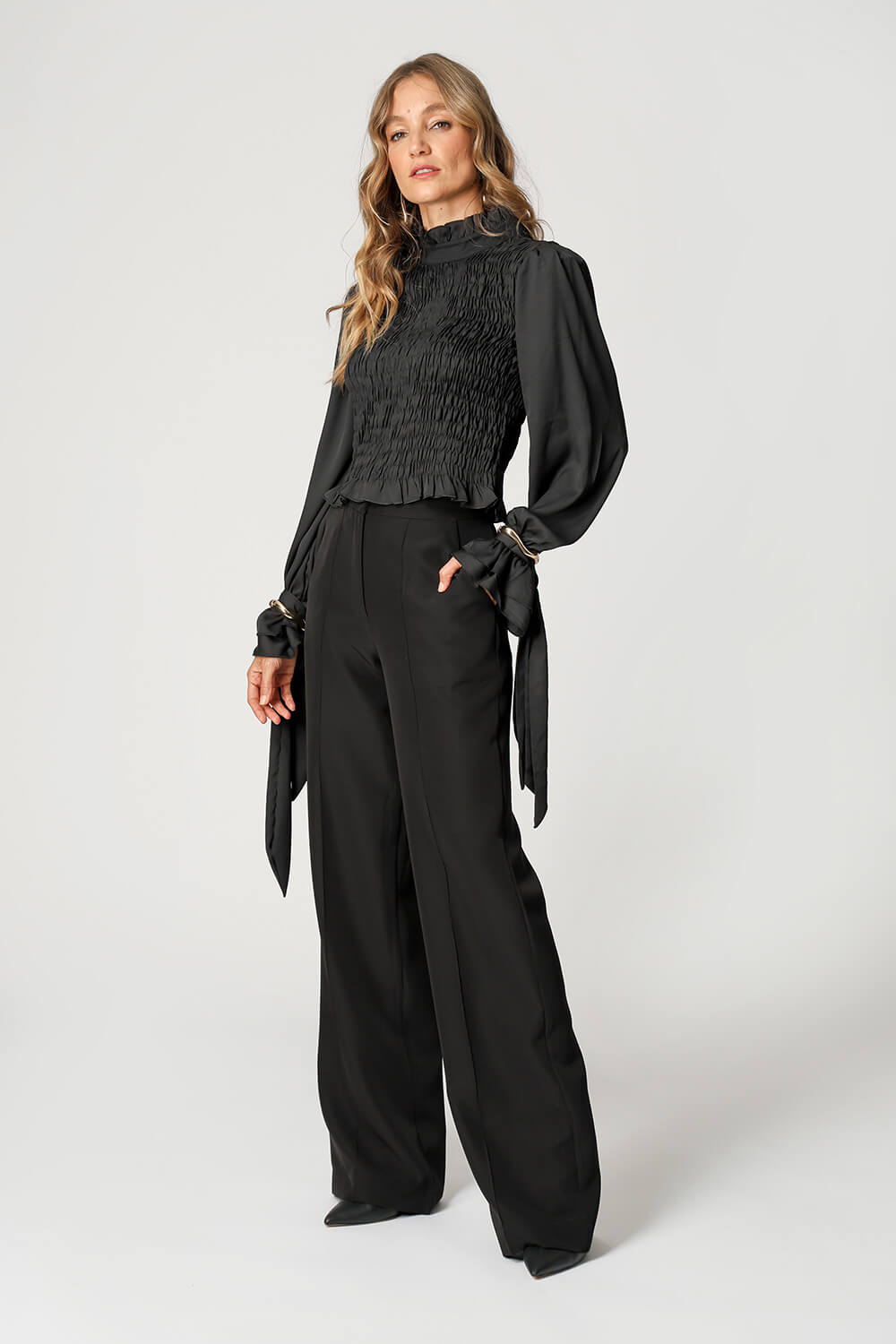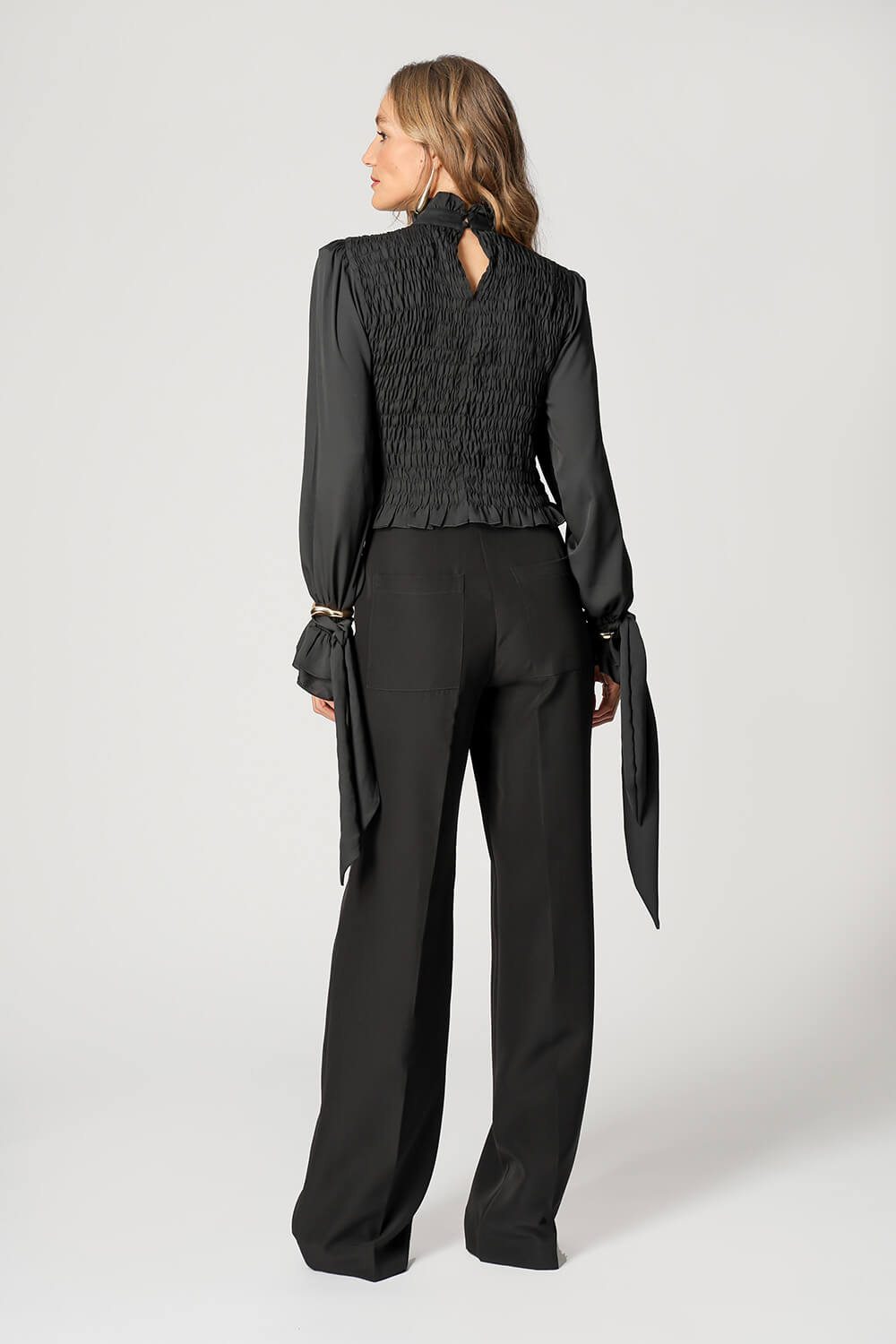 Lleva puños rematados con lazo y drapeado elástico en el cuerpo.