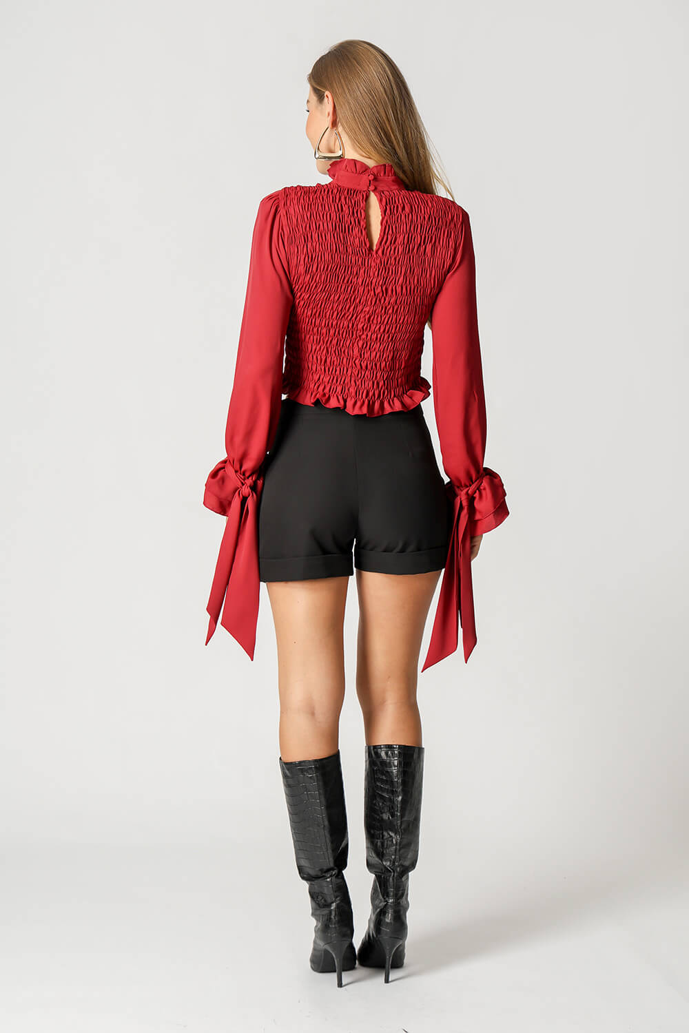 Lleva puños rematados con lazo y drapeado elástico en el cuerpo.