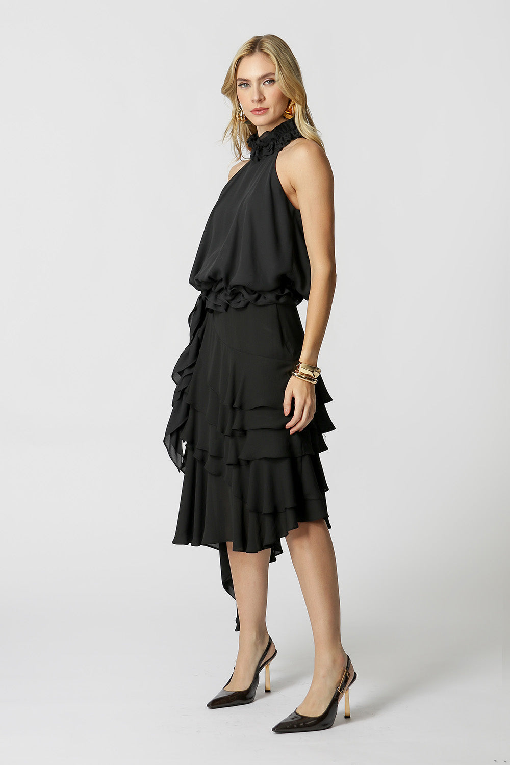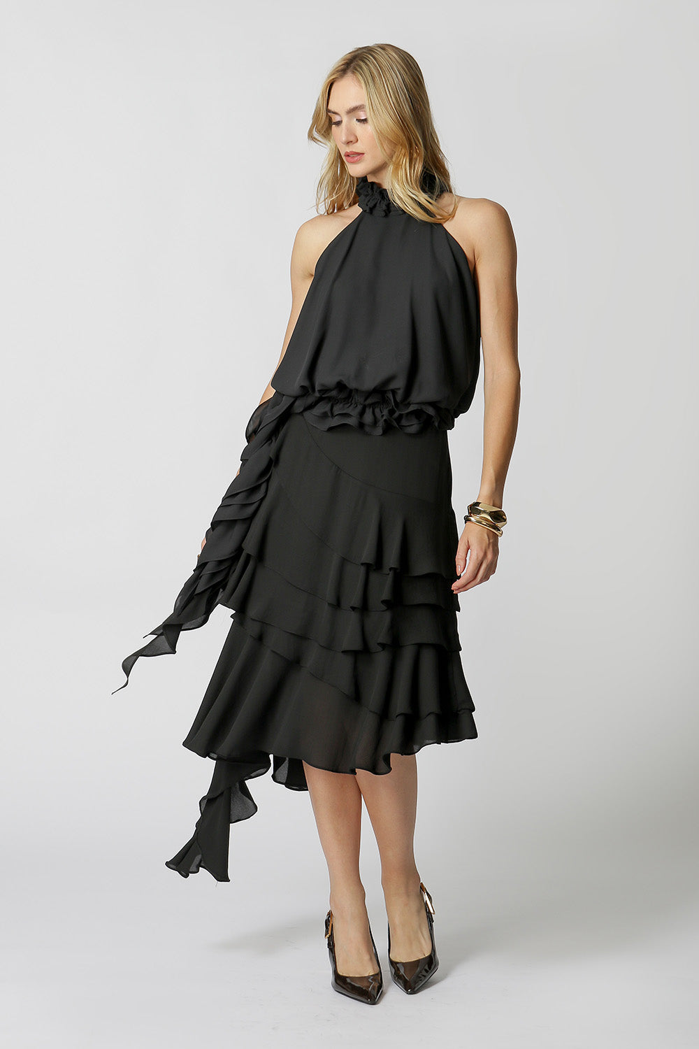 Blusa globo corta con cuello con volantes, viene con una bufanda con volantes desmontable. Una pieza llena de personalidad, ¡apuesta por ella!