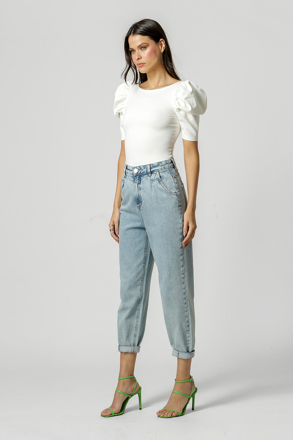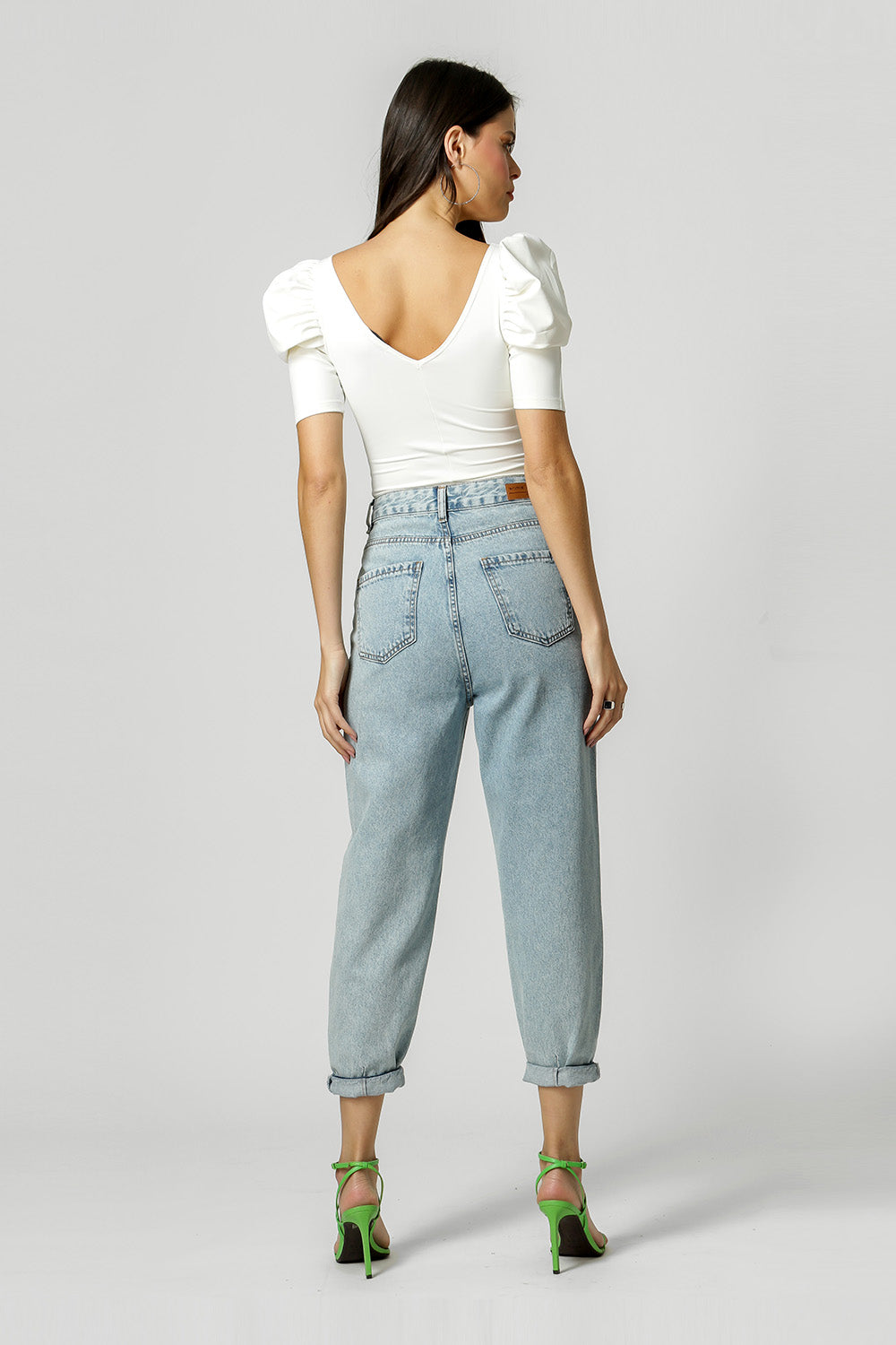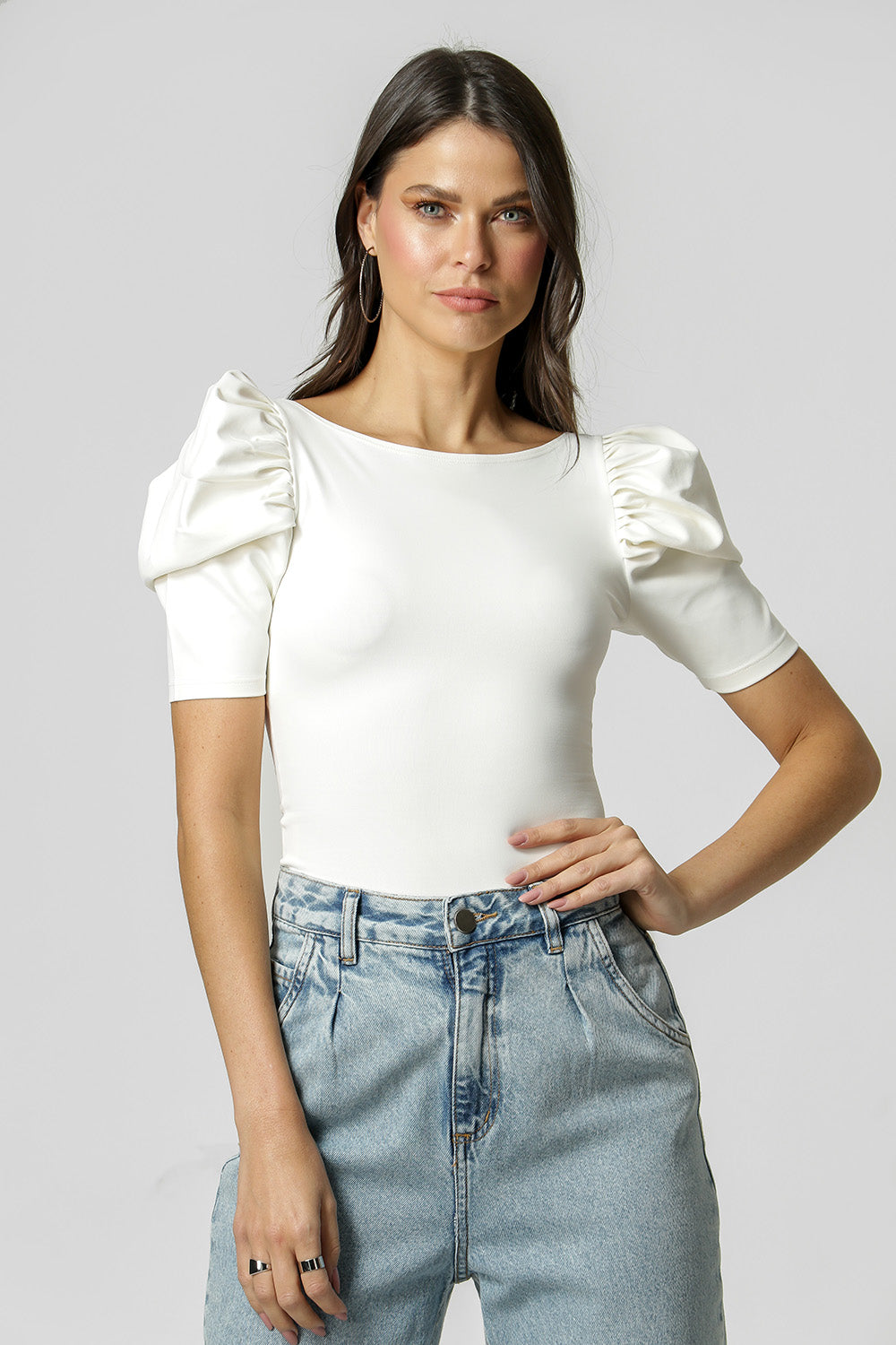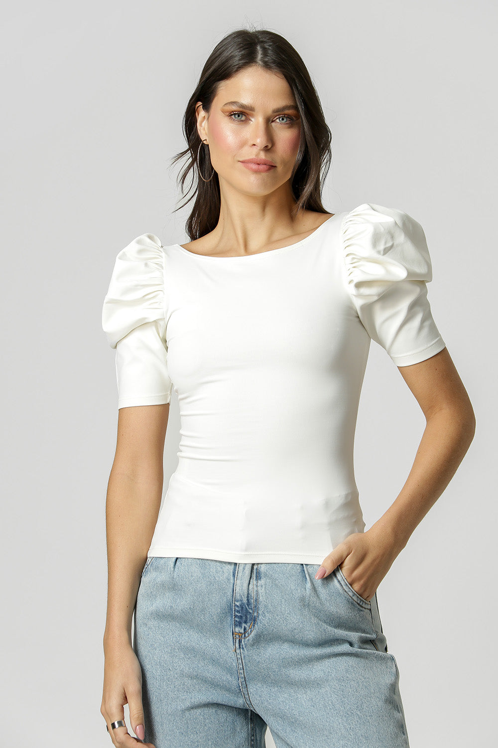 Blusa de corte más ajustado al cuerpo, mangas abullonadas con pliegues y escote en pico en la espalda. Realizado en tejido amni. ¡Para llevar con cualquier look casual!