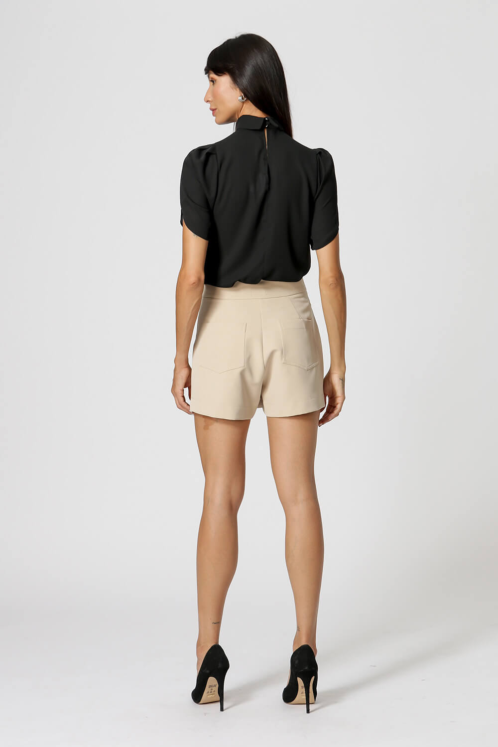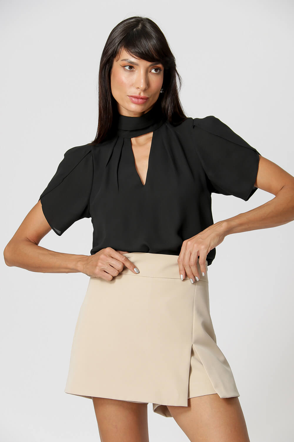 Blusa con cuello vuelto, escote en pico y mangas tulipán. Pieza confeccionada en tejido crepe fluido, un modelo delicado y elegante, perfecto para ocasiones laborales.