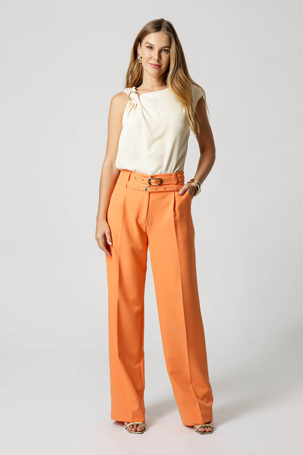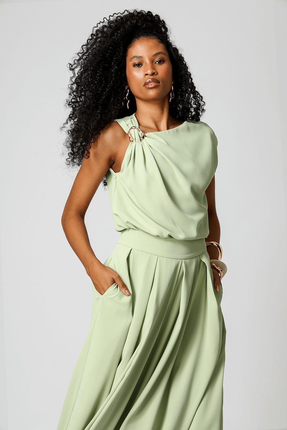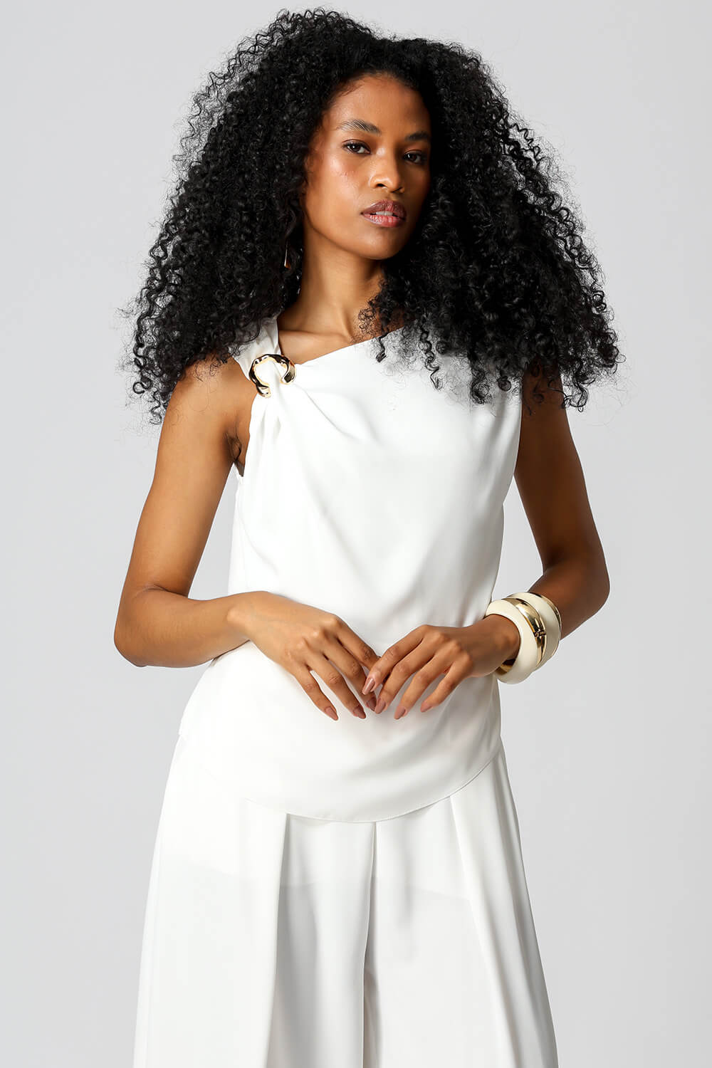 Blusa em crepe Segall com detalhe de metal dourado oval abaulado, que traz um toque de sofisticação ao visual. Elegante e moderna, ideal para produções versáteis.