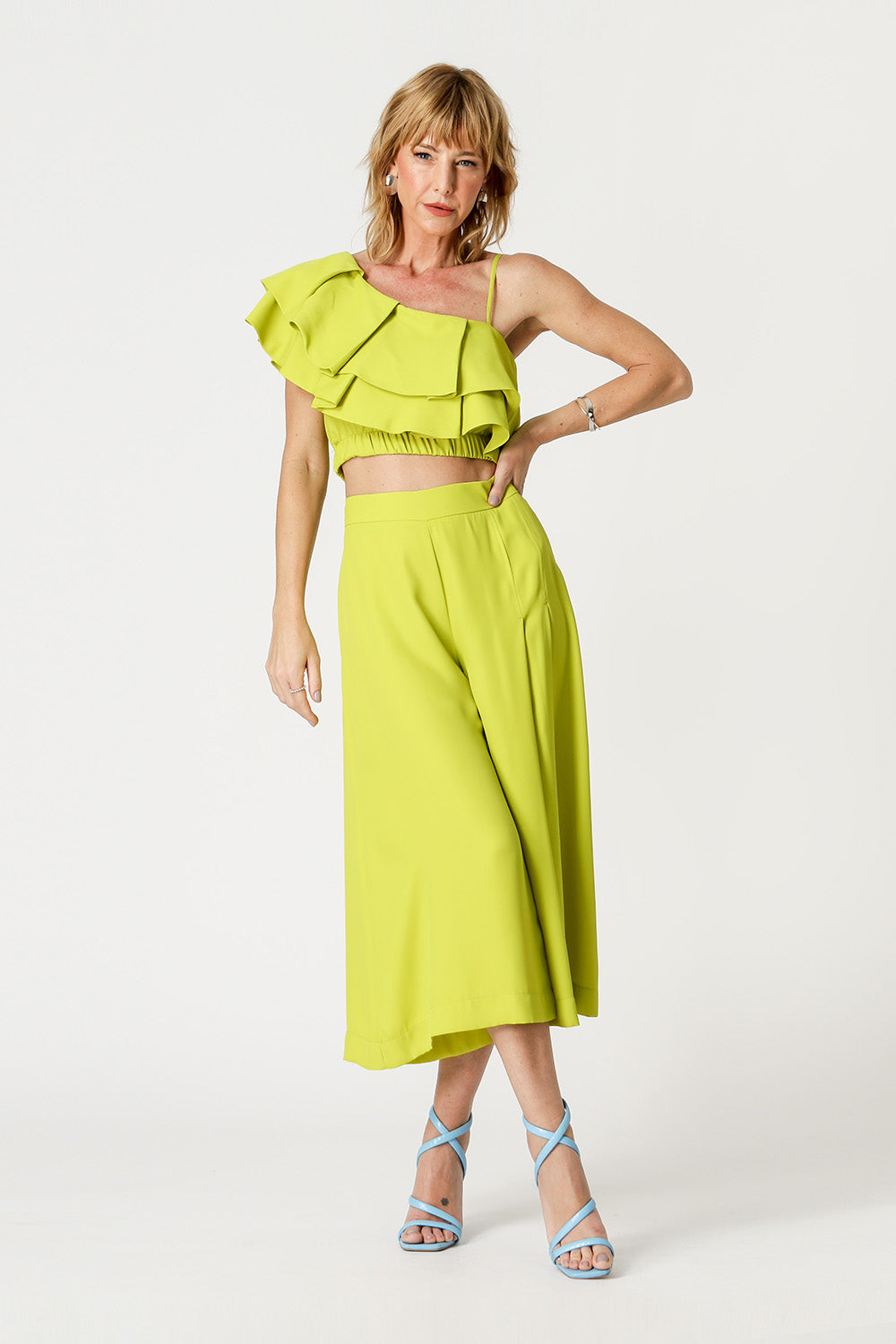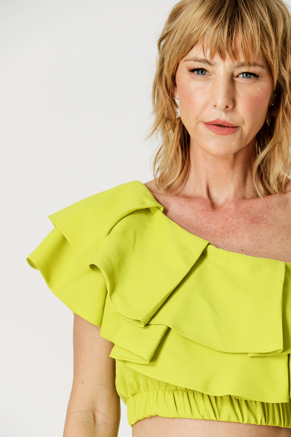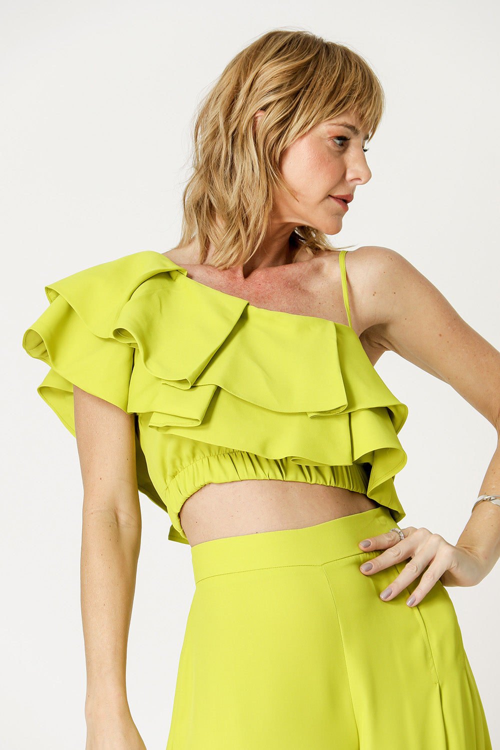 Blusa de un solo hombro con detalle de volante. Modelo de forma fluida y confeccionado en crepe. Ideal para un look casual chic.