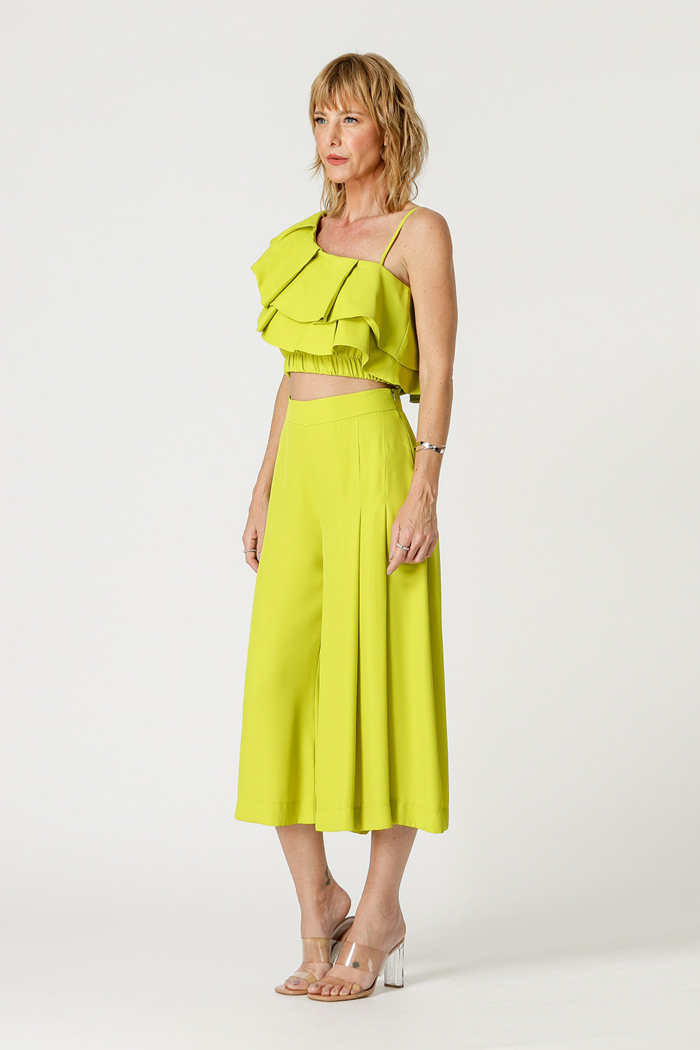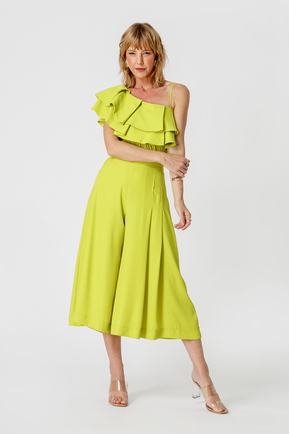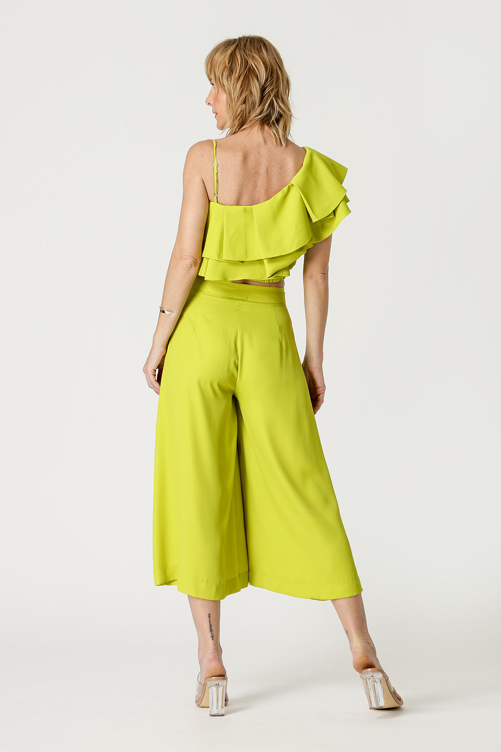 Blusa de un solo hombro con detalle de volante. Modelo de forma fluida y confeccionado en crepe. Ideal para un look casual chic.