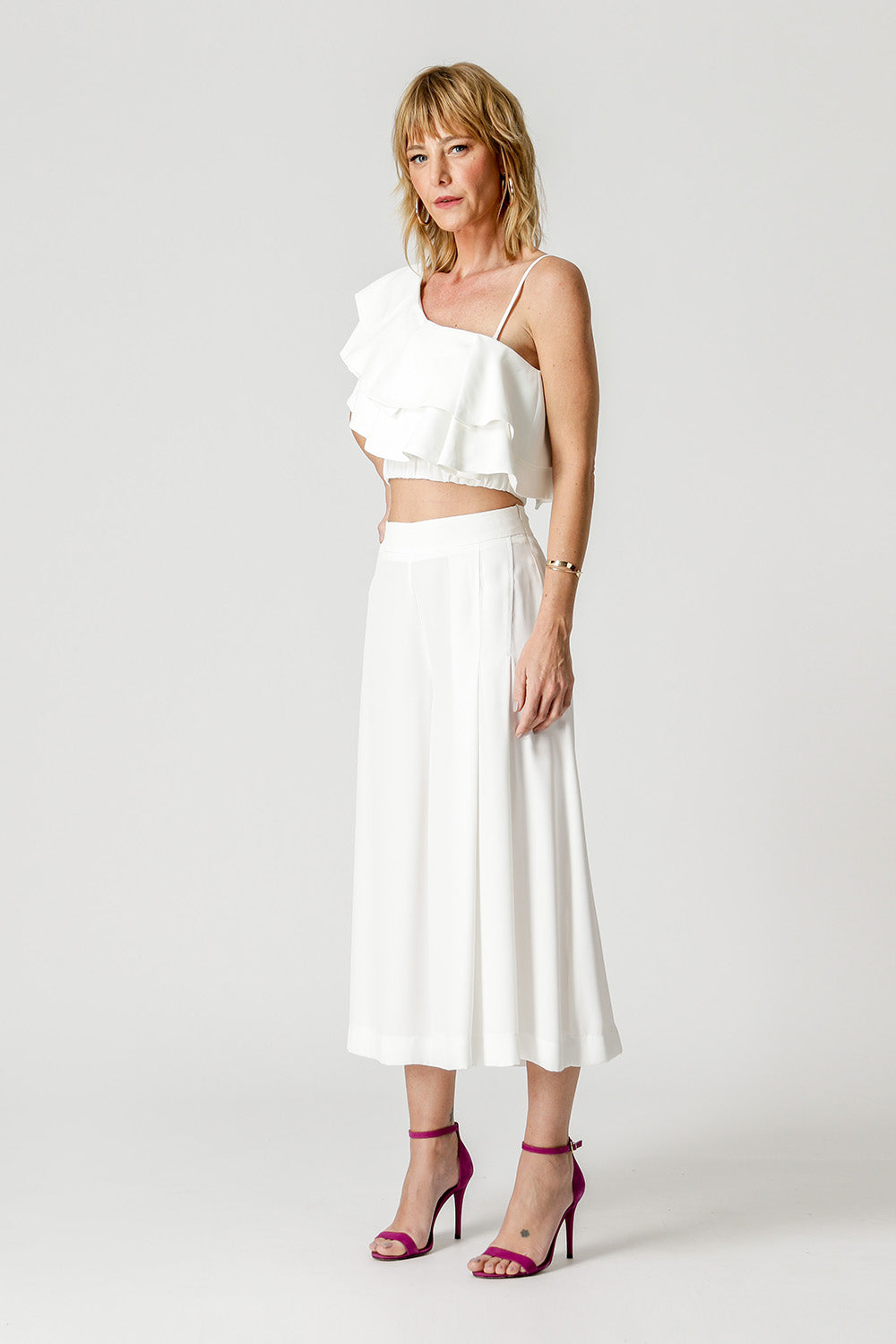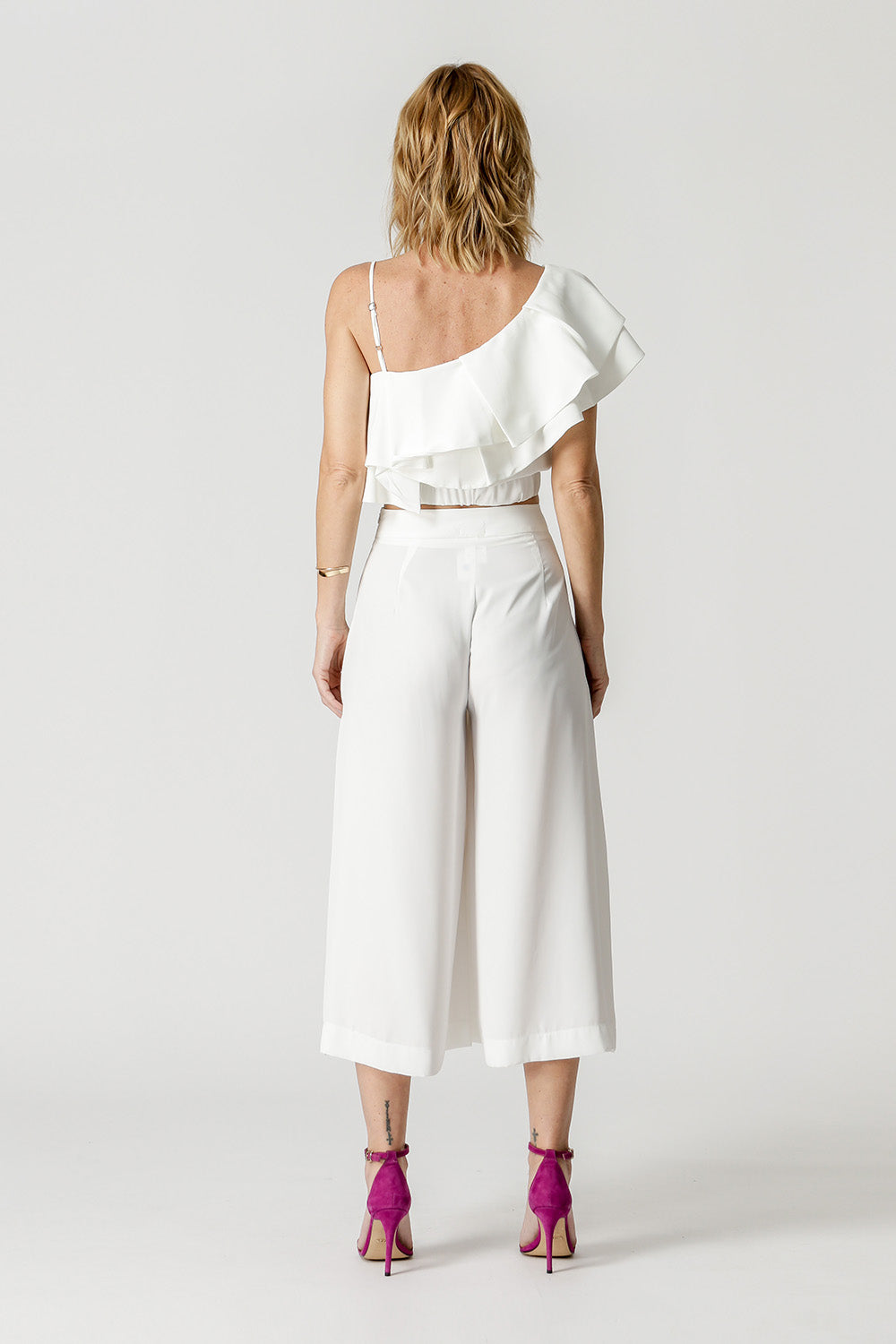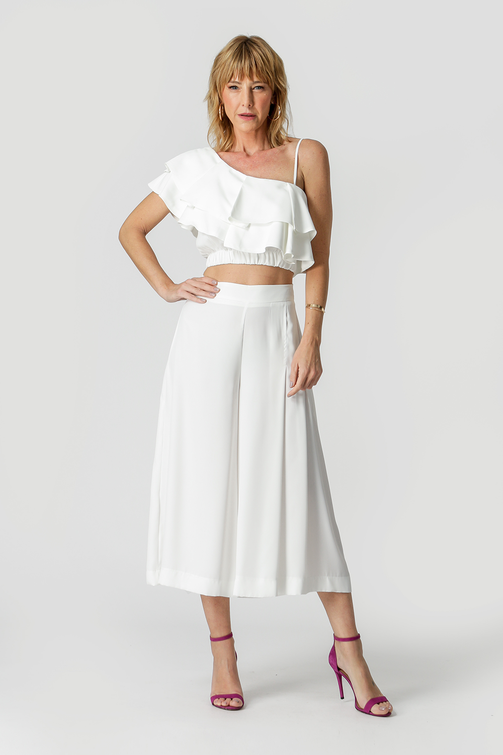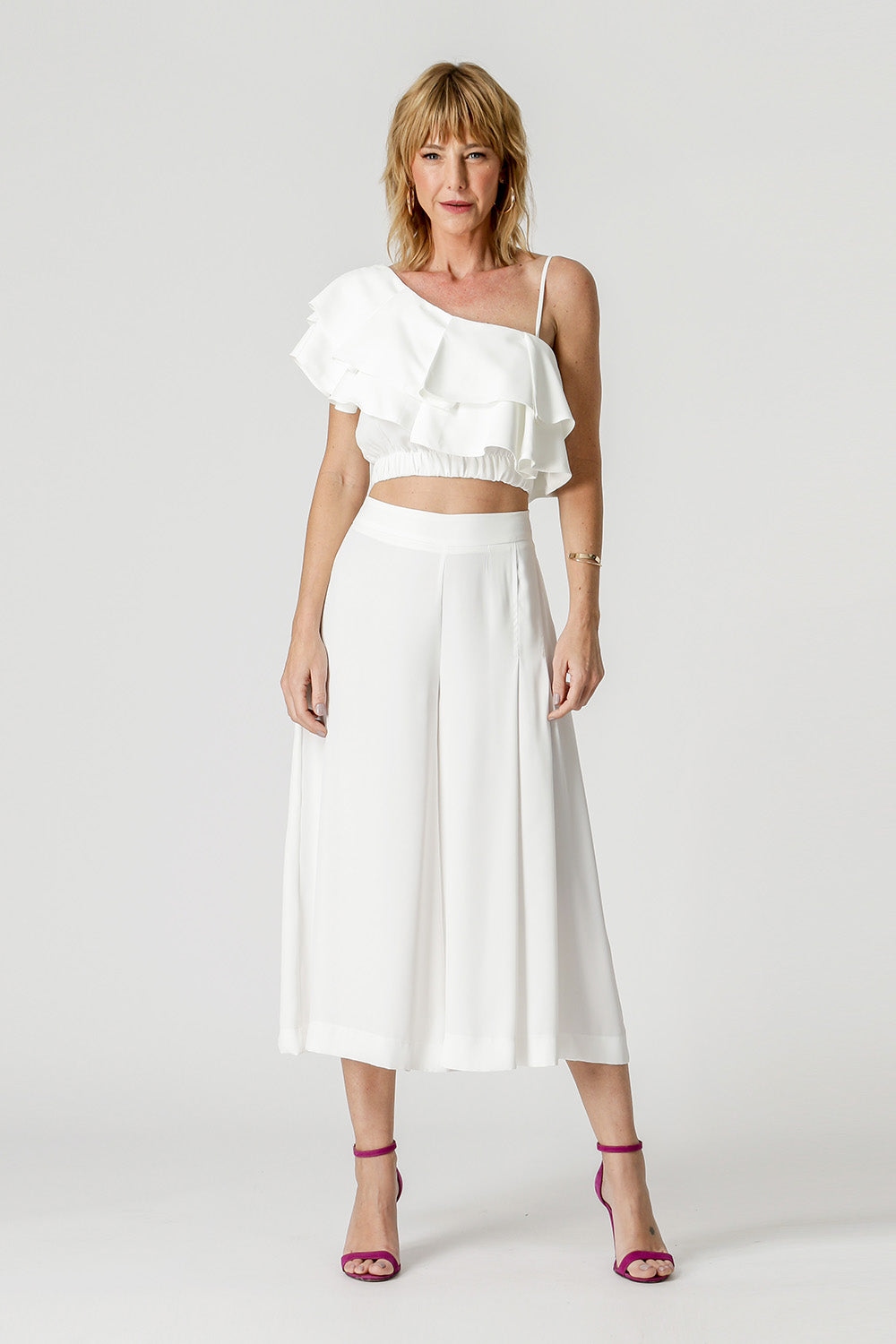 Blusa de un solo hombro con detalle de volante. Modelo de forma fluida y confeccionado en crepe. Ideal para un look casual chic.