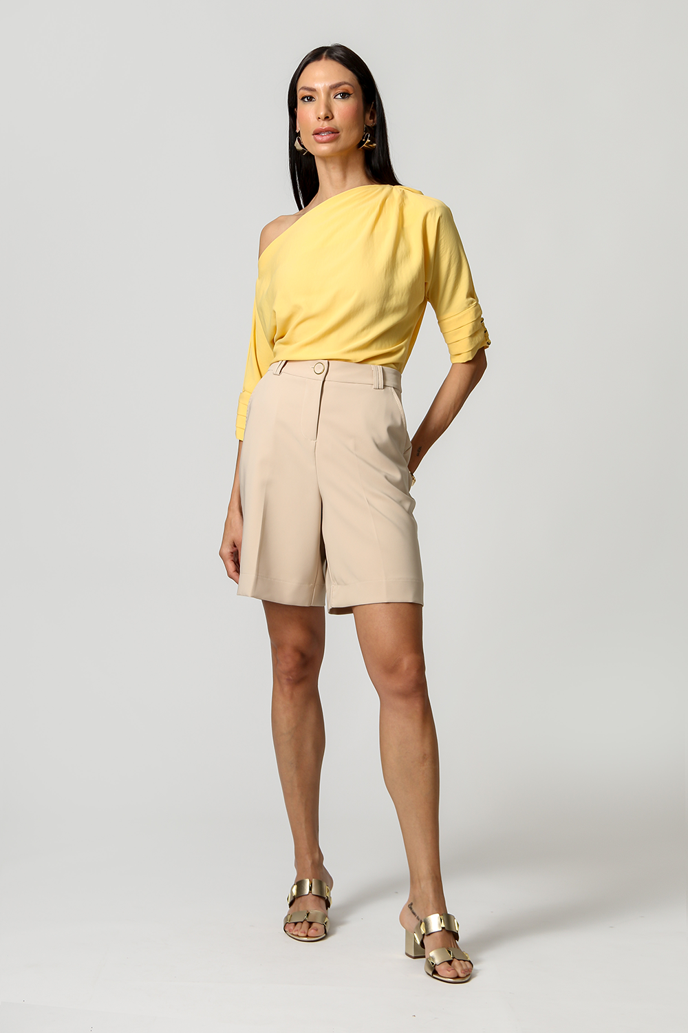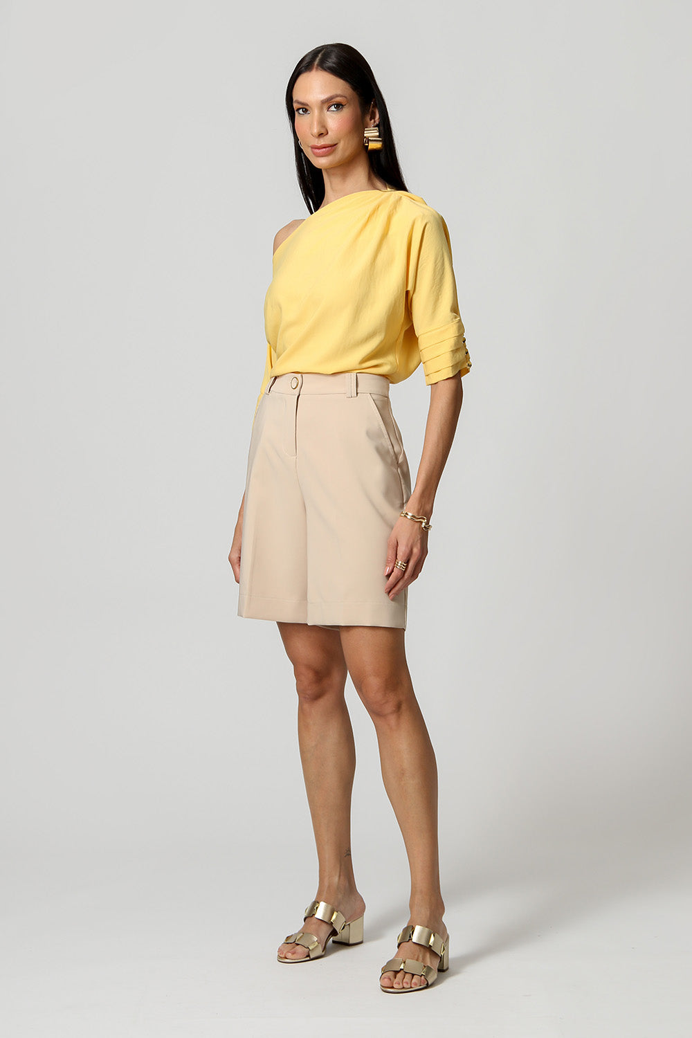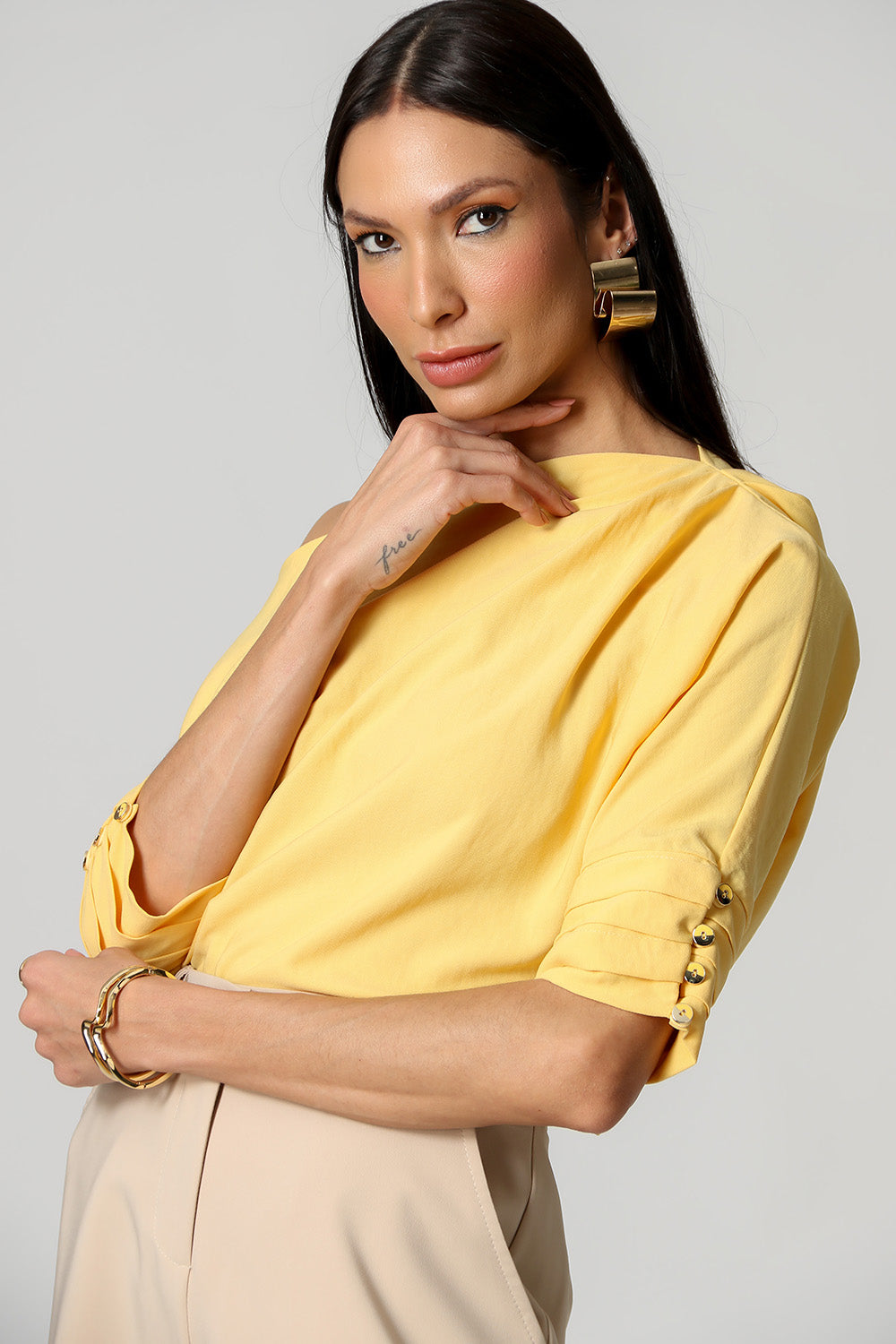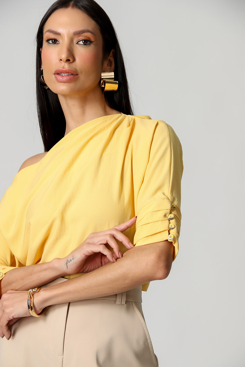 Blusa de corte casual, mangas murciélago y escote asimétrico, una pieza práctica y cómoda para un look casual.