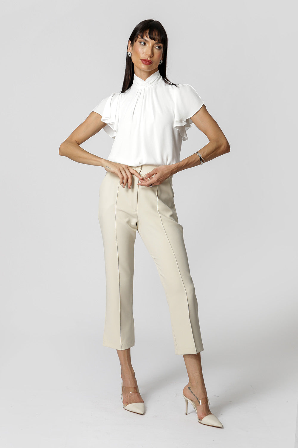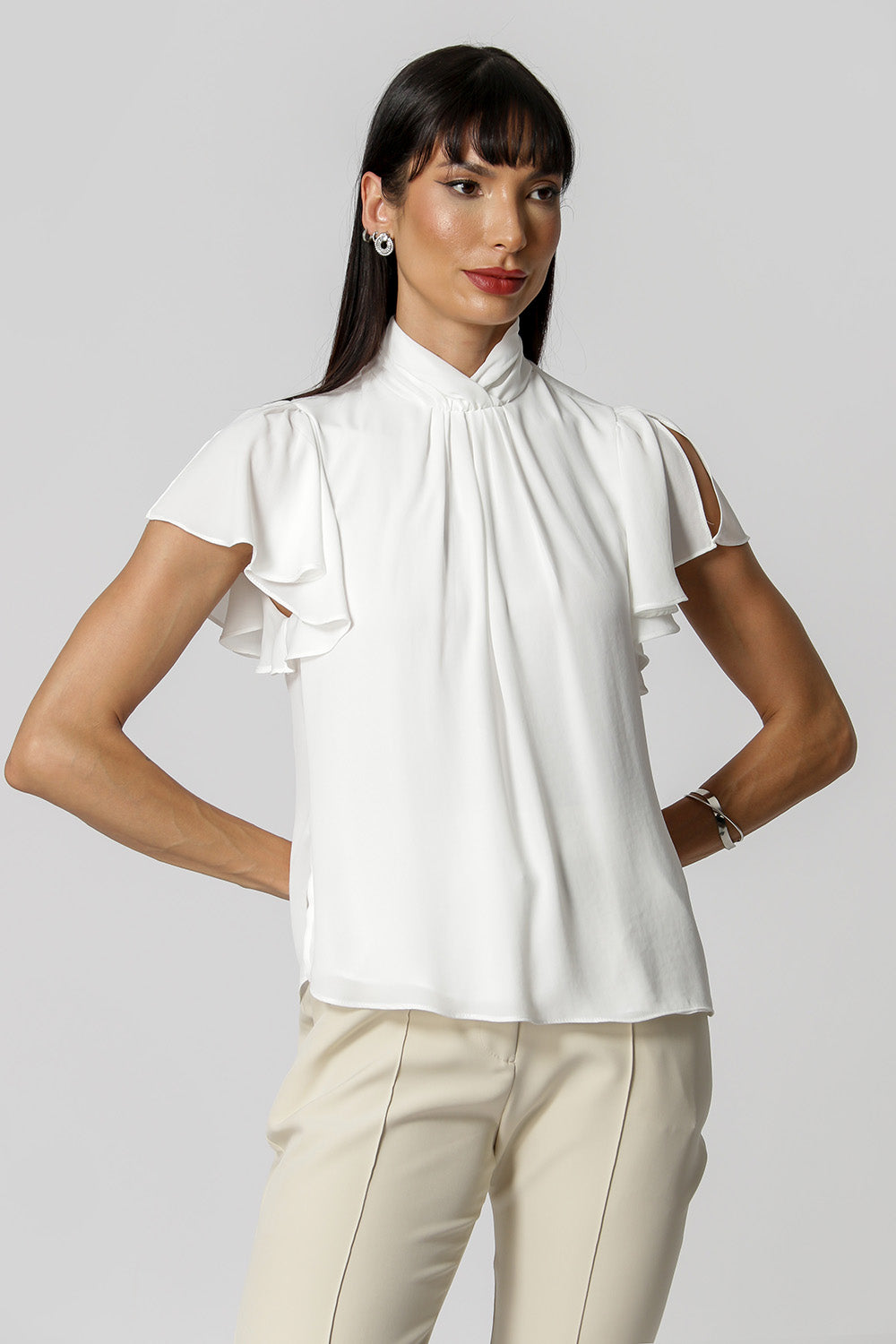 Blusa con pliegues en el cuello y detalle de botones en la espalda. Pieza confeccionada en tejido crepé fluido. Una prenda elegante y de corte holgado, perfecta para crear looks especiales en tu día a día.