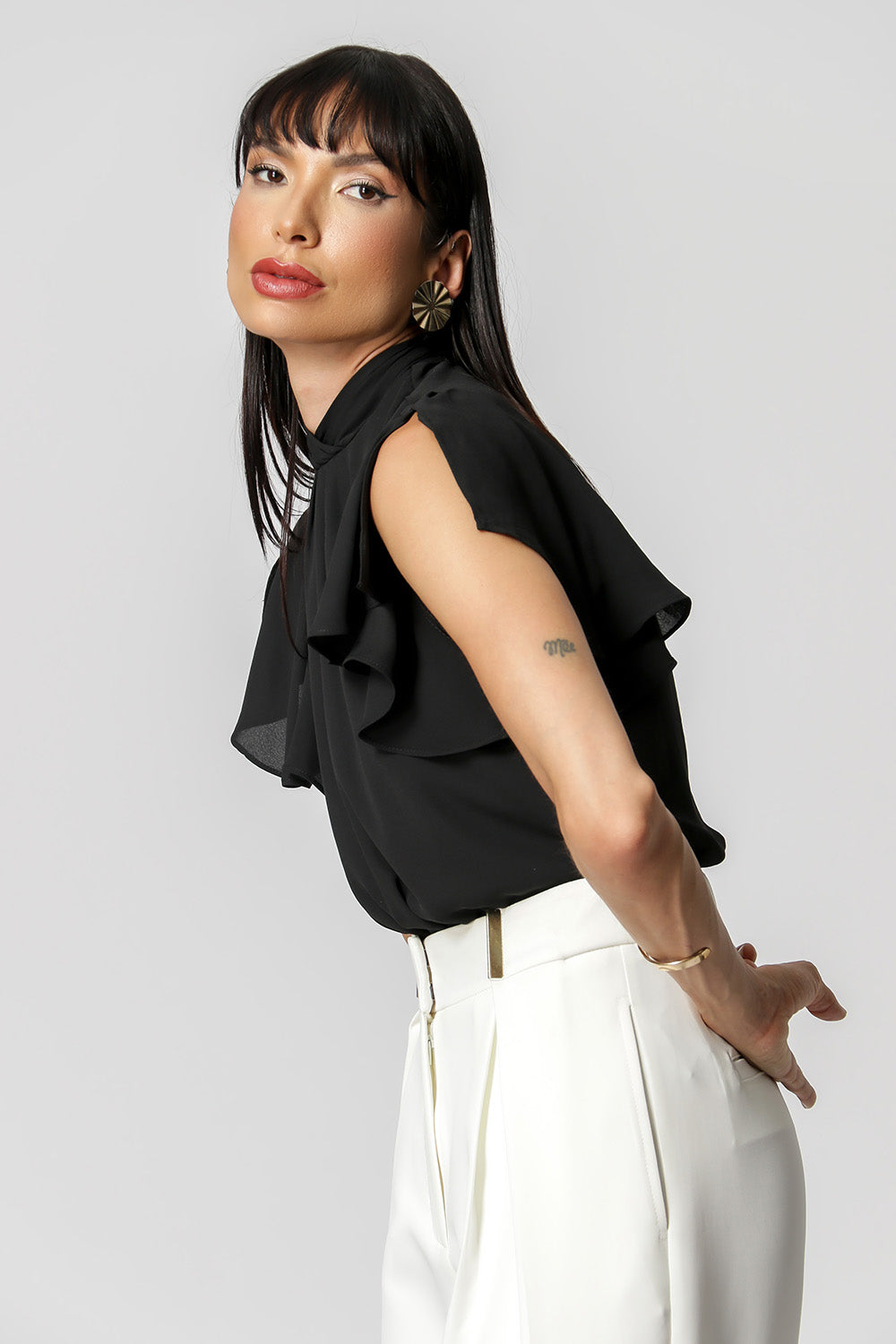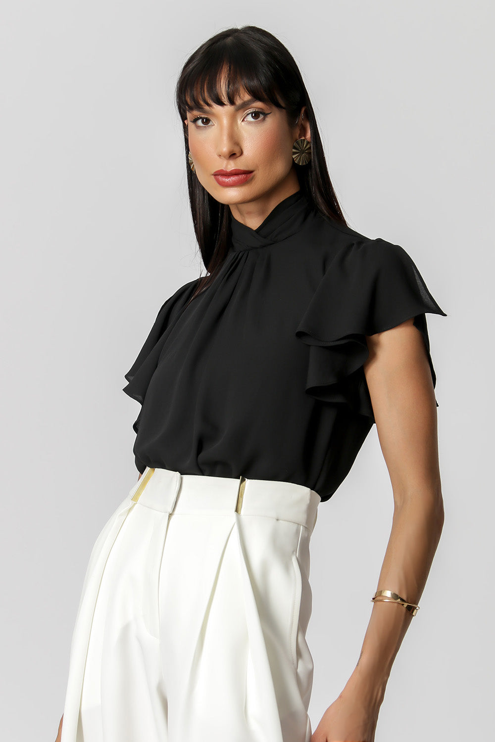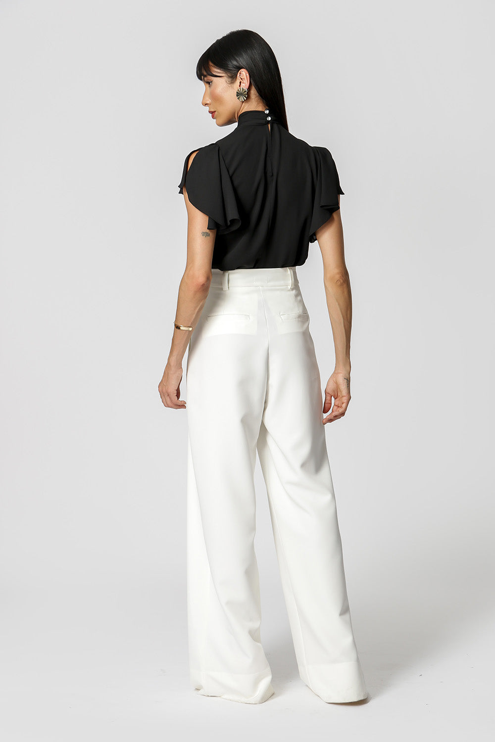 Blusa con pliegues en el cuello y detalle de botones en la espalda. Pieza confeccionada en tejido crepé fluido. Una prenda elegante y de corte holgado, perfecta para crear looks especiales en tu día a día.
