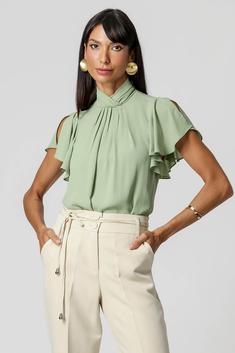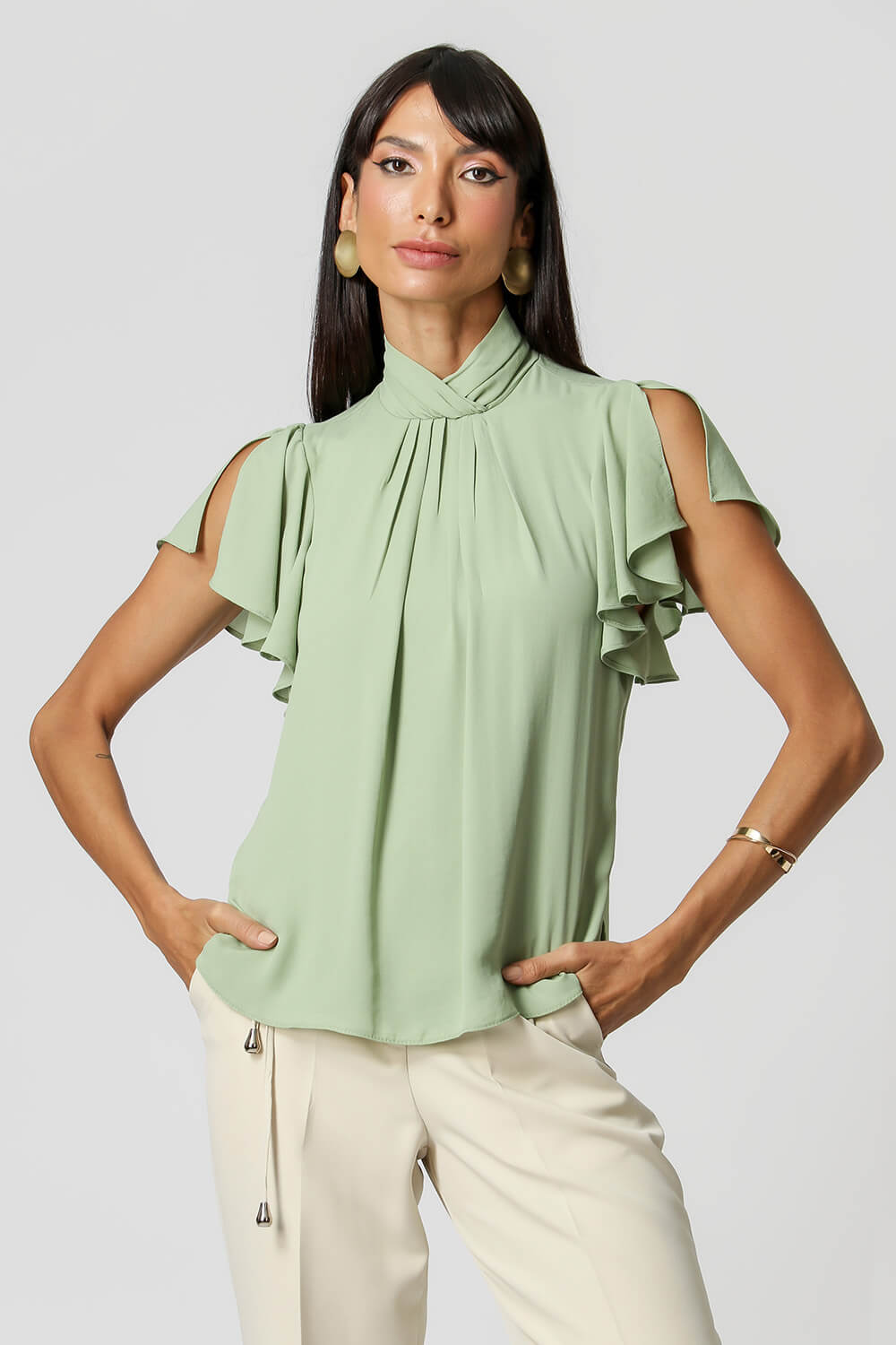 Blusa con pliegues en el cuello y detalle de botones en la espalda. Pieza confeccionada en tejido crepé fluido. Una prenda elegante y de corte holgado, perfecta para crear looks especiales en tu día a día.