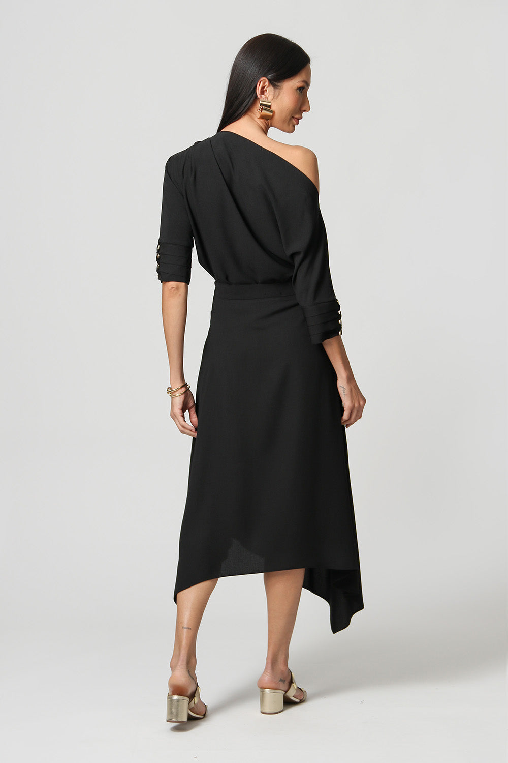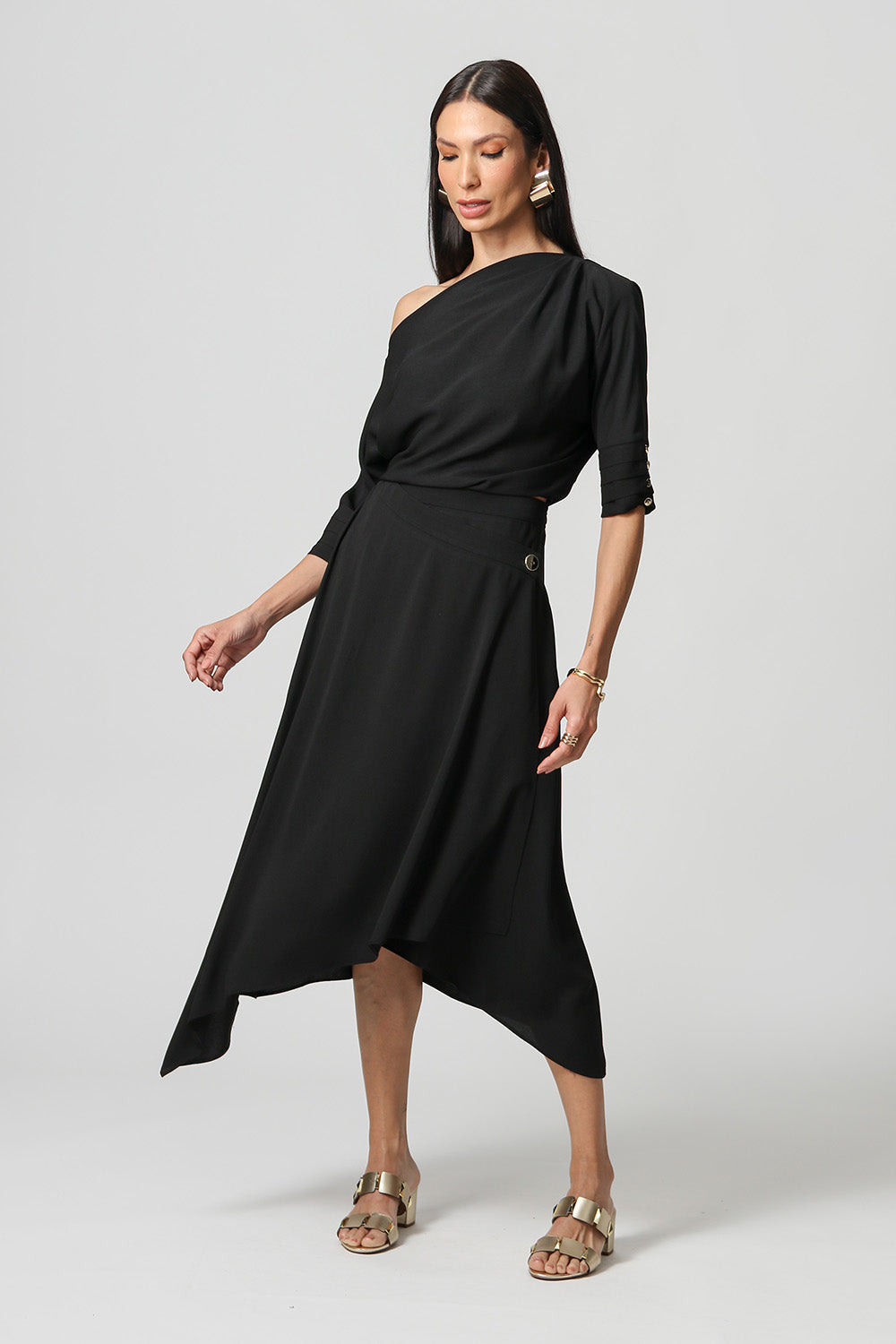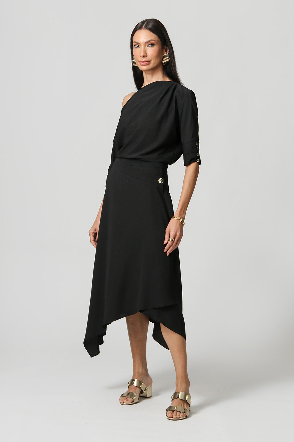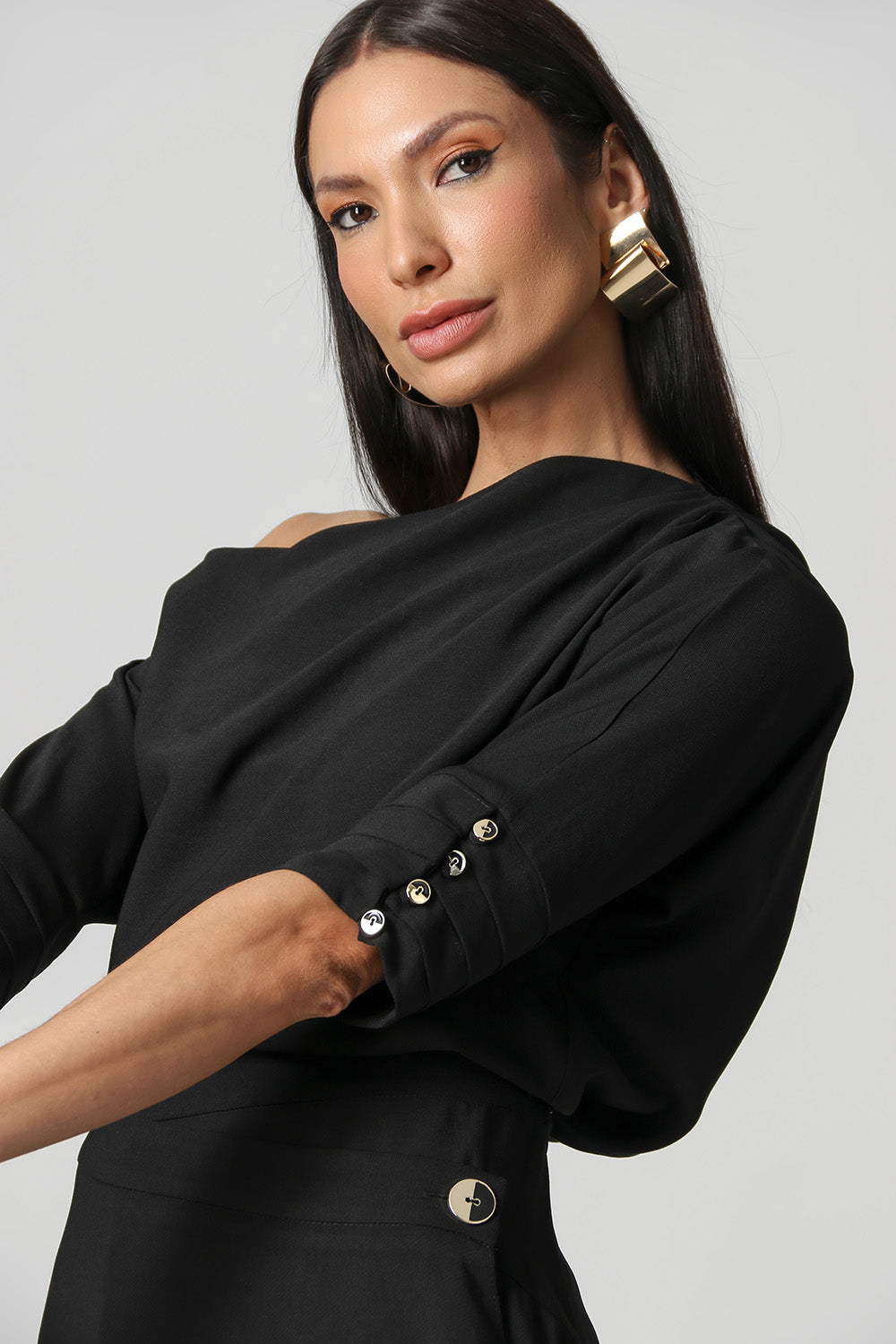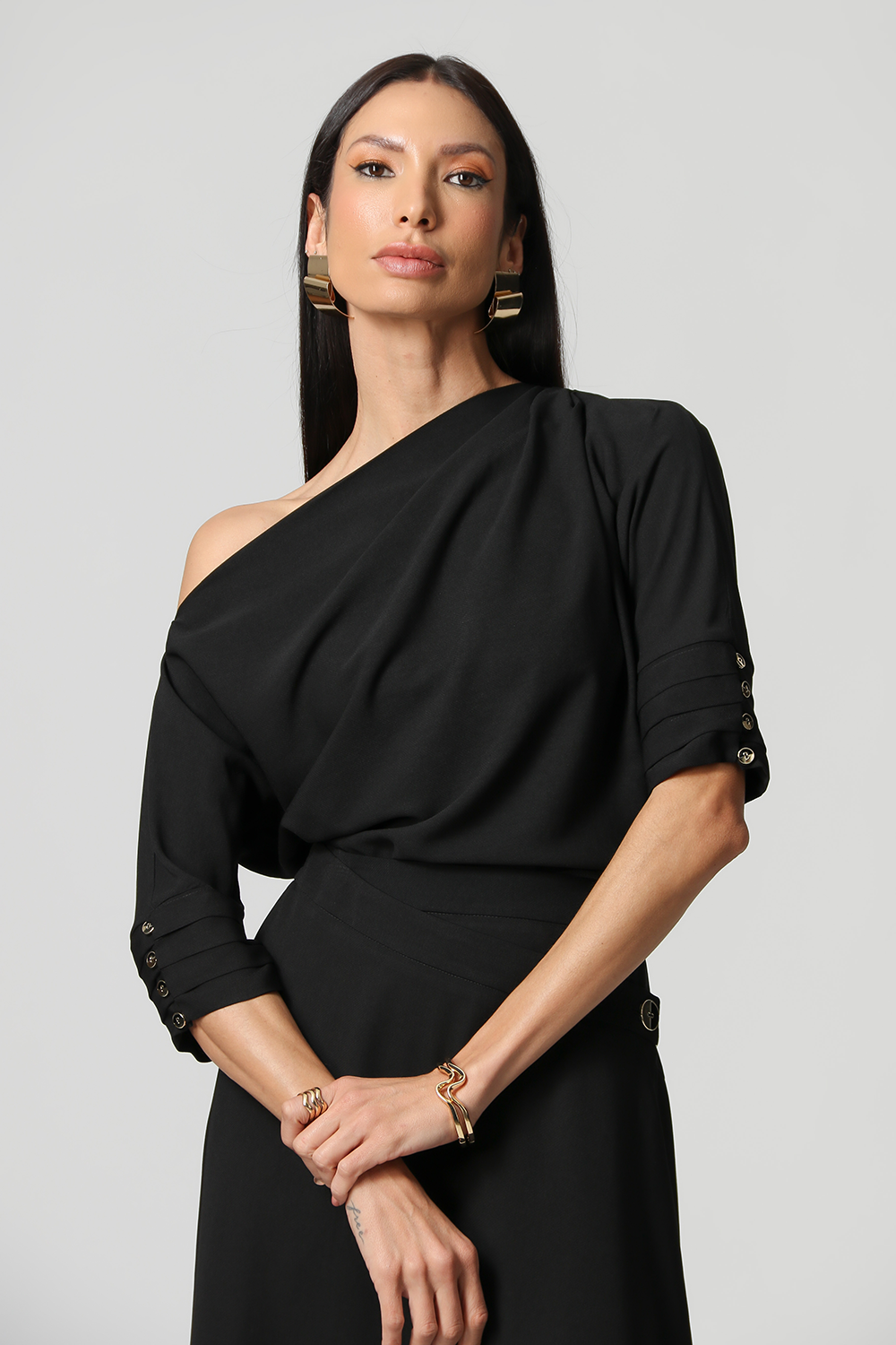 Blusa de corte casual, mangas murciélago y escote asimétrico, una pieza práctica y cómoda para un look casual.