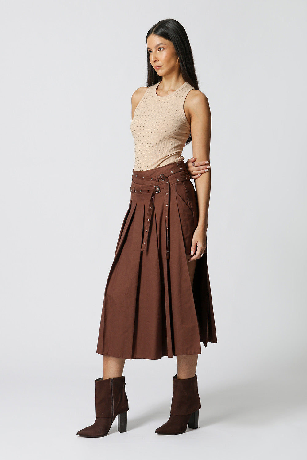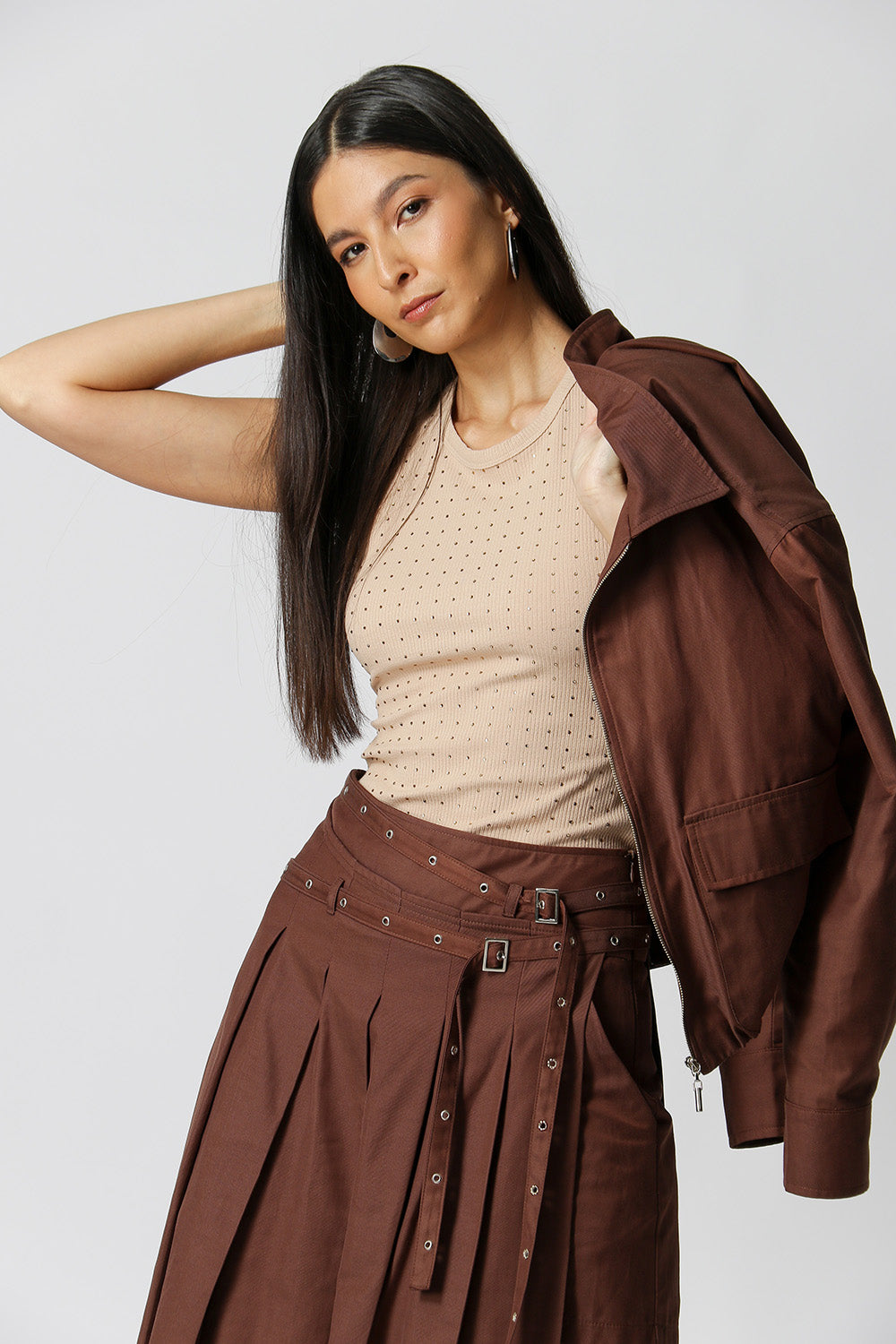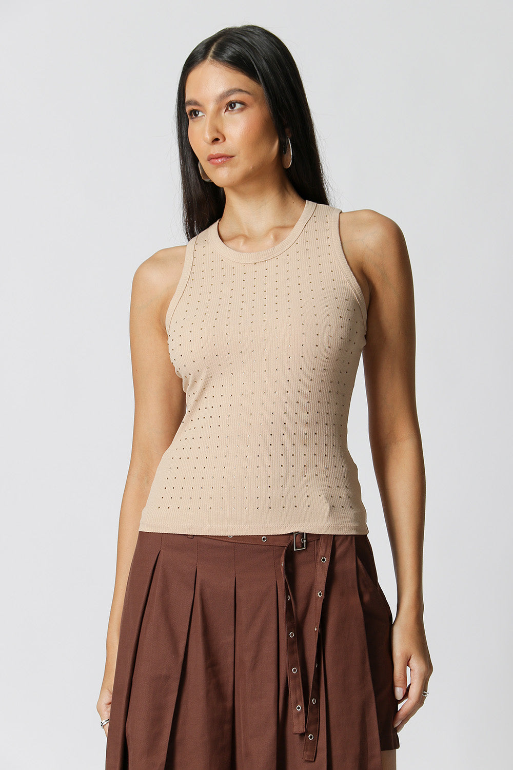 La blusa con pedrería aplicada, confeccionada en punto canalé fino, es una pieza elegante y con estilo para el día a día.