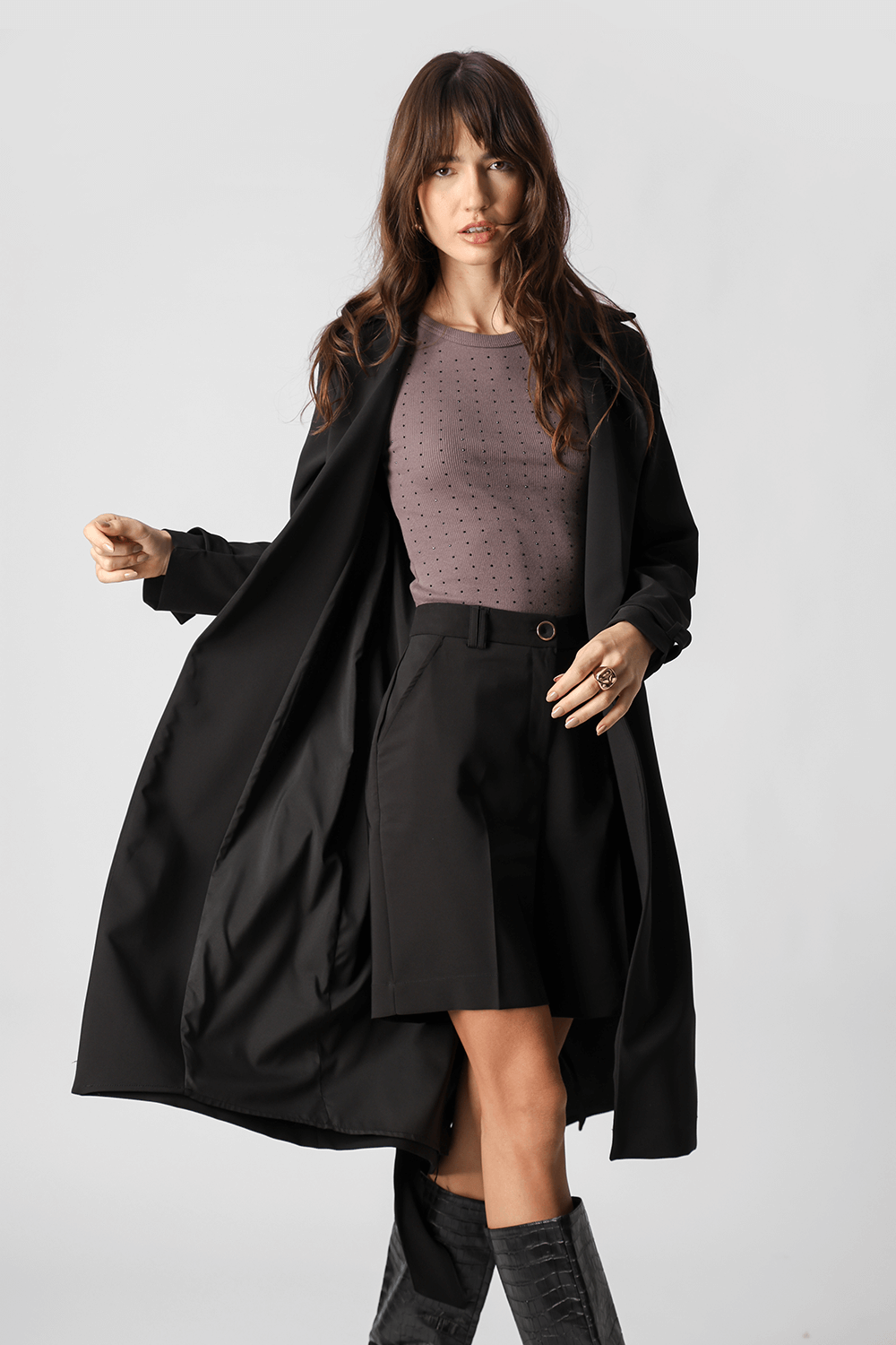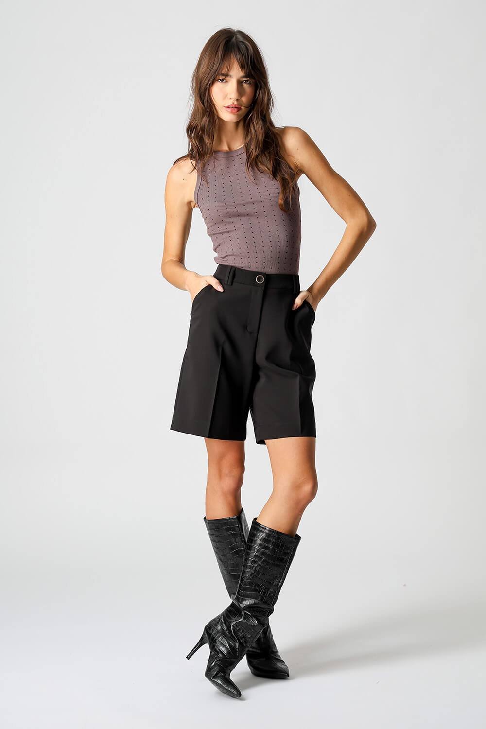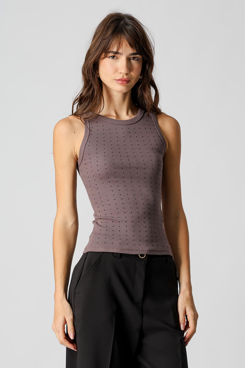 La blusa con pedrería aplicada, confeccionada en punto canalé fino, es una pieza elegante y con estilo para el día a día.