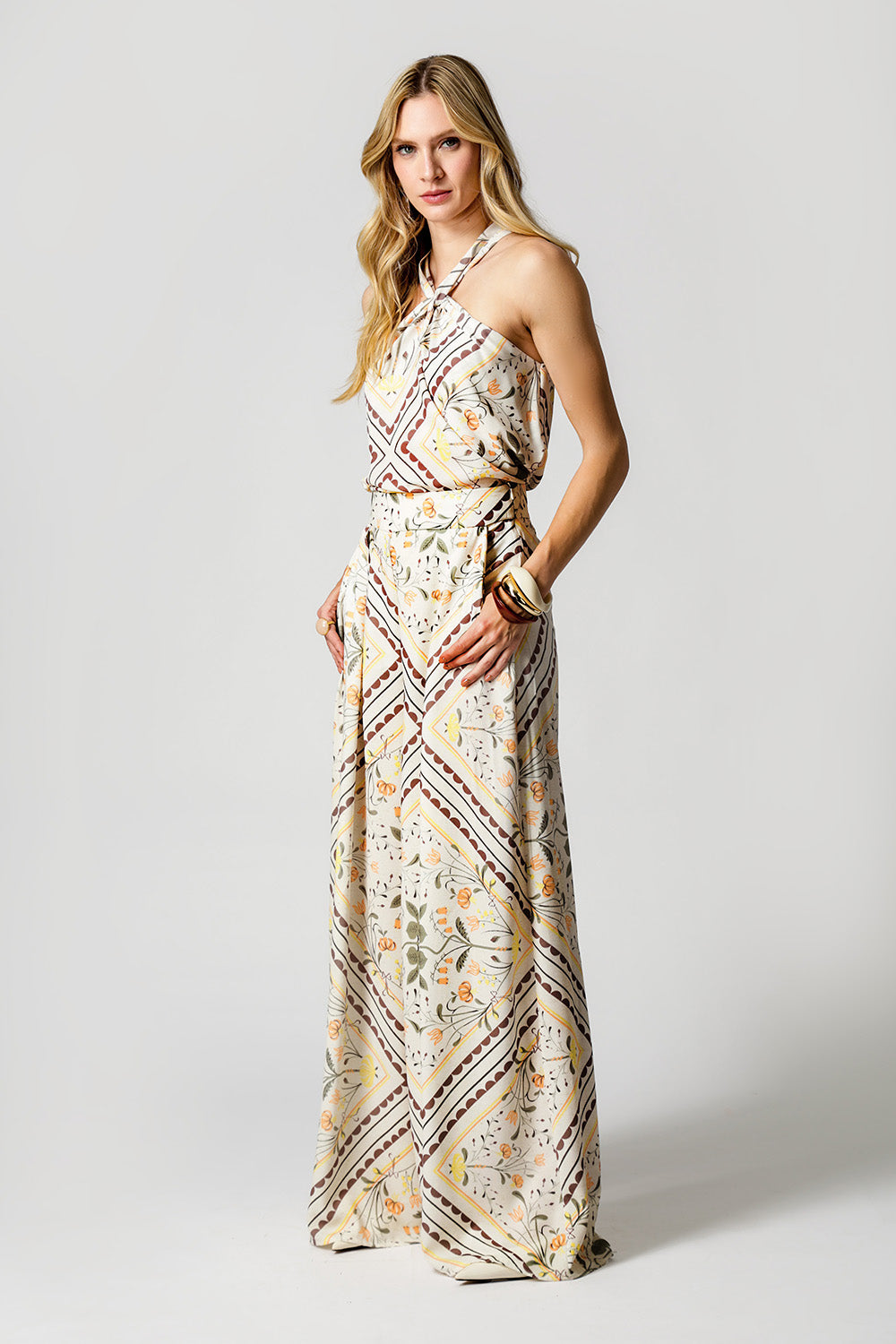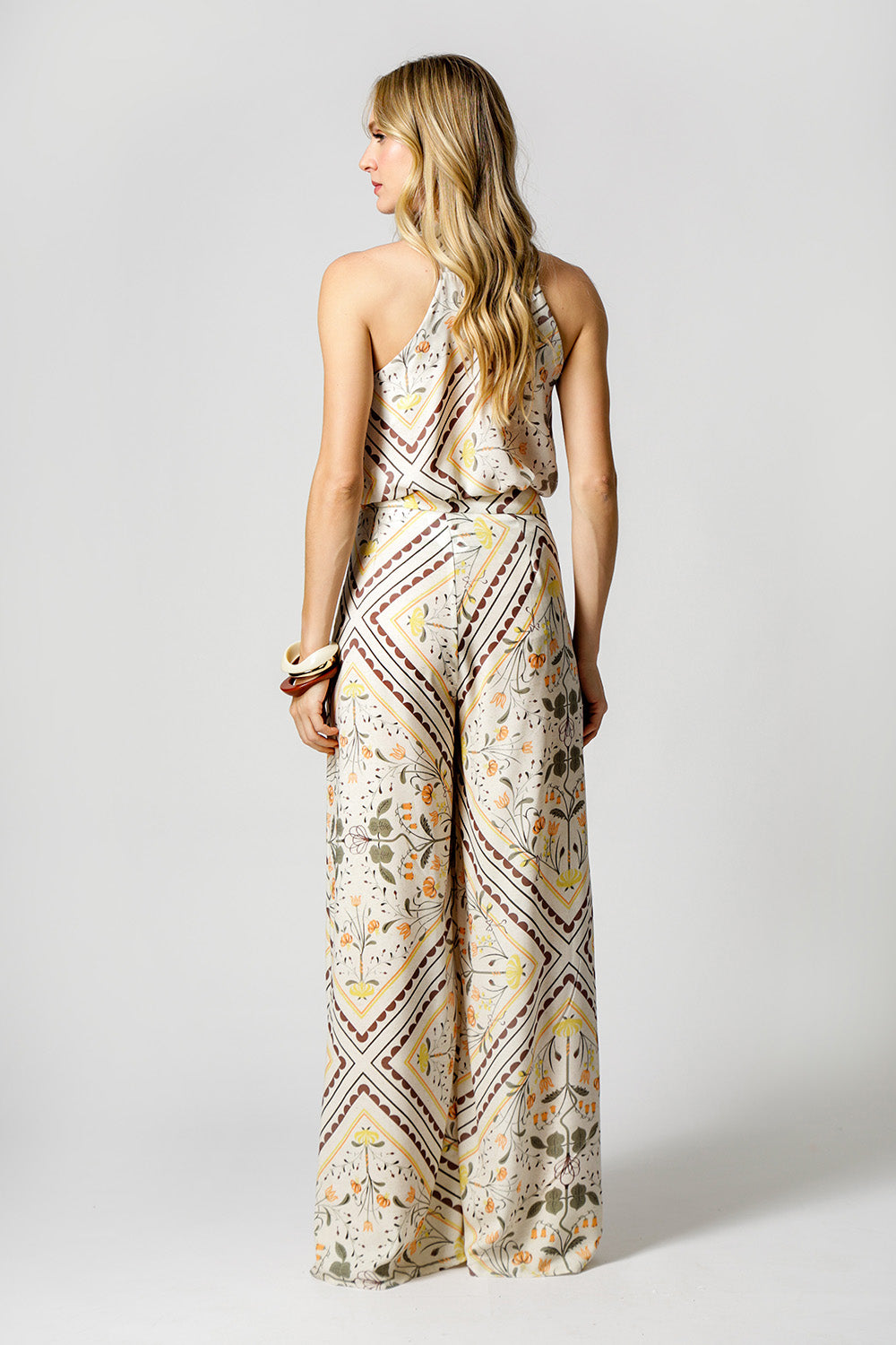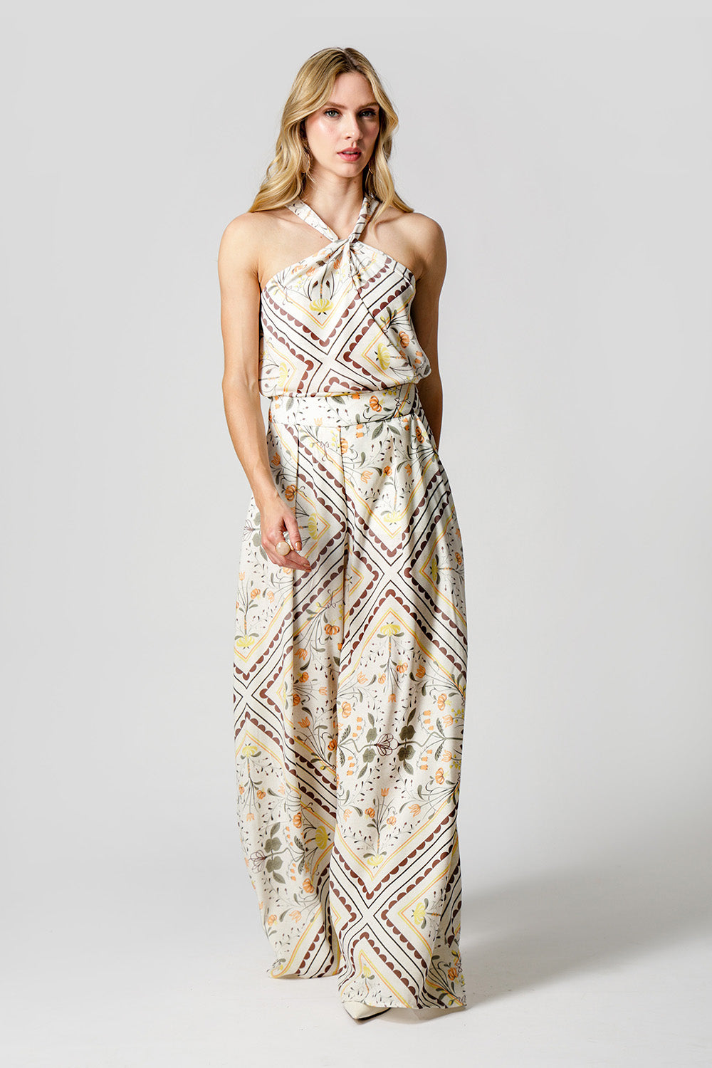 Blusa estampada com torção frontal. Confeccionada em tecido creponado.