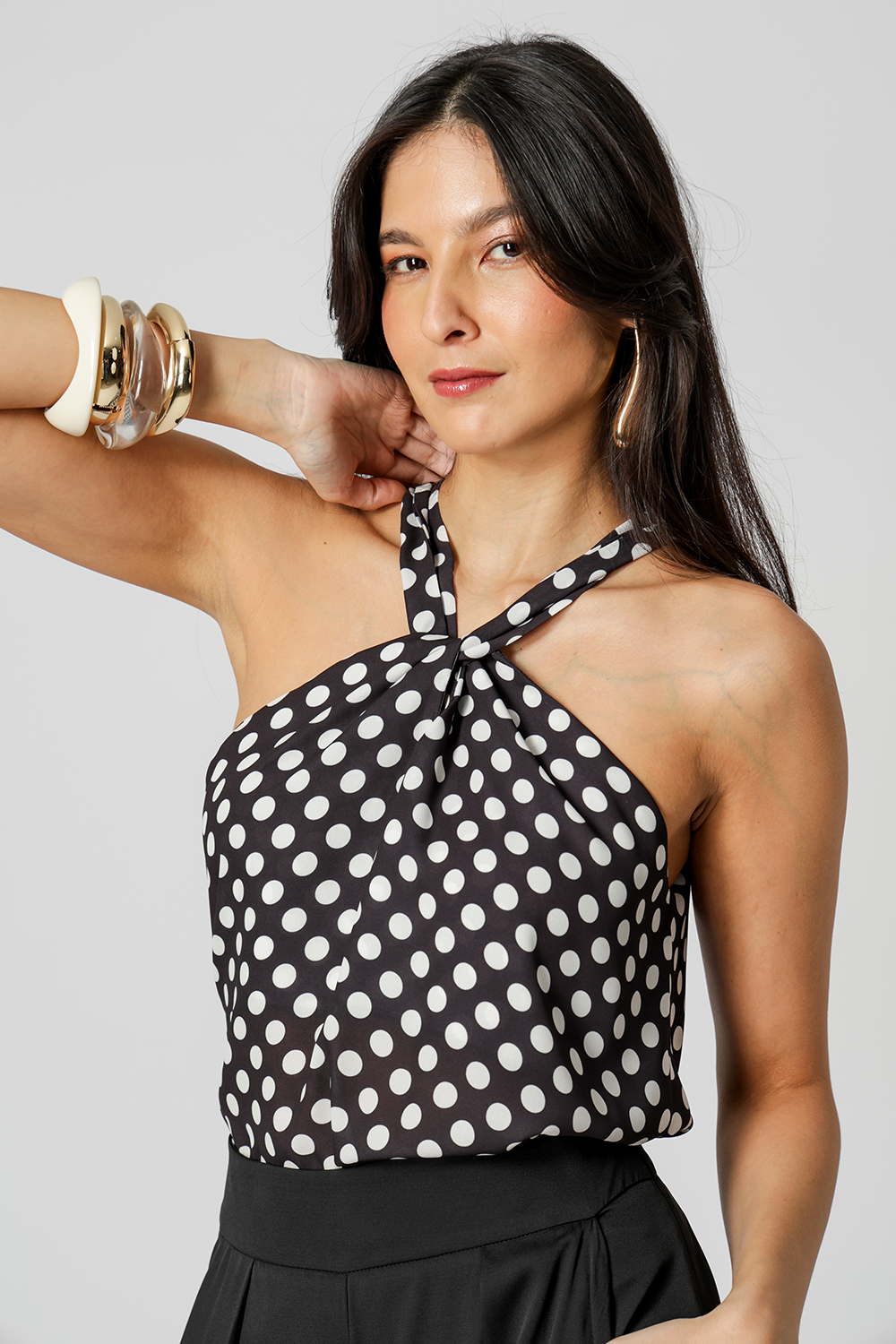Blusa estampada com torção frontal. Confeccionada em tecido creponado.
